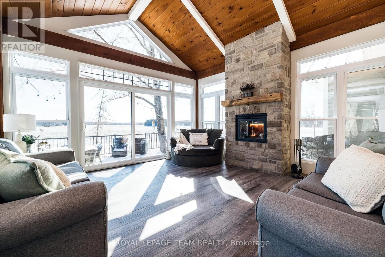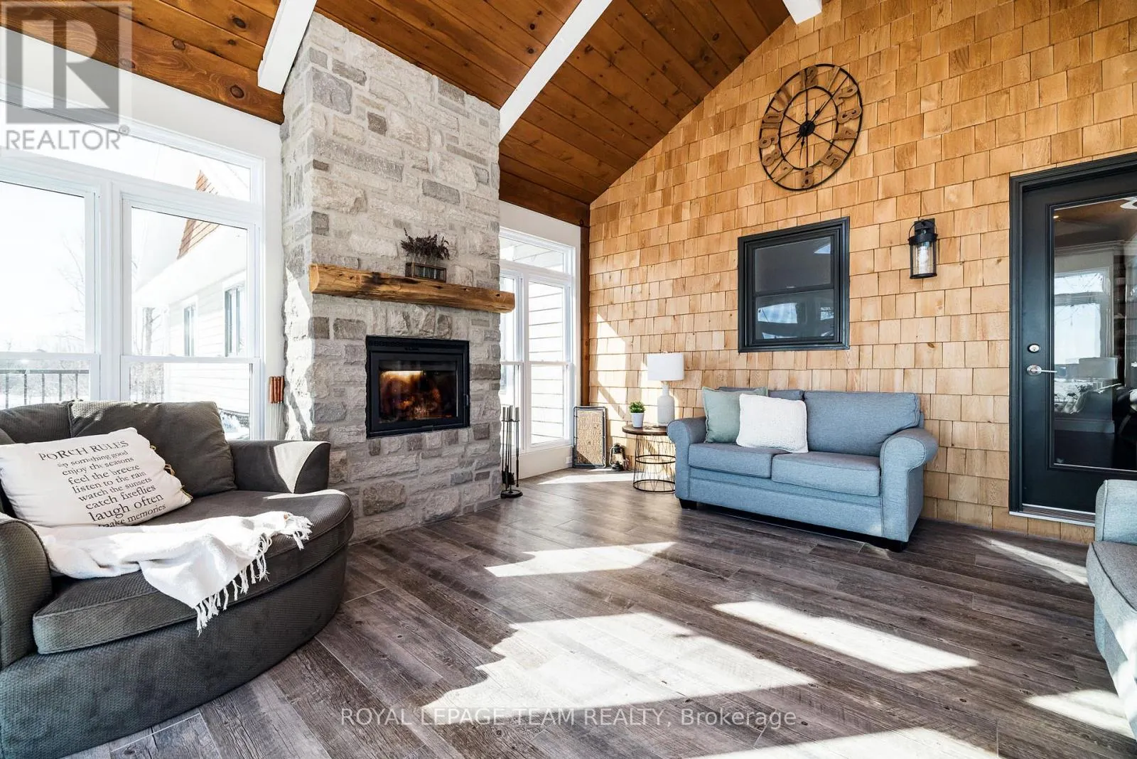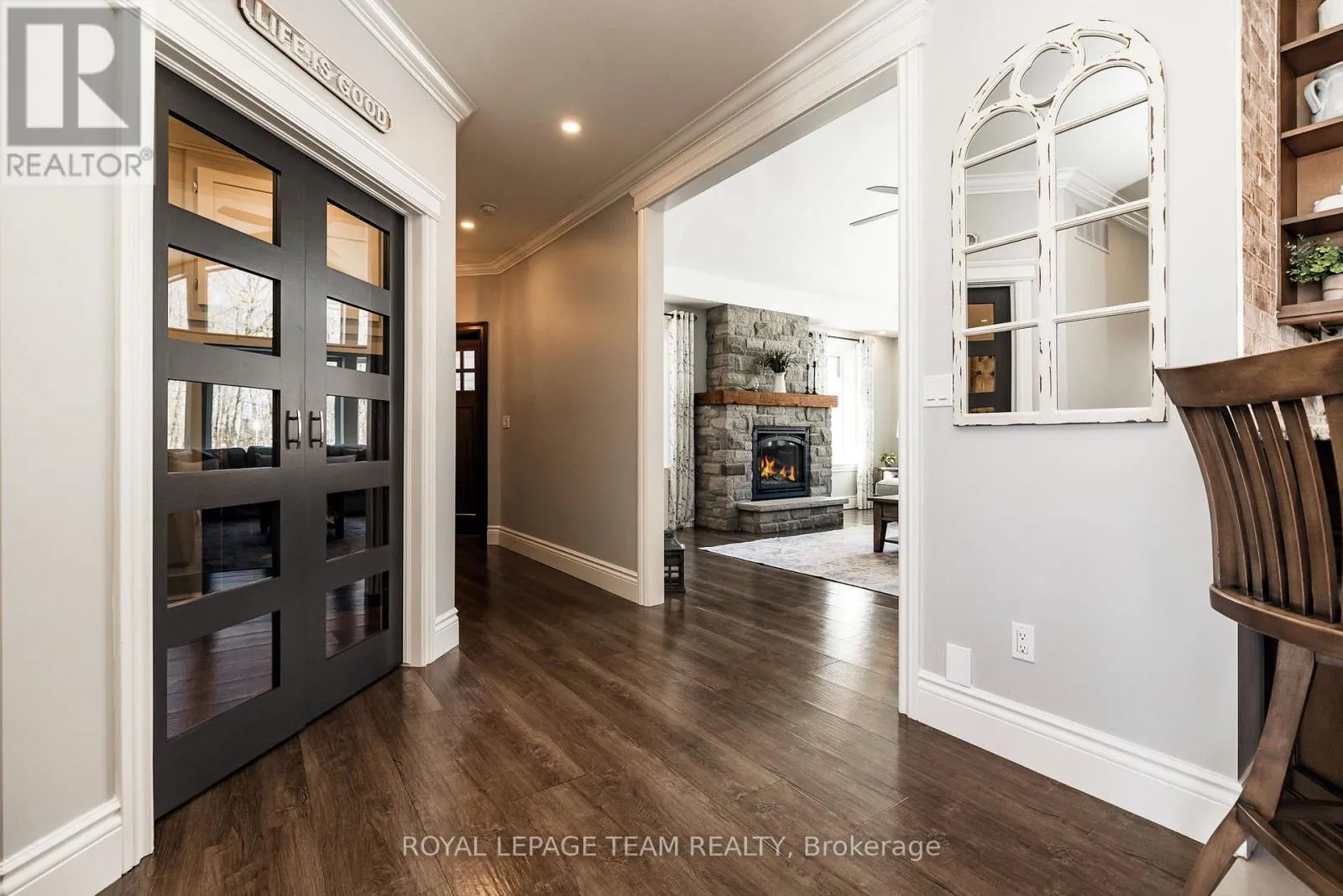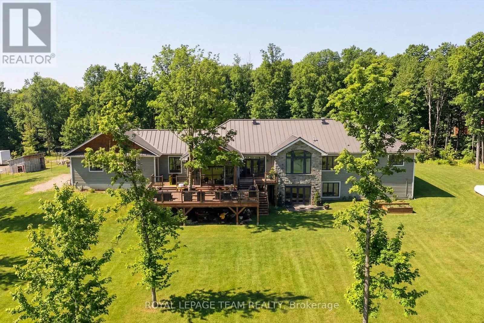 Take Hwy 7 to Lanark County Rd 17/Appleton Side Road exit.Turn left on Cemetery Side Road.Turn left on McCuan Road. Set on nearly 12 acres of breathtakingly private countryside, this extraordinary custom-built estate offers a rare blend of refined luxury & peaceful rural living. Surrounded by mature forest & farmland, the property offers privacy with no neighbours; creating a serene retreat within easy reach of city amenities. Inside over 3,300sf of beautifully finished living space above grade unfolds beneath soaring ceilings and oversized windows that flood the home with natural light. The elegant living room is anchored by a floor-to-ceiling stone fireplace, while extensive millwork, wainscotting, & designer lighting elevate every space. The gourmet kitchen is both sophisticated and functional, featuring s/s appliances, cabinetry, island & a bright dining area that opens onto the expansive rear deck-perfect for entertaining while enjoying sweeping country views. A stunning sunroom with a double-sided fireplace offers a cozy yet refined space to relax and seamlessly connects indoor & outdoor living. The luxurious primary retreat features vaulted ceilings, private deck access, & a spa-inspired ensuite; complete with a double shower, soaker tub overlooking the countryside, & walk-in closet. Four additional bedrooms & an oversized laundry room with dual washer and dryer sets provide exceptional functionality. The fully finished walk-out lower level with radiant in-floor heating offers versatility, featuring 3 bedrooms, a full bathroom, & expansive recreation areas, ideal for extended family or multi-generational living. Built with ICF construction & a timeless heritage-style metal roof, this bungalow showcases superior craftsmanship, efficiency, & lasting quality. A large insulated outbuilding offers endless possibilities with hydro service, propane heating, & infrastructure for future radiant heat. The grounds also feat a goat barn with electricity, fenced animal areas, extensive landscaping, a large two-tier deck, & a substantial concrete pad ideal for sports or recreation. (id:27476)