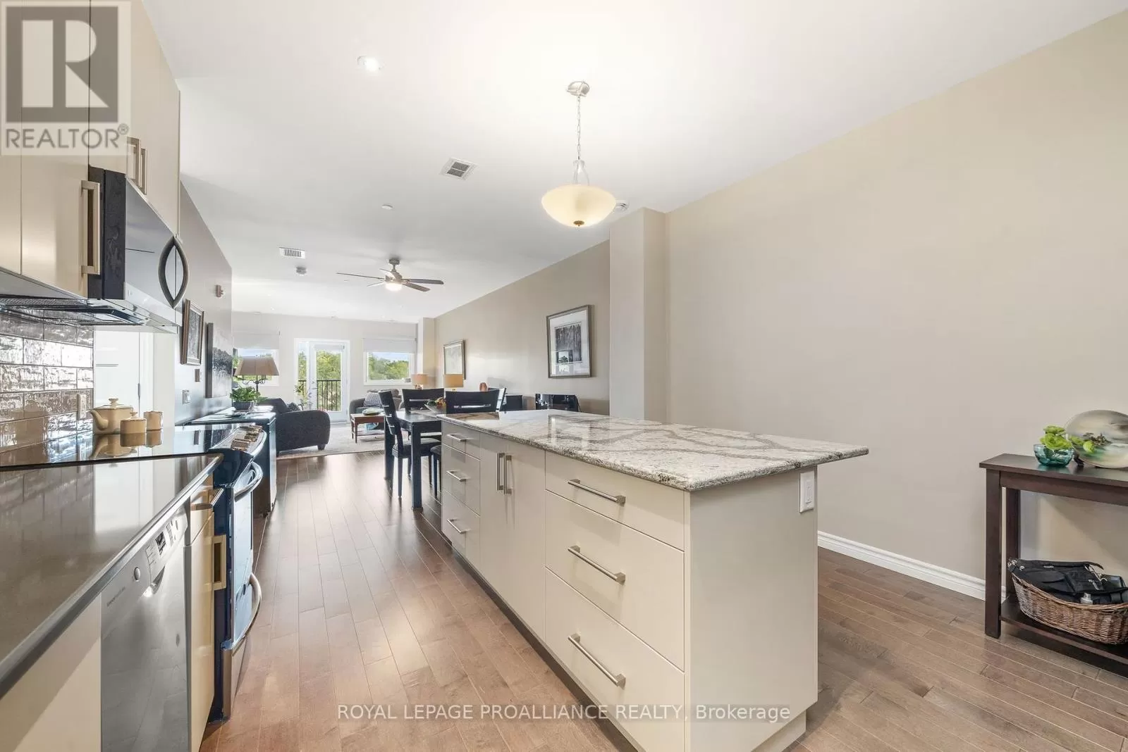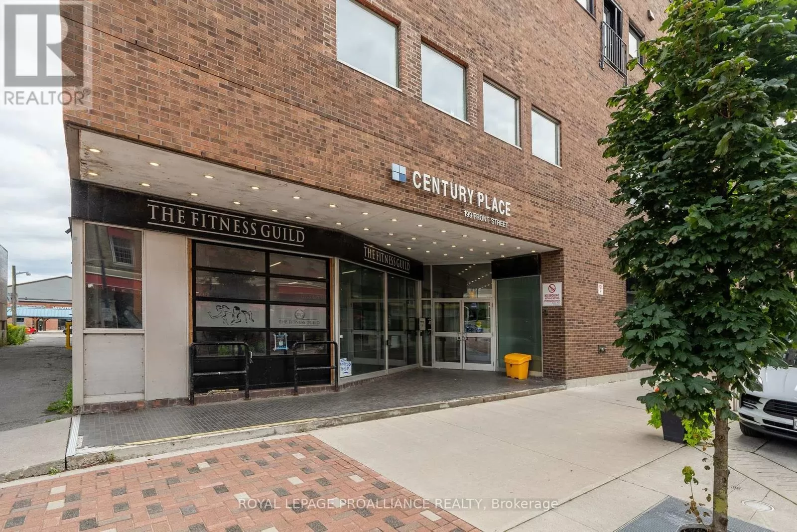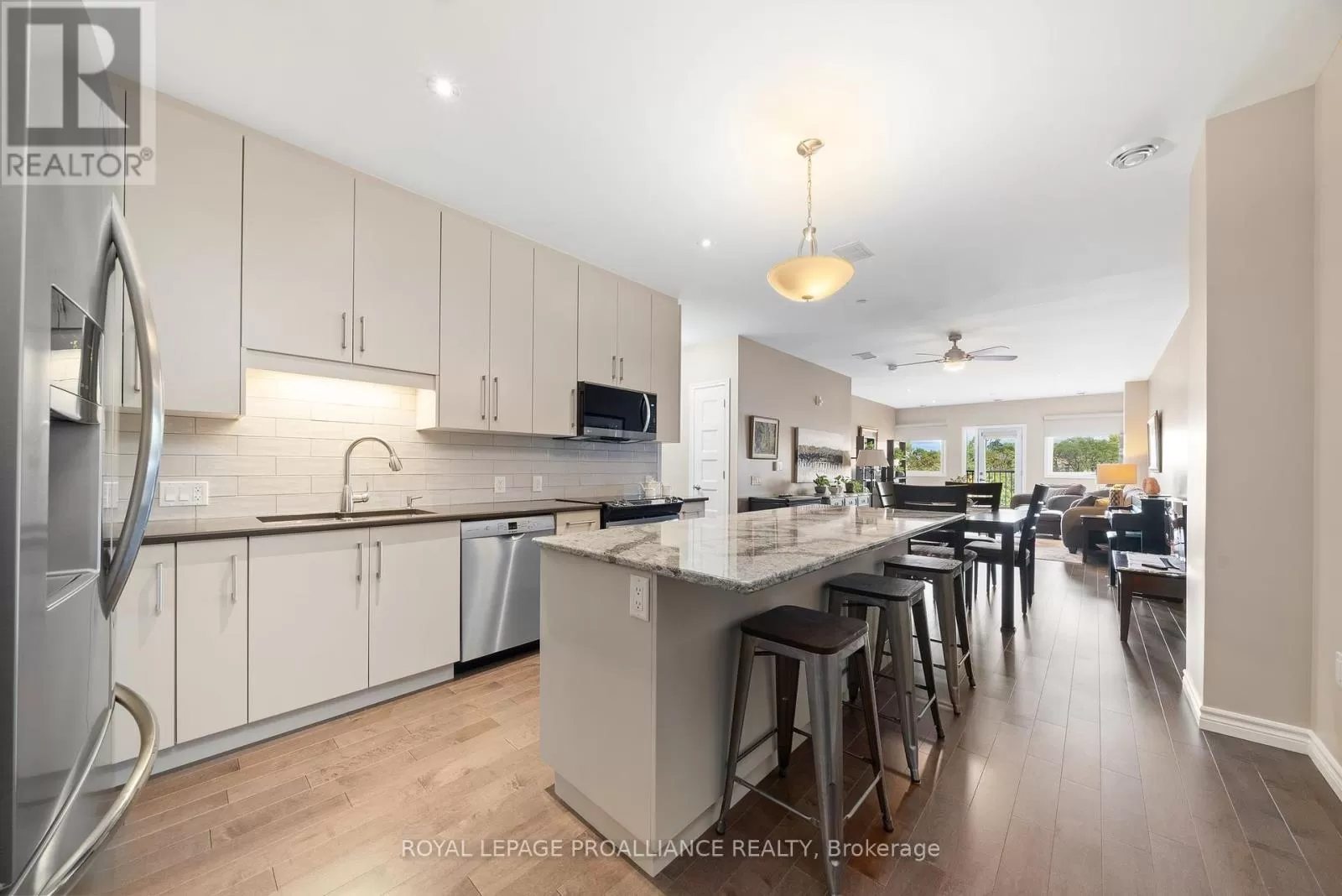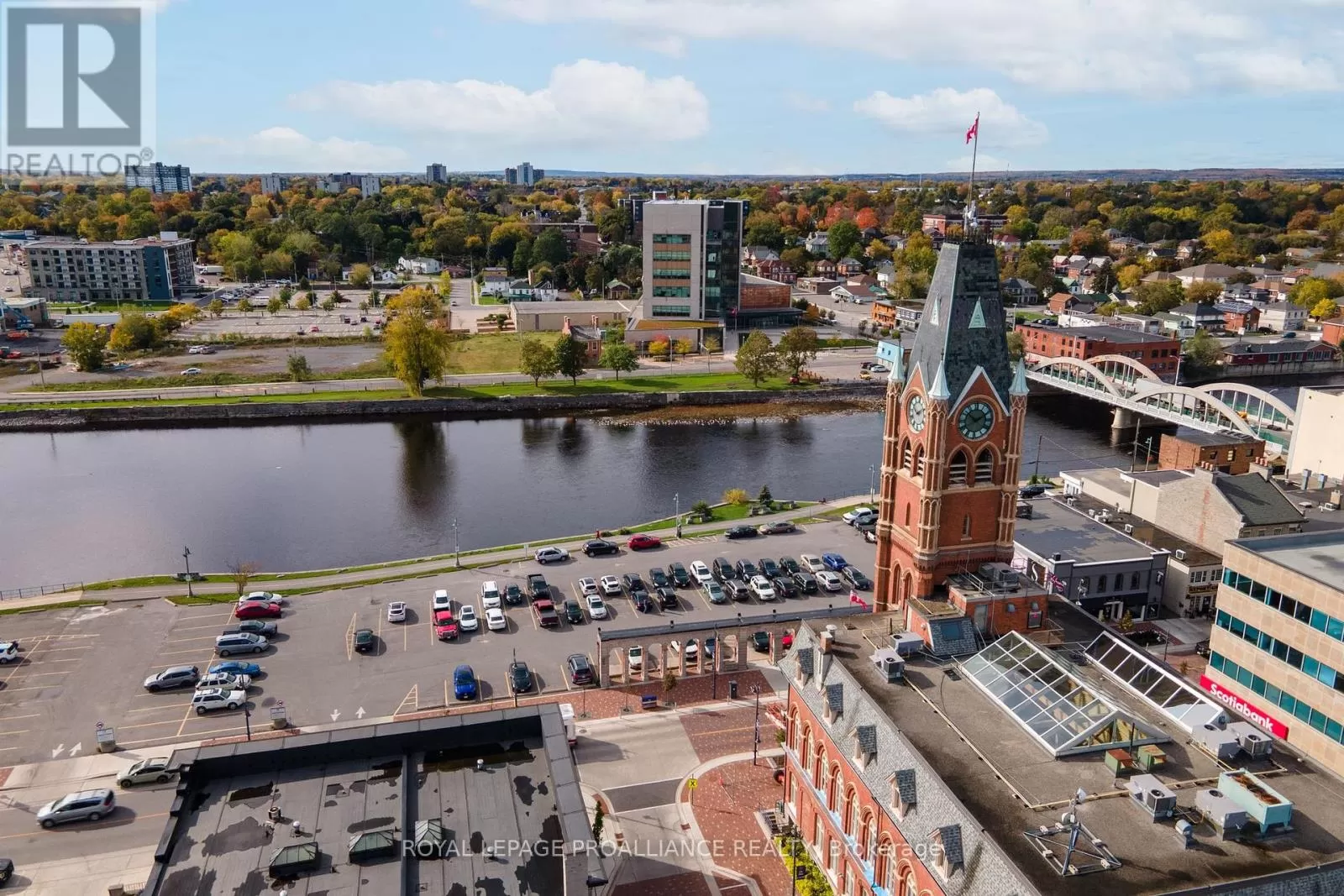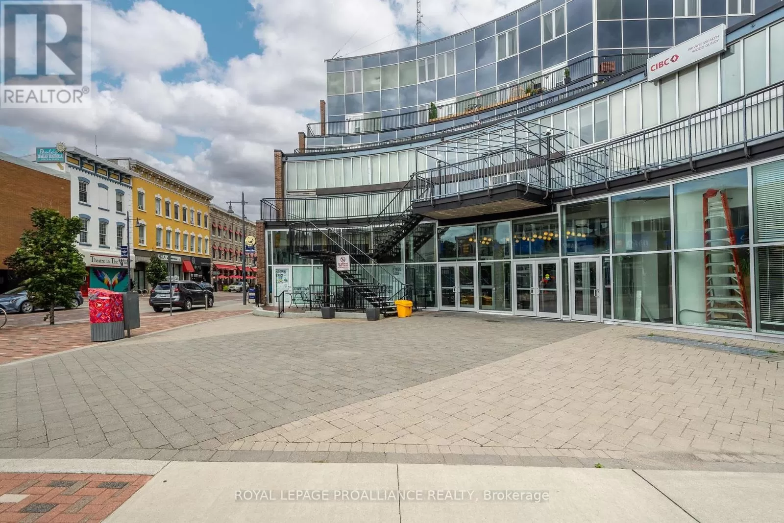 Bridge Street / Front Street Welcome to the epitome of urban luxury at Century Place! Located in the vibrant heart of Belleville. This exceptional fourth-floor condo is an oasis of style and convenience, offering an unparalleled living experience just steps away from the city's finest restaurants, chic boutiques, bustling farmer's market and new memorial arena renovation providing new shops. Upon entering this meticulously maintained residence, you're greeted by an open-concept living area that seamlessly combines elegance and functionality. The unit features one bedroom plus a den, including a serene master suite with a lavish on-suite. The heart of the home is the stunning kitchen, outfitted with sleek cabinetry, a substantial island, and luxurious quartz surfaces. The adjoining living and dining spaces are bathed in natural light, thanks to expansive panoramic windows offering breathtaking views of the Marketplace and Belleville Armories. The unit also includes convenient in-suite laundry. Century Place enhances your lifestyle with an array of exclusive amenities. Enjoy the vibrant rooftop deck with its gas BBQ and stunning city views, or host gatherings in the well-appointed common room with a full kitchen and entertaining spaces. The building also boasts secure access, a private fitness center, and a charming cafe and wine bar on the lower levels. With its prime location, luxurious features, and exceptional amenities, this condo at Century Place is perfect for executive couples, retirees, or anyone seeking a sophisticated and carefree urban lifestyle. **EXTRAS** 1112 SQ FT (38 units total on 3rd,4th, and 5th floor of Century Village) Water Incl. in maintenance fees. Avg. Hydro incl. Heat $85/month. Elevators, Heated underground parking. All fixtures upgraded, New Bosch dishwasher, quartz counters (id:27476)