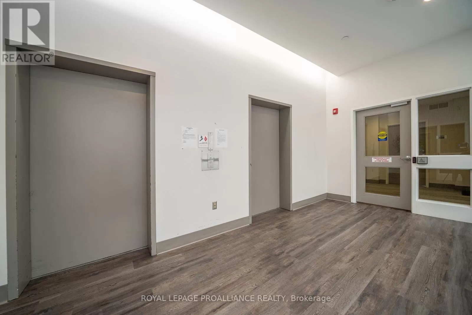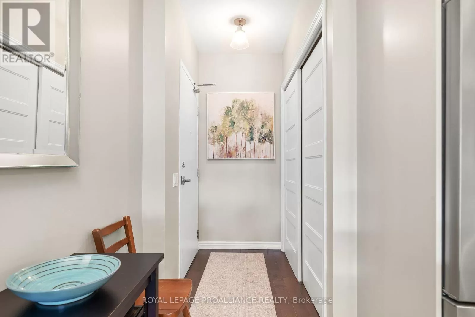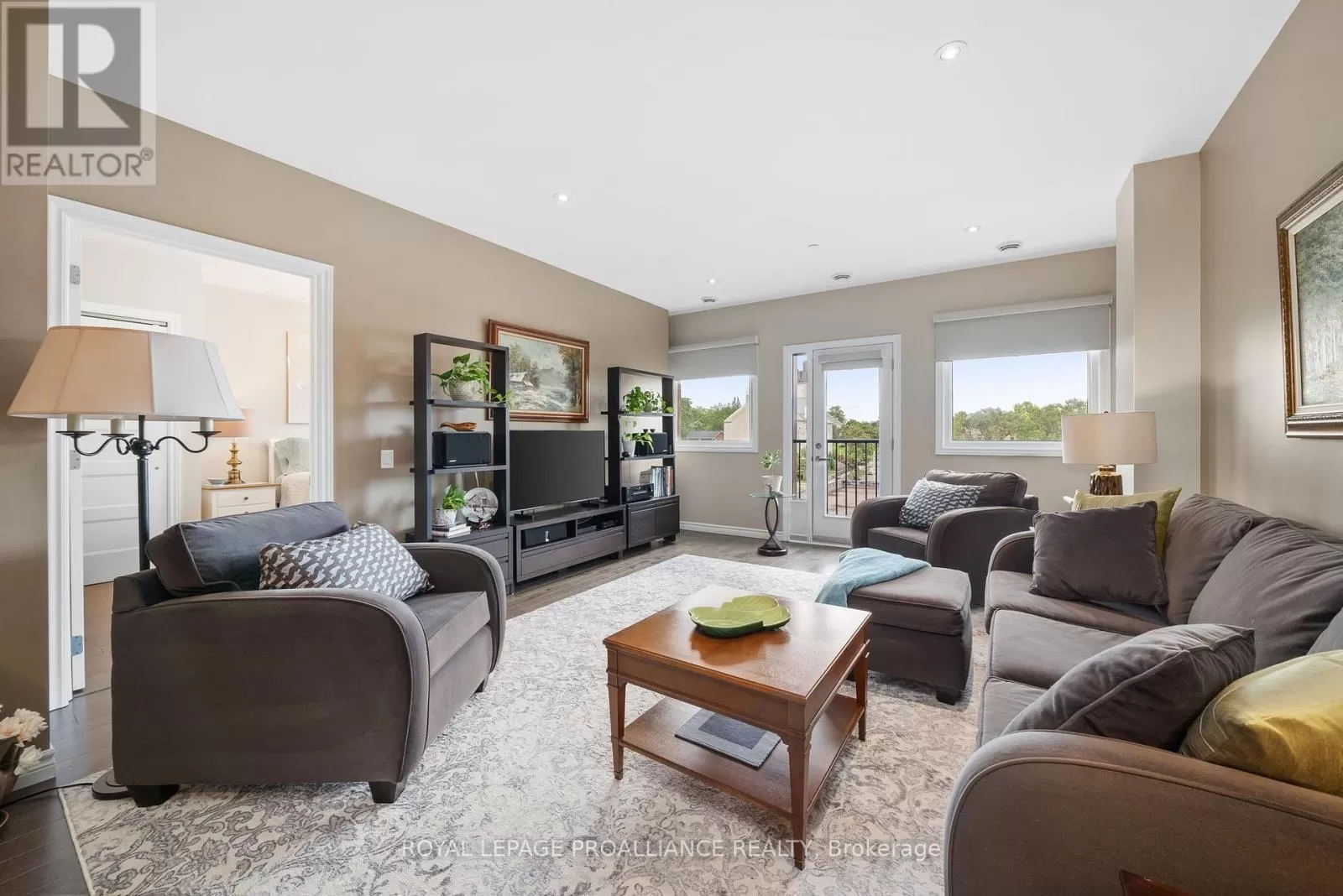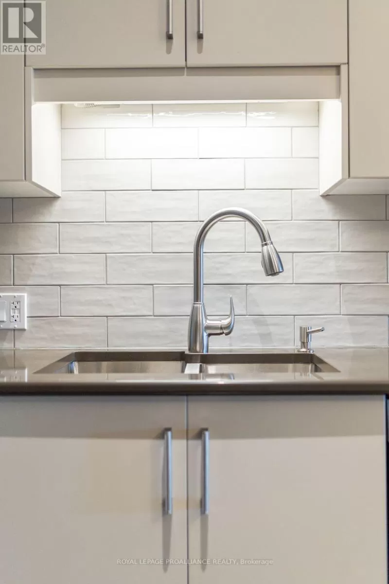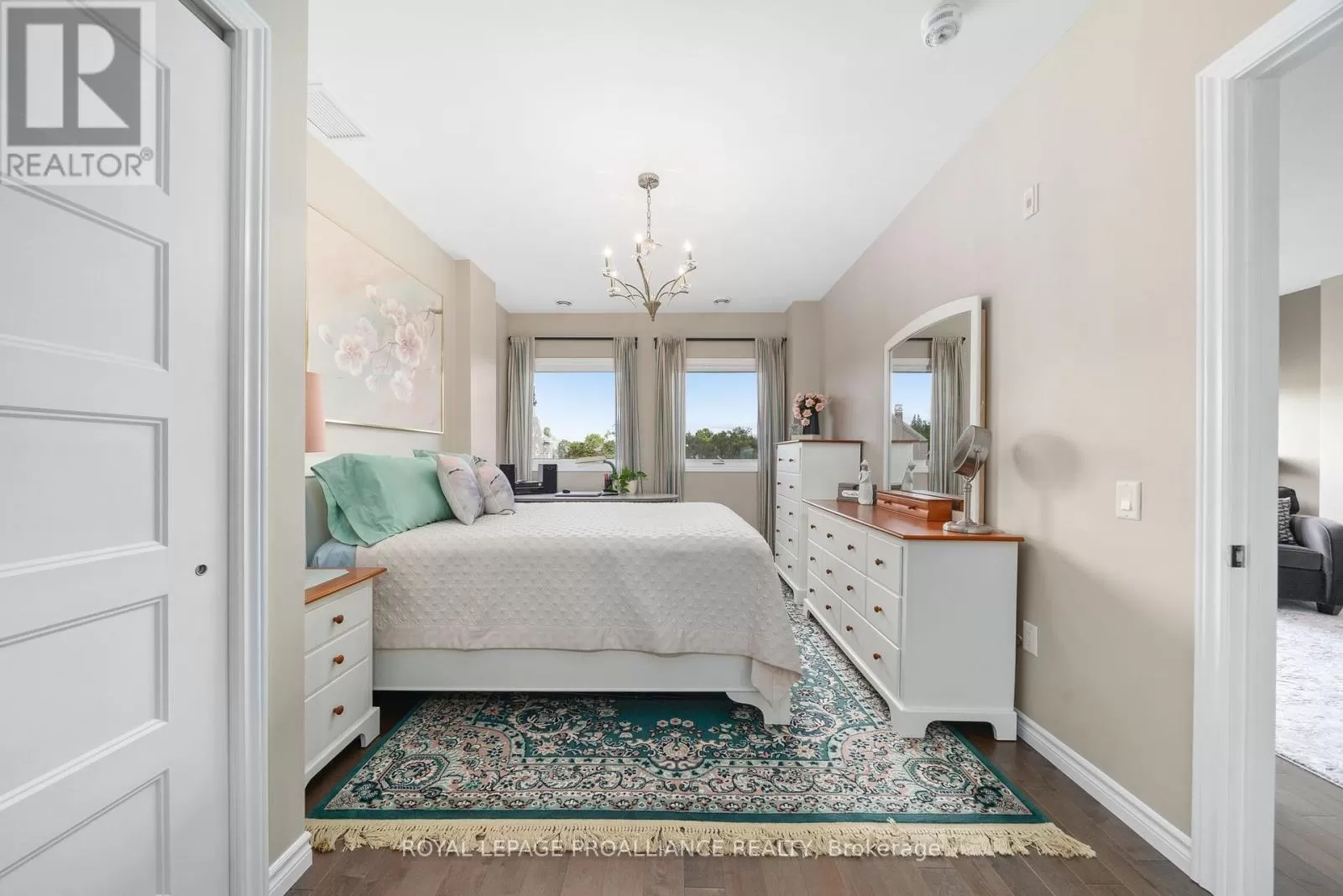 Bridge Street / Front Street Welcome to the epitome of urban luxury at Century Place! Located in the vibrant heart of Belleville. This exceptional fourth-floor condo is an oasis of style and convenience, offering an unparalleled living experience just steps away from the city's finest restaurants, chic boutiques, bustling farmer's market and new memorial arena renovation providing new shops. Upon entering this meticulously maintained residence, you're greeted by an open-concept living area that seamlessly combines elegance and functionality. The unit features one bedroom plus a den, including a serene master suite with a lavish on-suite. The heart of the home is the stunning kitchen, outfitted with sleek cabinetry, a substantial island, and luxurious quartz surfaces. The adjoining living and dining spaces are bathed in natural light, thanks to expansive panoramic windows offering breathtaking views of the Marketplace and Belleville Armories. The unit also includes convenient in-suite laundry. Century Place enhances your lifestyle with an array of exclusive amenities. Enjoy the vibrant rooftop deck with its gas BBQ and stunning city views, or host gatherings in the well-appointed common room with a full kitchen and entertaining spaces. The building also boasts secure access, a private fitness center, and a charming cafe and wine bar on the lower levels. With its prime location, luxurious features, and exceptional amenities, this condo at Century Place is perfect for executive couples, retirees, or anyone seeking a sophisticated and carefree urban lifestyle. **EXTRAS** 1112 SQ FT (38 units total on 3rd,4th, and 5th floor of Century Village) Water Incl. in maintenance fees. Avg. Hydro incl. Heat $85/month. Elevators, Heated underground parking. All fixtures upgraded, New Bosch dishwasher, quartz counters (id:27476)