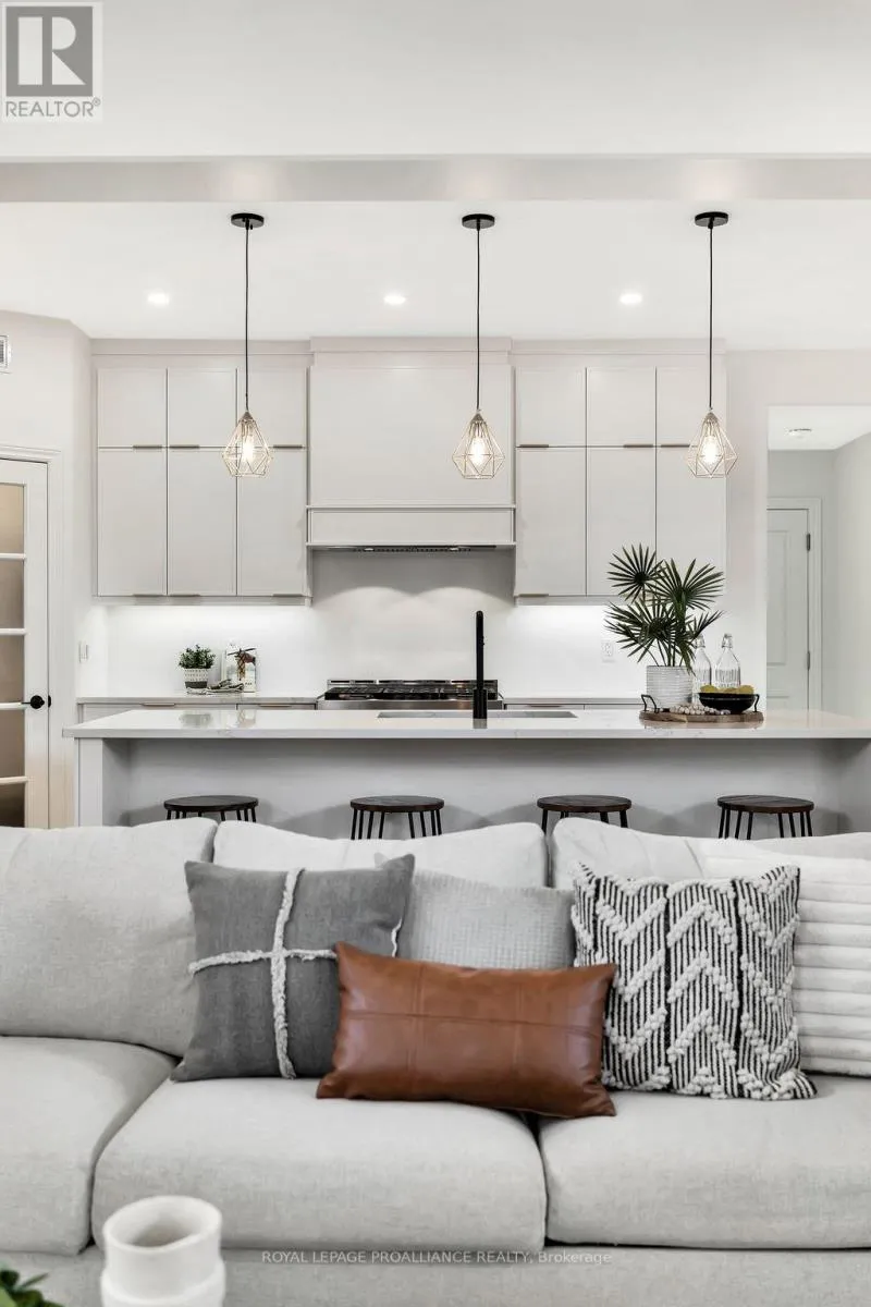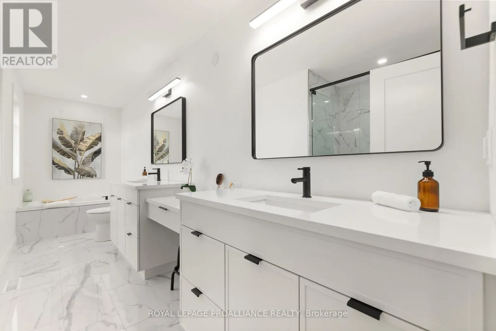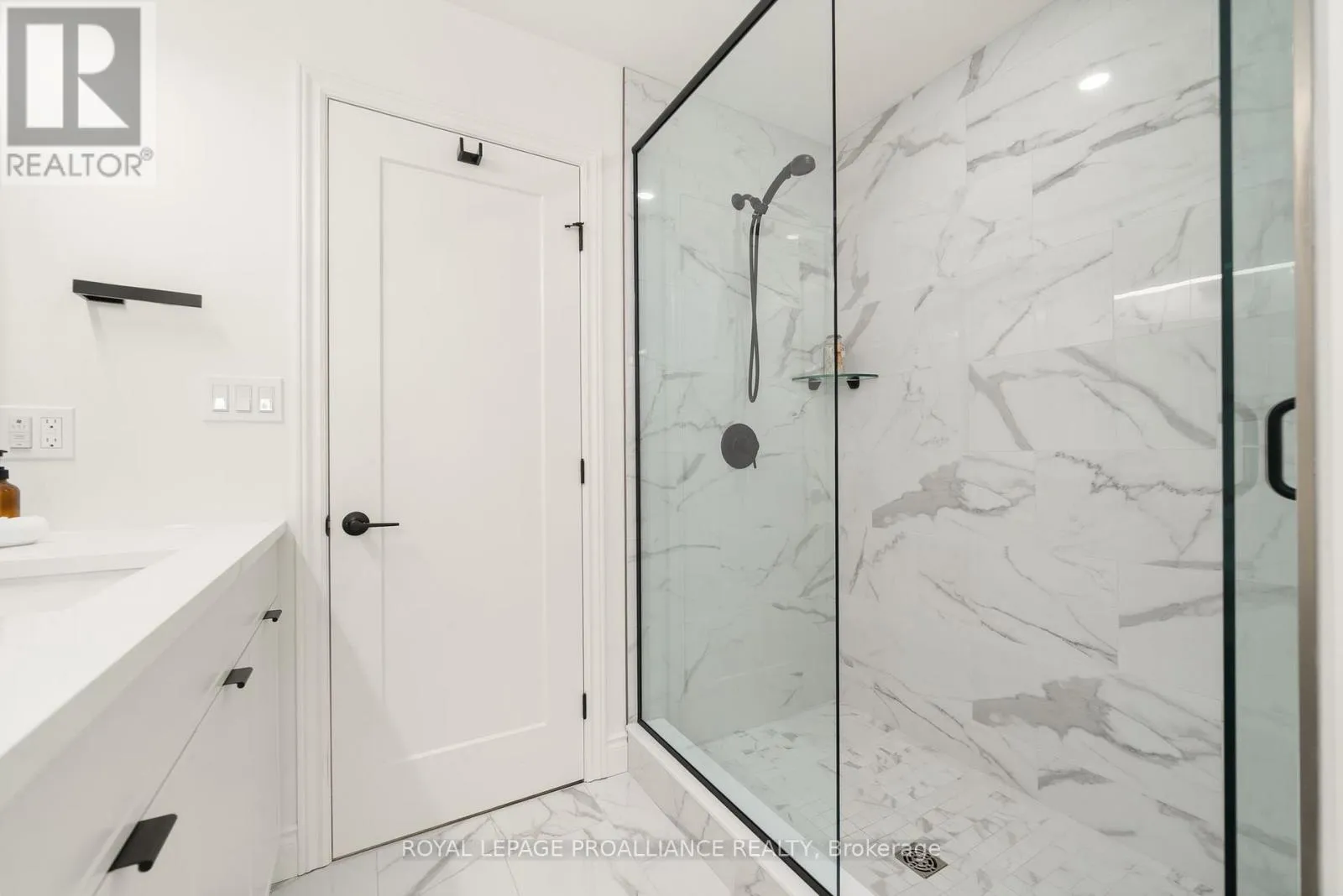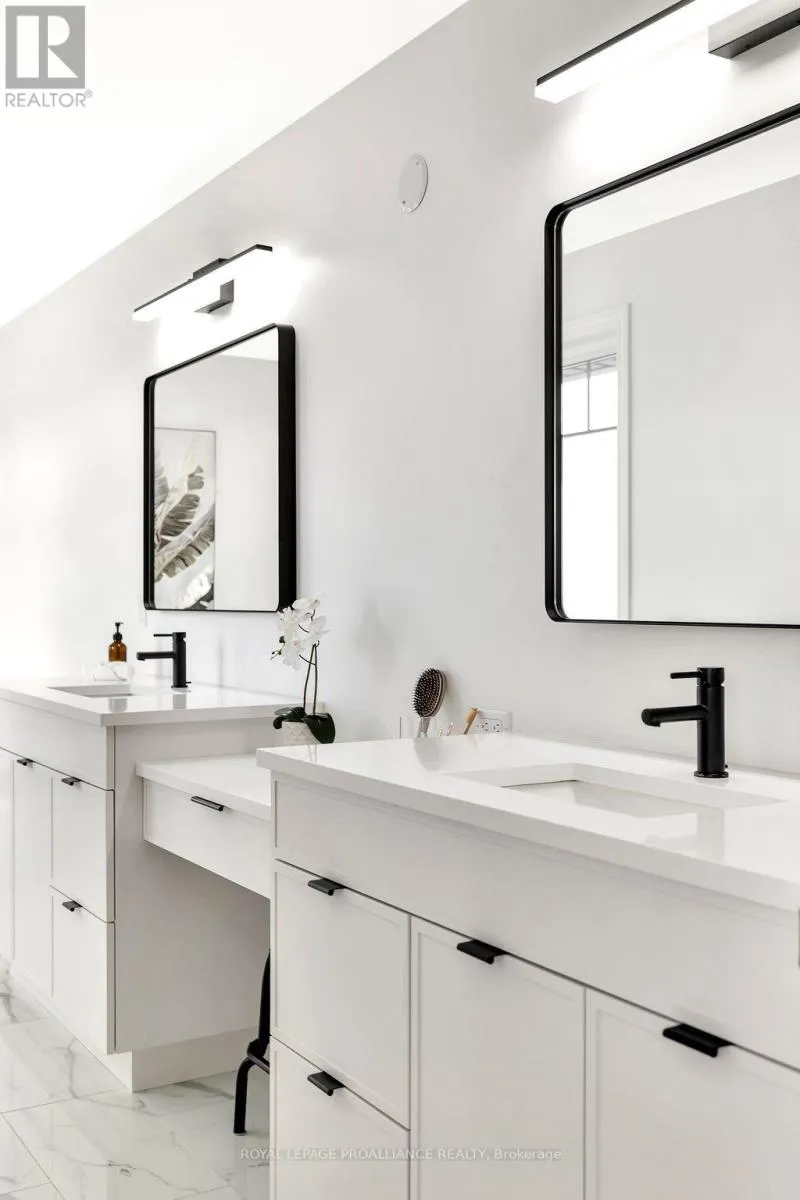 Cross Streets: Maitland & Hampton Ridge. ** Directions: Maitland Dr to Hampton Ridge, Right on Viginia, left on Raycroft. Welcome to refined living in this custom built beauty @ 18 Raycroft Drive in Belleville's Settler's Ridge. Situated four blocks from the park on an interior street resides this perfectly planned design where family function meets upscale living. Classic marble look porcelain tiled flooring invites you from the attached double garage into the large mudroom with coat closet storage & powder room or enter via the grand front foyer leading to the impressive living & entertaining area. This modified kitchen plan provides chic mini shaker style cabinetry to ceiling in timeless white with complimenting gold hardware, ideal corner pantry, veined quartz countertops + high end appliances include the elongated Kitchen Aid refrigerator, gas range & built-in microwave with convection feature. The massive detached island overlooks the spacious dining & lovely living area with pot lighting along the vaulted ceiling, fabulous natural light through the two added transom windows & three sided fireplace feature. Trending warm toned flooring throughout this sophisticated space & up the stairs where you will find three generously sized bedrooms, each with their own dedicated ensuite. The primary highlights a massive walk-in closet & impressive ensuite with double vanity sinks, make-up bar, step in glass & tiled shower + separate soaking tub. The function continues with second floor laundry here. Additional square feet in the fully finished basement providing a large pot lit recreation room with corner gas fireplace, 4th bedroom, a 5th bathroom & fabulous storage in the well maintained utility room with convenient laundry sink. Many exterior offerings include the all brick & stucco in timeless tones & perfectly tucked in private rear deck with gas bbq & fire pit line overseeing the rear yard. A thoughtfully remodelled family home offering something exciting for everyone @ 18 Raycroft Drive ~ Enjoy the video & 3D tour ~ (id:27476)