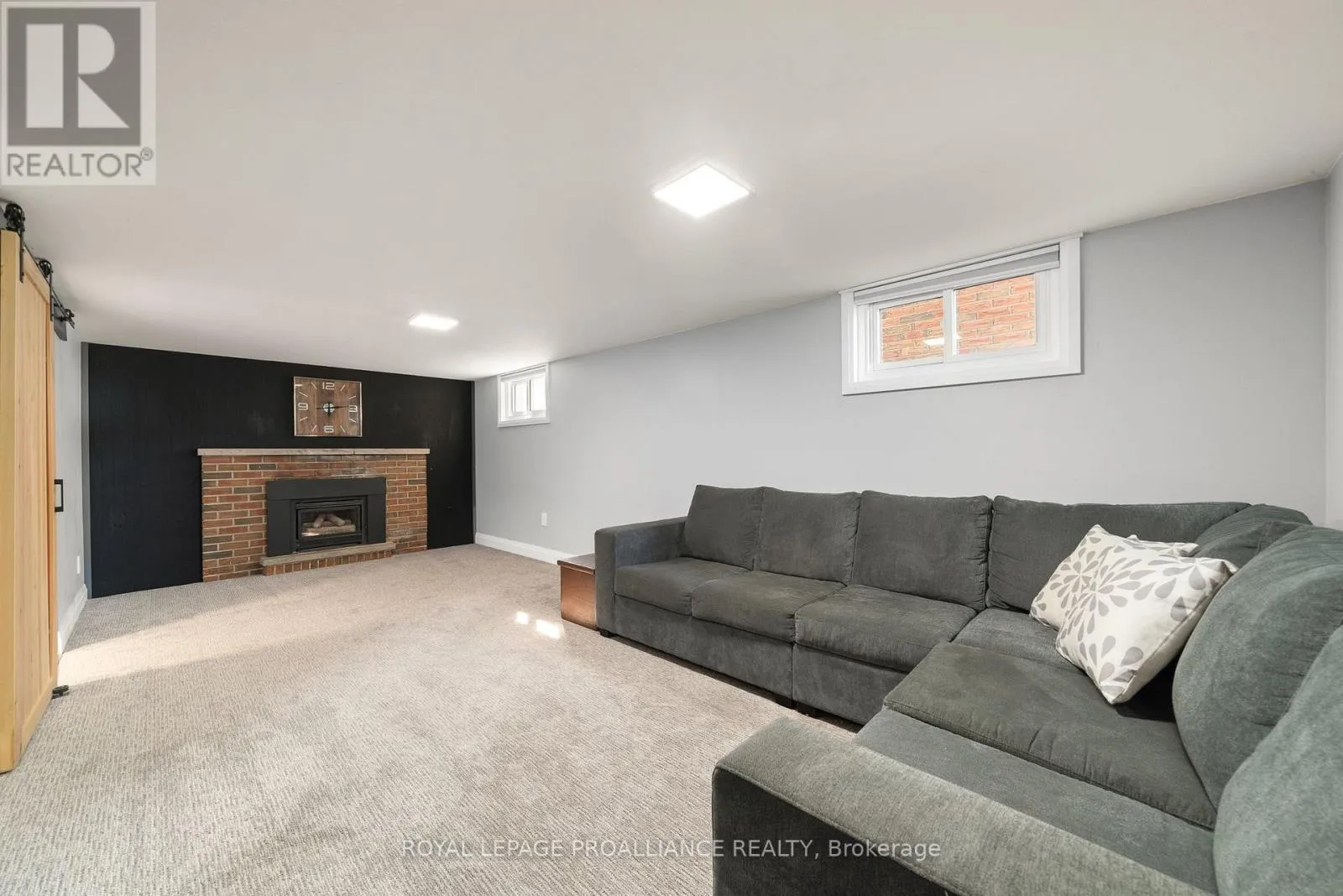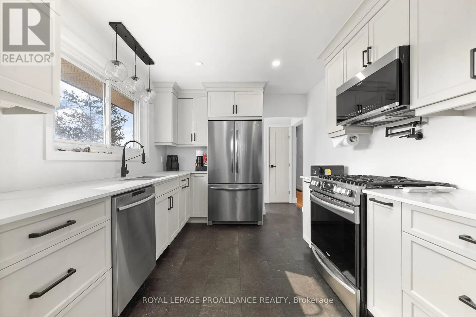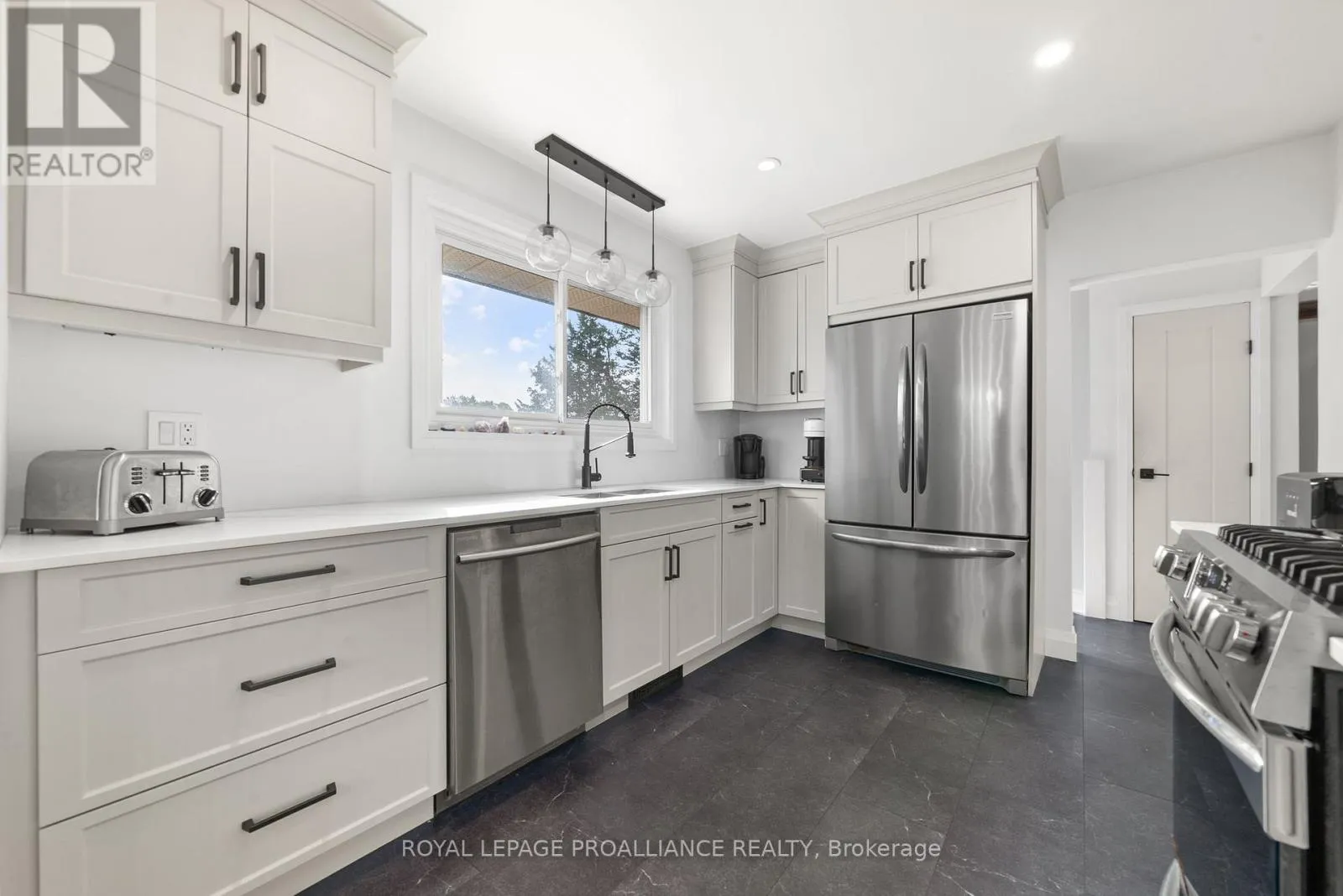 Cross Streets: Between Airport Pkwy & Hwy 2. ** Directions: Hwy 2 to Elmwood or Airport Pkwy to Elmwood. Enjoy the many perks of rural living within minutes to town amenities. Introducing 206 Elmwood Drive. Impressive curb appeal @ this all brick beauty with metal roof & massive freshly sealed drive. The established perennial garden lined path to the spacious front deck invites you into the entry with convenient coat closet storage to the original hardwood flooring throughout. Bright bay window in the living & fireplace with trending surround feature is open to the dining space, large enough to accommodate a harvest table. Stunning custom kitchen with neutral cabinetry to ceiling, under valance lighting & durable dekton countertops. Bonus, the stainless steel appliances are included. Coordinating lighting from the dining combined with pot lights & functional pantry closet. Three bedrooms on this main level nicely accommodates growing family living + a full bath with updated vanity. Additional living space in the fully finished basement providing a comfortable rec room with newer carpet & included built in TV media centre for your entertaining enjoyment. Laminate flooring through the remaining space offering two great flex rooms, you decide the use. One currently functioning as an office & the other with the window as a gym with cabinetry storage & bar fridge. Laundry, 2 piece bath & large utility room with workshop option here as well. Step out the back door to your interlocking patio with gas BBQ connection, raised vegetable gardens, in-ground dog fencing & new septic bed open to natural nature beyond. The 323 sq ft garage provides even more functional storage at this country charmer, surrounded by mature red maple, pines, cedars & lilac trees. You're invited to view this wonderfully updated home on desirable Elmwood Drive. (id:27476)