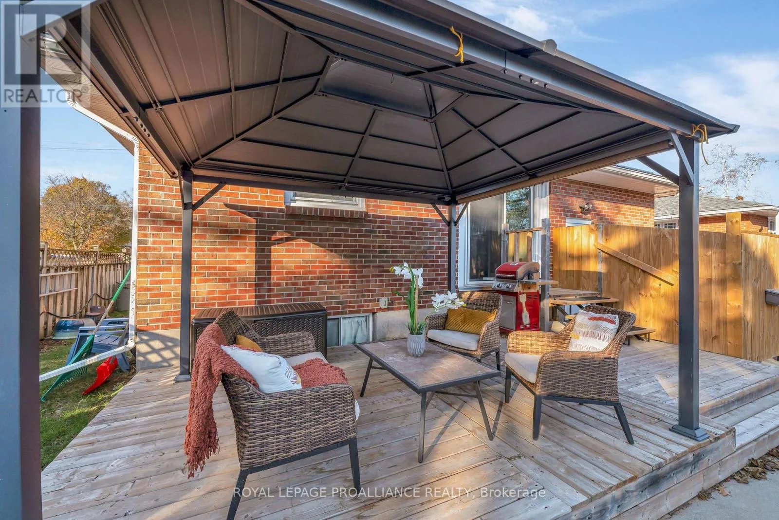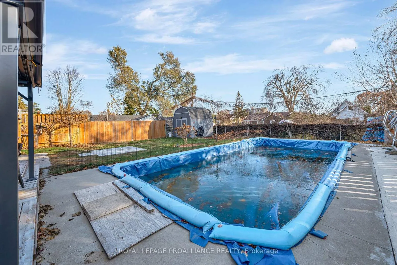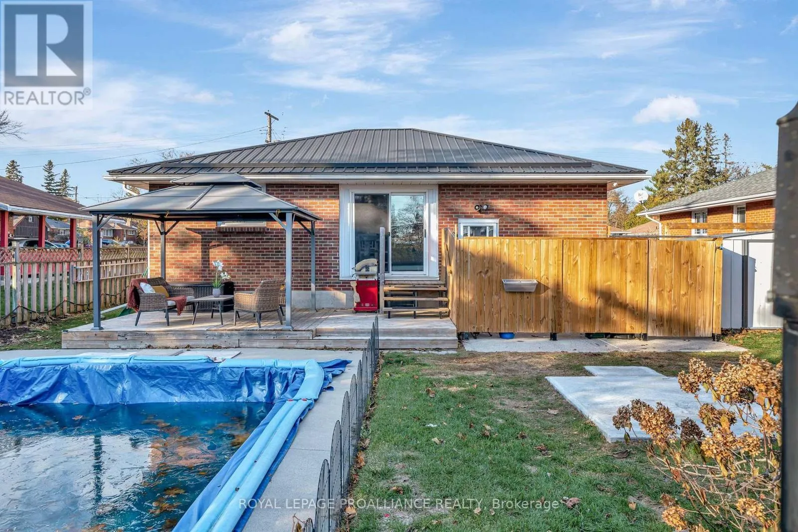 Cross Streets: Bridge St E and Rosewood. ** Directions: Bridge St East, to Herchimer, West on Rosewood to Crestview. Nestled on one of Belleville's most desirable East End streets, this fully brick updated bungalow with 2+1 bedroom, 2-bathroom home effortlessly blends classic charm with modern upgrades. A new bright, inviting eat-in kitchen features lots of cabinetry, granite countertops, a stylish backsplash, updated vinyl flooring, and glass doors that open directly to a private, fully fenced backyard-perfect for summer entertaining. The main living room is bathed in natural light from a large picture window and original hardwood flooring creating a warm and welcoming space to relax and watch your favourite show. Two generously sized bedrooms and a completely updated 4-piece bathroom complete the main level. The fully finished lower level has been recently renovated to accommodate a versatile in-law suite with a separate entrance, one bedroom, a 3-piece bathroom, and kitchenette. This space can also be opened up (just a temporary wall) to an open concept recreation room with a cozy gas fireplace for private enjoyment. The new laundry laundry space (with new washer and dryer), and an additional storage room is perfect for multigenerational living or supplement your mortgage with the tenant who currently lives in part of the basement (new apartment). Step outside to your backyard oasis, featuring an 18' x 36' in-ground pool, with concrete decking, expansive green space for children, pets, or gardening, and a private gazebo with a comfortable seating area for relaxing or entertaining. Located in a quiet, family-friendly neighbourhood, on a dead-end street close to great schools, parks, and everyday amenities. A well-built home that combines comfort, convenience, and lifestyle.. And so many recent updates! (New Kitchen, Bathroom, Basement, Metal Roof, In-ground Pool & newly Paved Driveway, just to mention a few) Don't miss the opportunity to own this exceptional property on an over-sized lot in Belleville's sought after east-end. (id:27476)