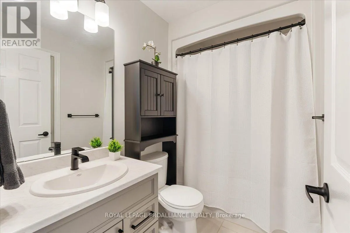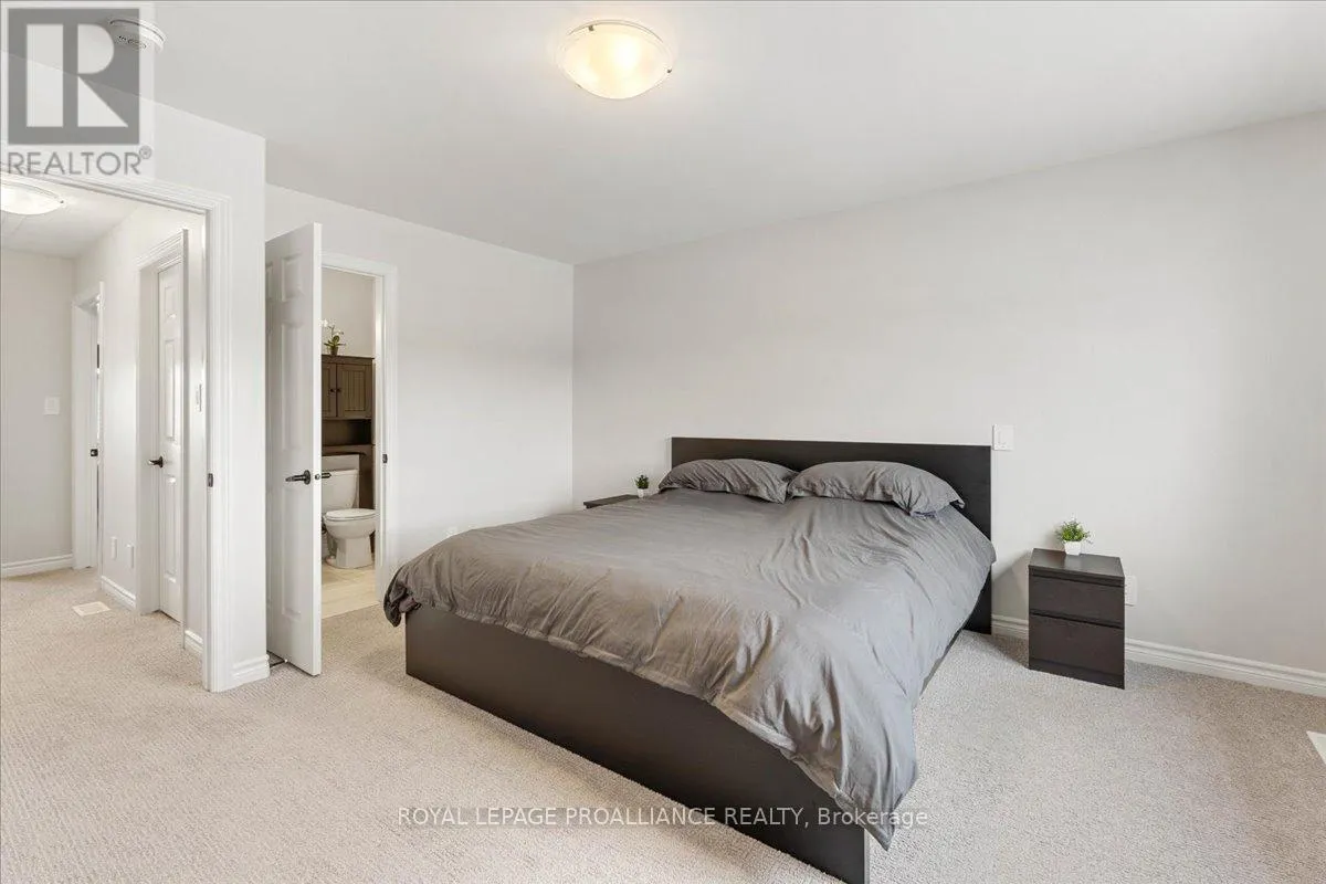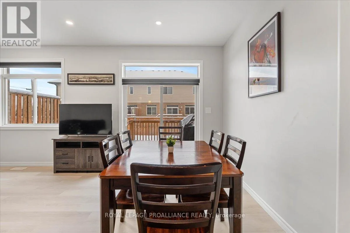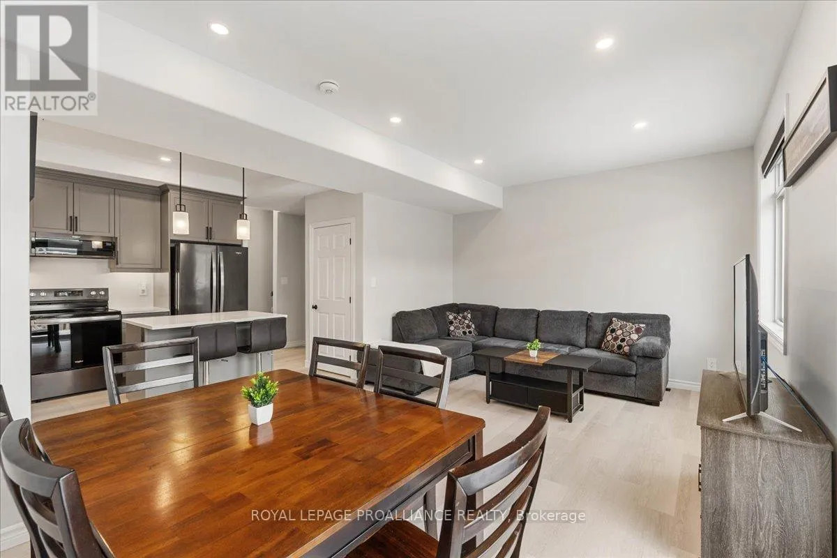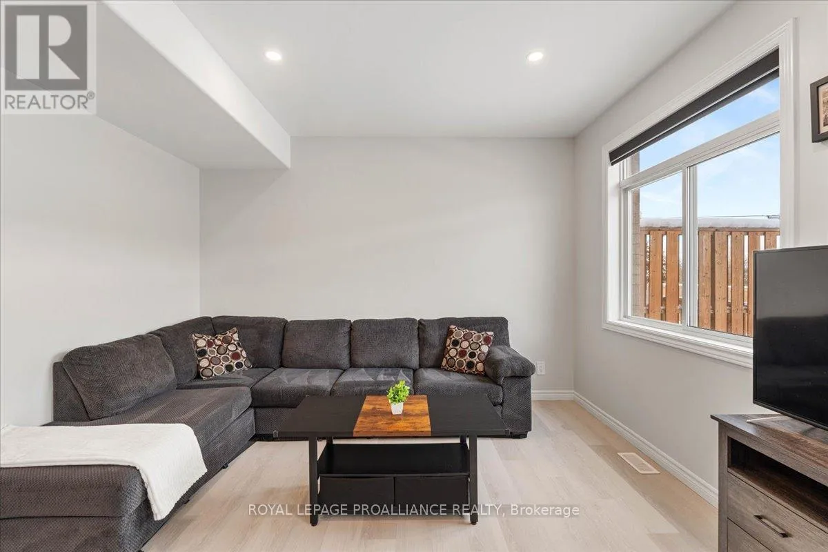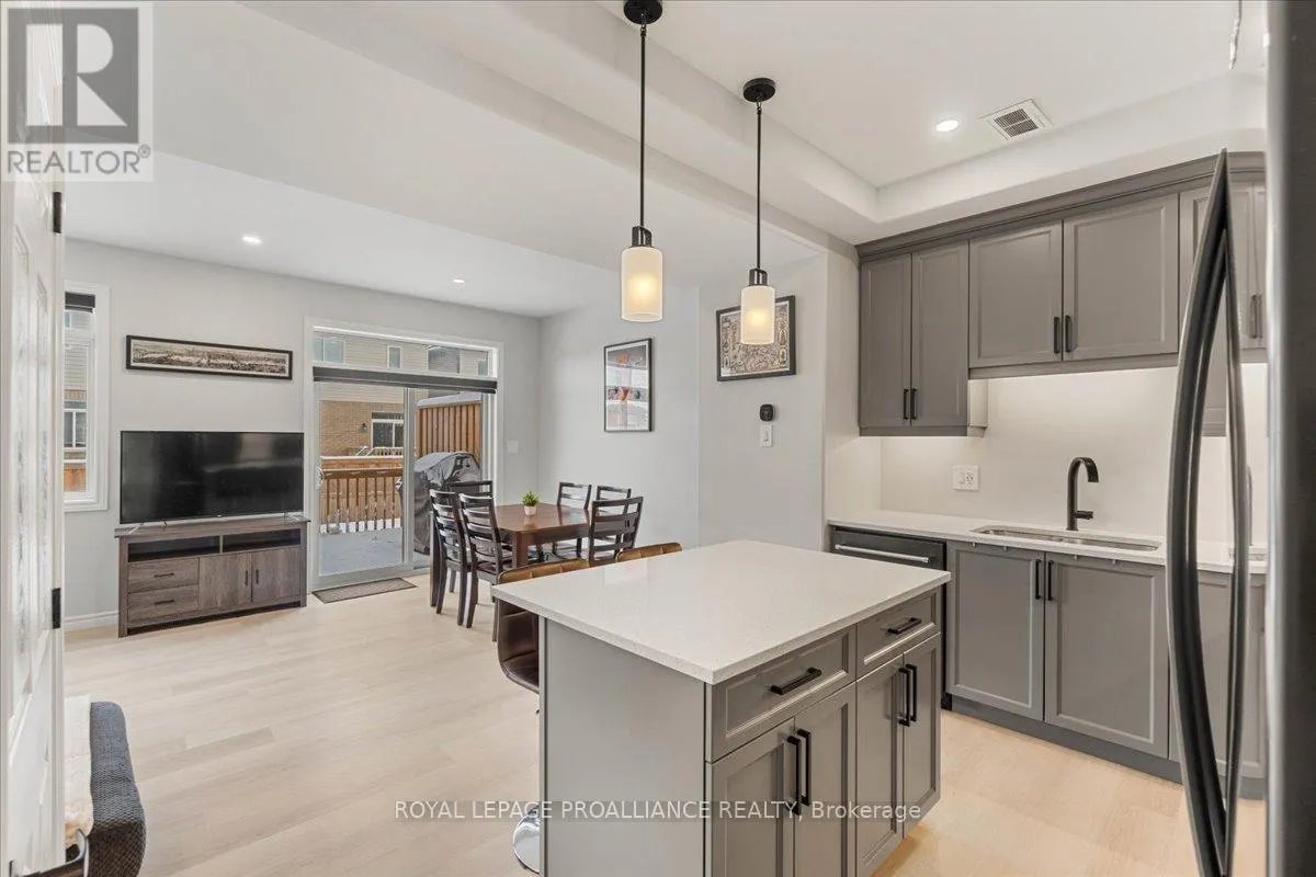 Riverstone Way & Miramichi Street Welcome to this quality built 2-storey townhouse, situated in Riverstone subdivision and built in 2023 by Geertsma Homes. With its attractive brick and vinyl exterior, attached single garage, and paved driveway, this home offers great curb appeal in a warm, family-friendly neighbourhood featuring a park close by, scenic walking trails, and close proximity to many amenities with quick access to the 401. Step inside to a bright and welcoming main floor, highlighted by 9-ft ceilings and large windows that fill the space with natural light. The open-concept kitchen, dining area, and living room create an ideal setting for everyday living and entertaining. Patio doors lead out to the deck and backyard, perfect for relaxing outdoors. A handy 2-piece powder room and inside entry to the garage add to the convenience. Upstairs, the primary bedroom offers a comfortable retreat with plenty of closet space as well as ensuite privileges to a shared 4-piece bathroom. Two additional bedrooms provide flexible space for family, guests, or a home office. The laundry room is conveniently located on the upper level, making daily routines that much easier. The lower level extends the living space with a cozy rec room, rough-in for a future bathroom, and additional storage options. A wonderful opportunity to settle into a thoughtfully designed home in a great neighbourhood. Perfect for those seeking comfort, convenience, and quality craftsmanship. (id:27476)
