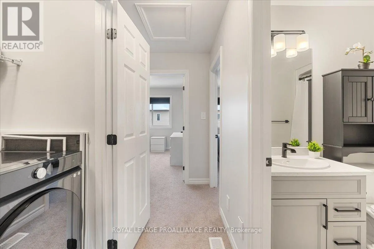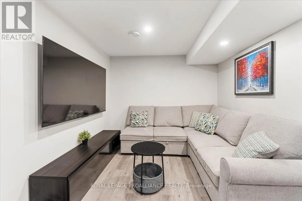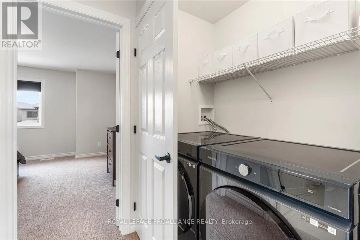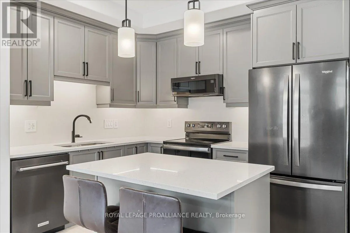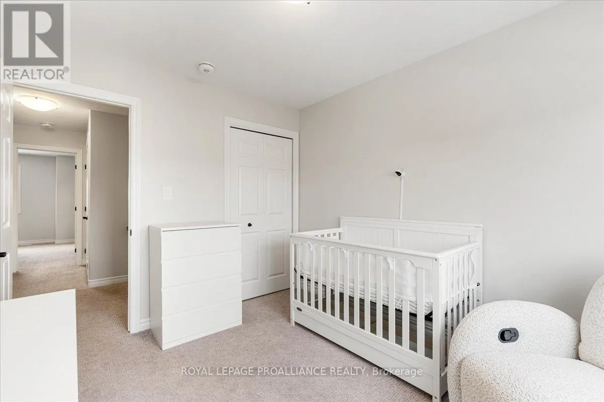 Riverstone Way & Miramichi Street Welcome to this quality built 2-storey townhouse, situated in Riverstone subdivision and built in 2023 by Geertsma Homes. With its attractive brick and vinyl exterior, attached single garage, and paved driveway, this home offers great curb appeal in a warm, family-friendly neighbourhood featuring a park close by, scenic walking trails, and close proximity to many amenities with quick access to the 401. Step inside to a bright and welcoming main floor, highlighted by 9-ft ceilings and large windows that fill the space with natural light. The open-concept kitchen, dining area, and living room create an ideal setting for everyday living and entertaining. Patio doors lead out to the deck and backyard, perfect for relaxing outdoors. A handy 2-piece powder room and inside entry to the garage add to the convenience. Upstairs, the primary bedroom offers a comfortable retreat with plenty of closet space as well as ensuite privileges to a shared 4-piece bathroom. Two additional bedrooms provide flexible space for family, guests, or a home office. The laundry room is conveniently located on the upper level, making daily routines that much easier. The lower level extends the living space with a cozy rec room, rough-in for a future bathroom, and additional storage options. A wonderful opportunity to settle into a thoughtfully designed home in a great neighbourhood. Perfect for those seeking comfort, convenience, and quality craftsmanship. (id:27476)