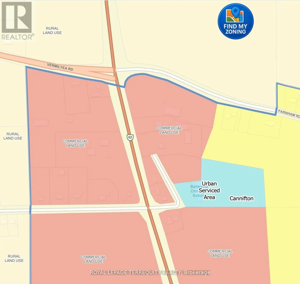 Cross Streets: South of Farnham Road on East of Highway 62 Off of Christina School Road. ** Directions: East of Highway 62 Off of Christian School Road. LOCATION, LOCATION, LOCATION...IT'S TIME FOR YOUR BUSINESS THRIVE. This 1+ acre lot is situated on a prime site to establish your business off of Highway 62 only 2 km north of highway 401. Currently zoned Development Control (DC). Belleville's Official Plan designates this property as Commercial Land Use. Re-zoning to commercial zones (C1, C2, or C3) are possible. C1 Zone and C2 Zone allows for Commercial and residential mixed uses. The C3 Zone is strictly only for commercial. You may review Section 4 Commercial Zoned within the City's Zoning By-law 2024-100 to view the permitted uses. Survey images and a PDF copy of the Zoning By-law 2024-100 is available on request. A great investment in your future. (id:27476)