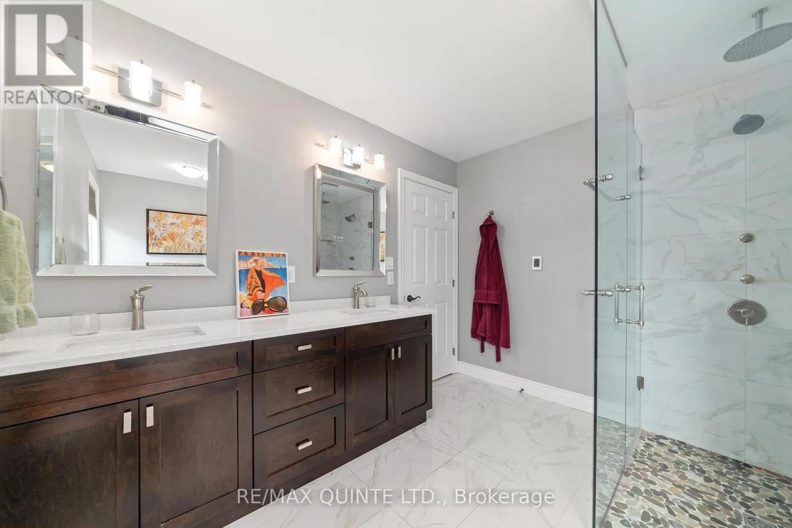 Cross Streets: Avondale & Meagher. ** Directions: Dundas St West to Avondale, North on Meagher Place. Welcome to this exceptional all-brick 4 bedroom, 3 bathroom two-storey home, tucked into Belleville's sought-after West End and perfectly positioned beside tranquil walking trails in a warm, family-friendly neighborhood. From the moment you step inside, you'll feel the seamless blend of comfort, character, and thoughtful upgrades throughout. Hardwood and ceramic floors guide you to a sunken living room flooded with natural light-an inviting space to unwind or gather with guests. At the heart of the home is a beautifully designed kitchen, complete with custom cabinetry, quartz countertops, and an on-demand hot water tap-perfect for morning coffees and afternoon teas alike. The cozy family room and breakfast nook open through two patio doors to a stunning multi-level composite deck, setting the stage for summer BBQs, quiet mornings, and evening entertaining under the stars. The fully fenced backyard is lush yet low-maintenance, enhanced by an in-ground sprinkler system to keep everything effortlessly green. Upstairs, the spacious primary suite offers a true retreat with a walk-in closet and a spa-inspired 5-piece ensuite featuring heated floors, a custom tile shower, and luxurious finishes. With four bedrooms and three bathrooms, there's room for everyone to live comfortably. The fully finished basement delivers the perfect balance of fun and function-ideal for movie nights, game days, or relaxing at the wet bar, complete with built-in candy dispensers the kids will adore. With tasteful updates, ample storage, and a prime location that blends community charm with everyday convenience, this is a home that truly has it all-style, comfort, and heart. (id:27476)