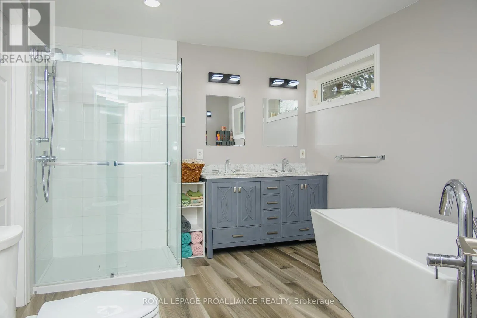 Cross Streets: Old Madoc Road/Zion Road. ** Directions: Highway 62 to Old Madoc Road to Zion road. Value defines this 1-acre property. offering privacy and rural living just minutes from Belleville and all amenities. There have been numerous updates and improvements over the past four years, including a brand-new septic tank and bed valued at $45,000. This raised bungalow sits proudly on a hill, showcasing an impressive brick facade and a tall, arched covered entrance. Enjoy direct views of the skyline and a beautifully treed setting. The main floor features numerous windows and an open-concept layout, creating a bright and inviting living space. Cooking is effortless with an abundance of cabinets and generous counter space. The Primary Bedroom is completed with a deep walk-in closet and direct access to the main bathroom. The main bathroom makes no compromises, his and hers sink, standalone bath tub and shower do not forget the HEATED FLOOR. The finished basement with garage access and in-law potential provides additional space ready for your enjoyment. (id:27476)