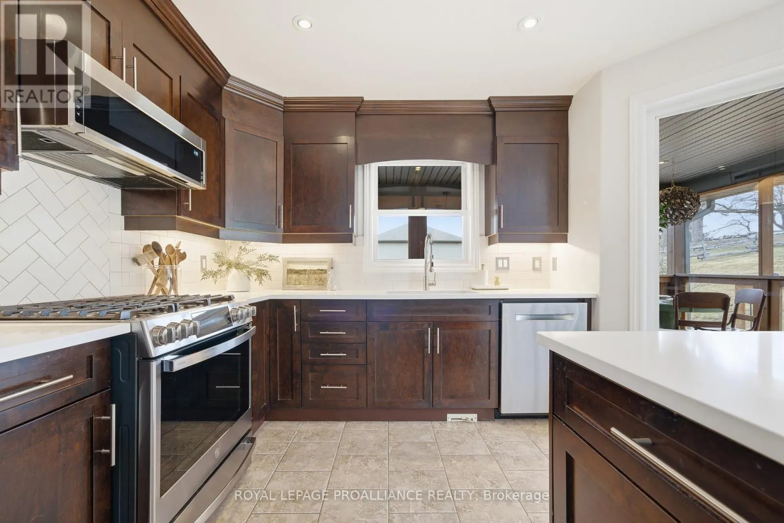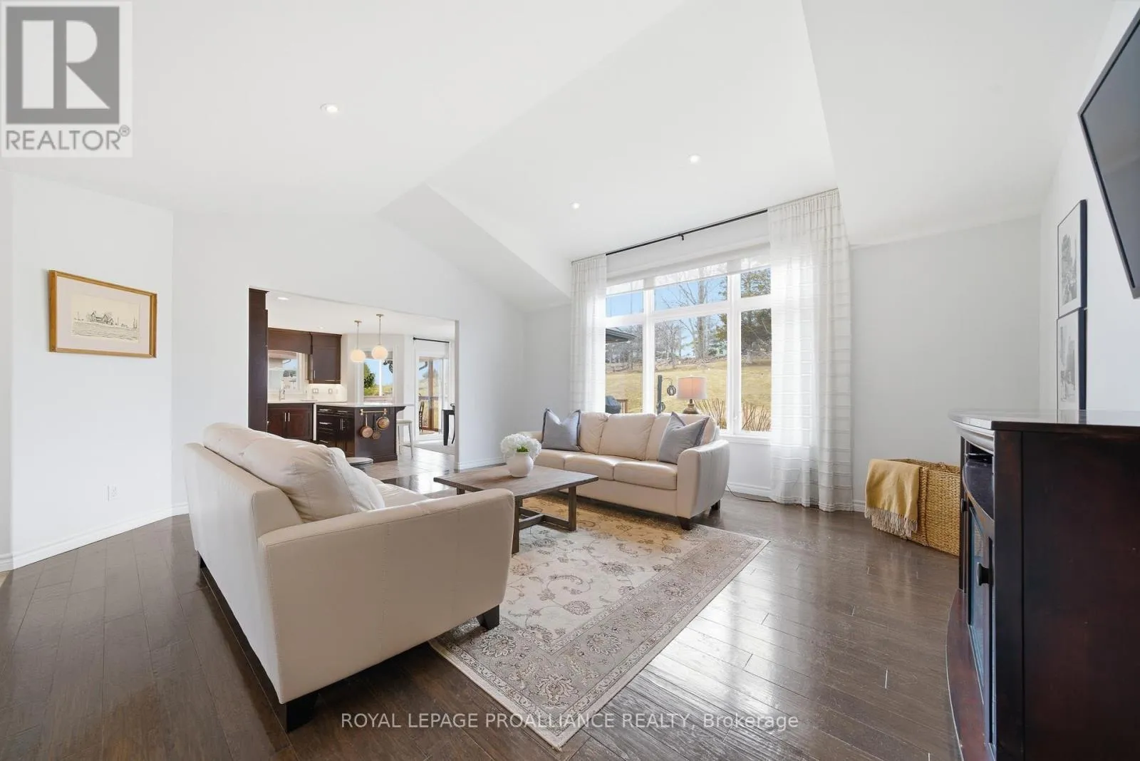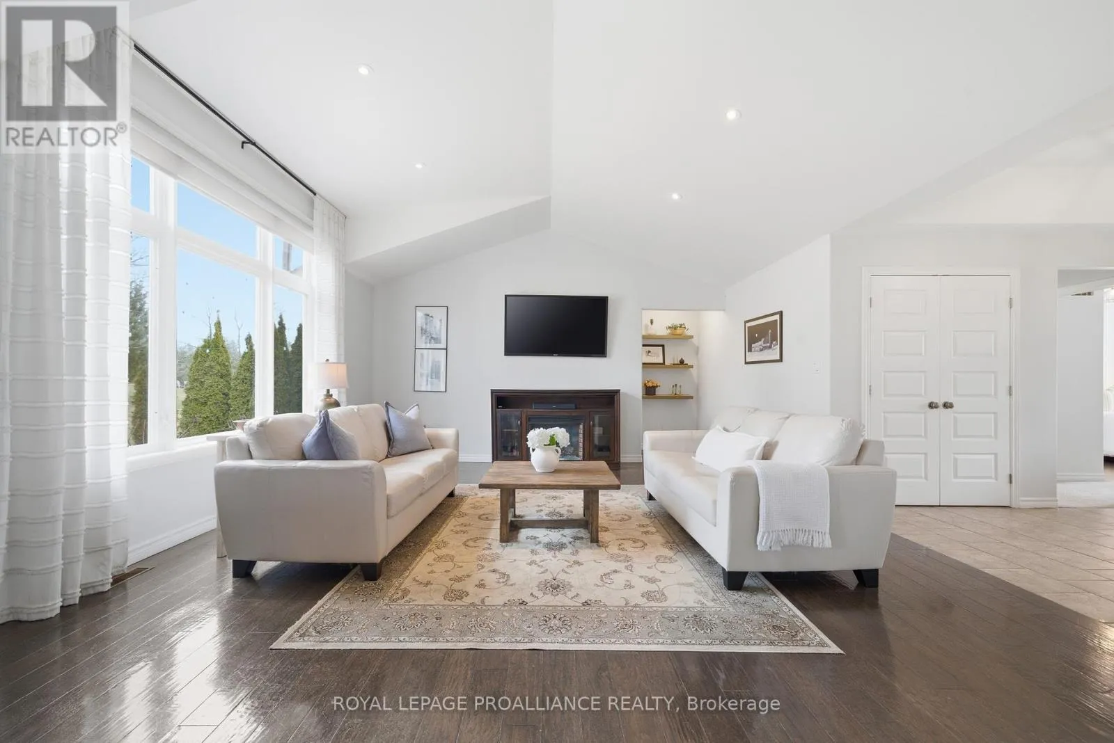 Mudcat Rd to Countrycharm Dr to Whindwhisper Dr This stunning stone-front bungalow is situated on an expansive lot in the highly desirable Hearth Stone Ridge Estates, offering a perfect blend of curb appeal and high-end functionality. The main level welcomes you with a large, bright entryway that flows into an open-concept living space with vaulted ceilings, featuring a beautiful kitchen with a massive center island, abundant cabinet storage, and a dedicated dining area. Retreat to the primary suite, which boasts a walk-in closet and a private 3-piece ensuite, alongside two additional main-floor bedrooms and a full 4-piece bathroom. The convenience continues with a main-floor laundry room equipped with built-in storage and a custom drying rack. Step outside through the dining room to a truly one-of-a-kind outdoor sanctuary: a screened-in covered porch featuring custom solid cedar barn-style sliding doors with metal wheel hardware, overlooking a professionally landscaped backyard complete with a deck, gazebo, and fire pit. For hobbyists, the attached two-car garage is fully heated and insulated for year-round use. The fully finished, exceptionally bright basement expands your living space with a large recreation and family room anchored by a cozy fireplace, a fourth bedroom, a two-piece bathroom, a dedicated pantry, and significant additional storage. (id:27476)
