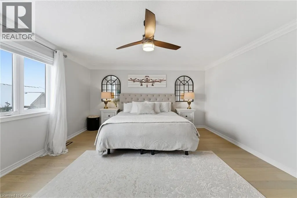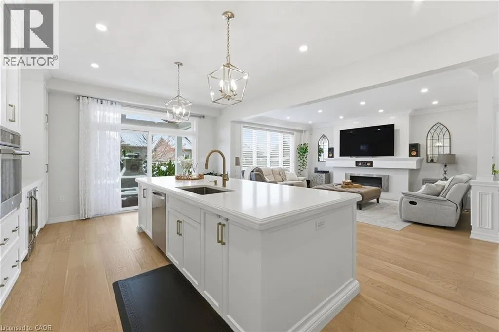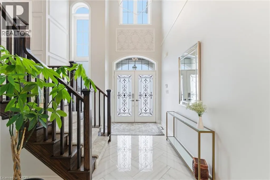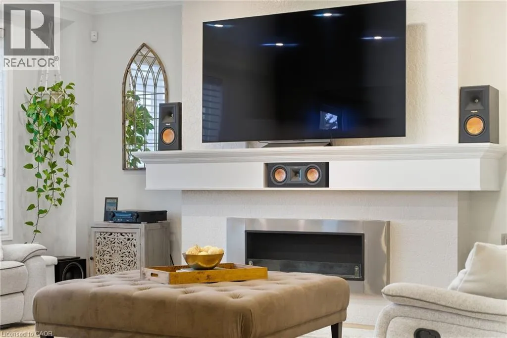 From Hwy 56, West on Fall Fair Way, North on Daw and located in the court on Festival Way Welcome to 16 Festival Way, an executive residence featuring nearly 3,700 sq. ft. of luxuriously finished living space, set on a large, pool-sized, pie-shaped lot. Nestled in one of Binbrook's most prestigious courts, this exceptional 4 bedroom, 4 bath home effortlessly blends timeless elegance with modern sophistication. Step into the impressive 2-storey foyer, where wainscoting and herringbone tile set the tone for refined design. The open-concept main floor showcases natural white oak hardwood and crown moulding throughout, creating an inviting yet upscale atmosphere. At the heart of the home lies the custom chef-inspired kitchen, featuring an expansive 10-foot island, oversized cabinetry, quartz countertops, and top-of-the-line GE Café and Jenn-Air appliances. The adjoining living room centers around a custom tiled bio-ethanol fireplace, while the formal dining room, powder room, and laundry/mudroom complete this beautifully designed level. Beyond the 8-foot glass doors, your outdoor oasis awaits a custom stone kitchen with concrete countertops, built-in natural gas Napoleon grill, and a spacious covered patio with cedar ceiling & pot lights ideal for year-round entertaining. A massive stone fireplace adds warmth and ambiance, making this the perfect retreat for cozy evenings. The upper level continues to feature white oak hardwood floors and crown moulding, leading to four generous sized bedrooms. The primary suite is a true sanctuary, featuring a spa-inspired 4-piece ensuite and a custom-built walk-in closet designed for ultimate organization and style. The fully finished basement provides comfort and versatility, complete with plush designer carpeting, an open-concept media room with a 130 high-end projector screen and built-in surround sound system, plus an oversized gym with mirror wall, a 3-piece bathroom, and ample storage. This remarkable home is rare, combines luxury, craftsmanship, and thoughtful design inside and out. (id:27476)