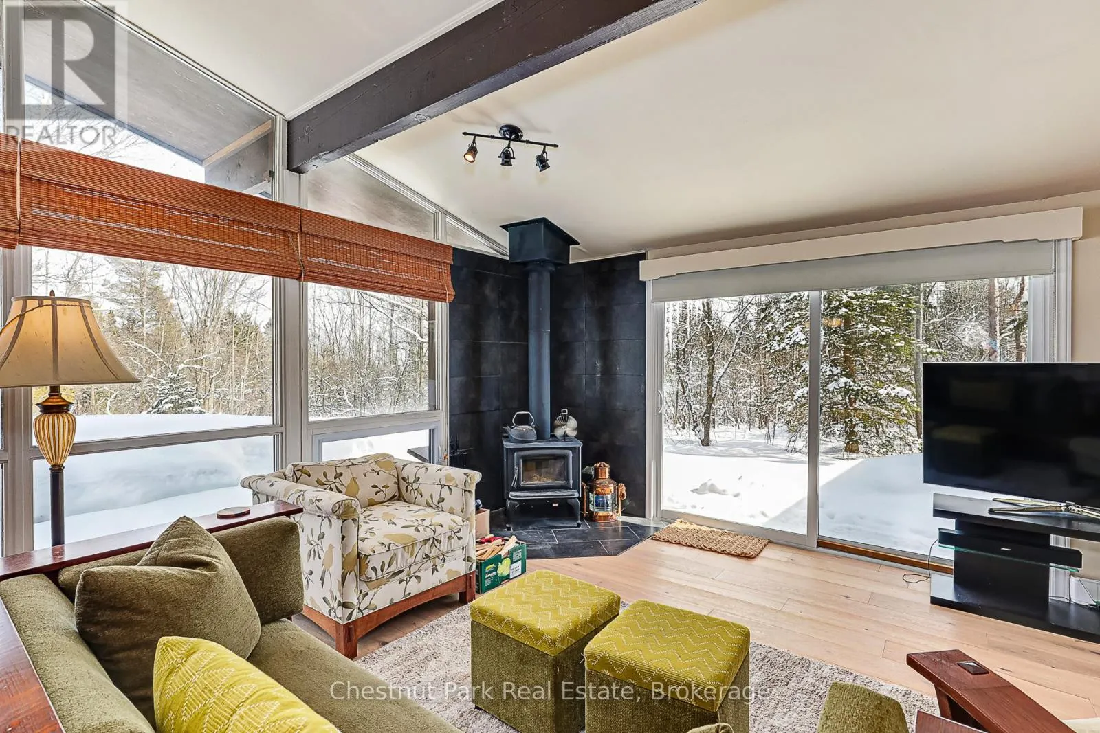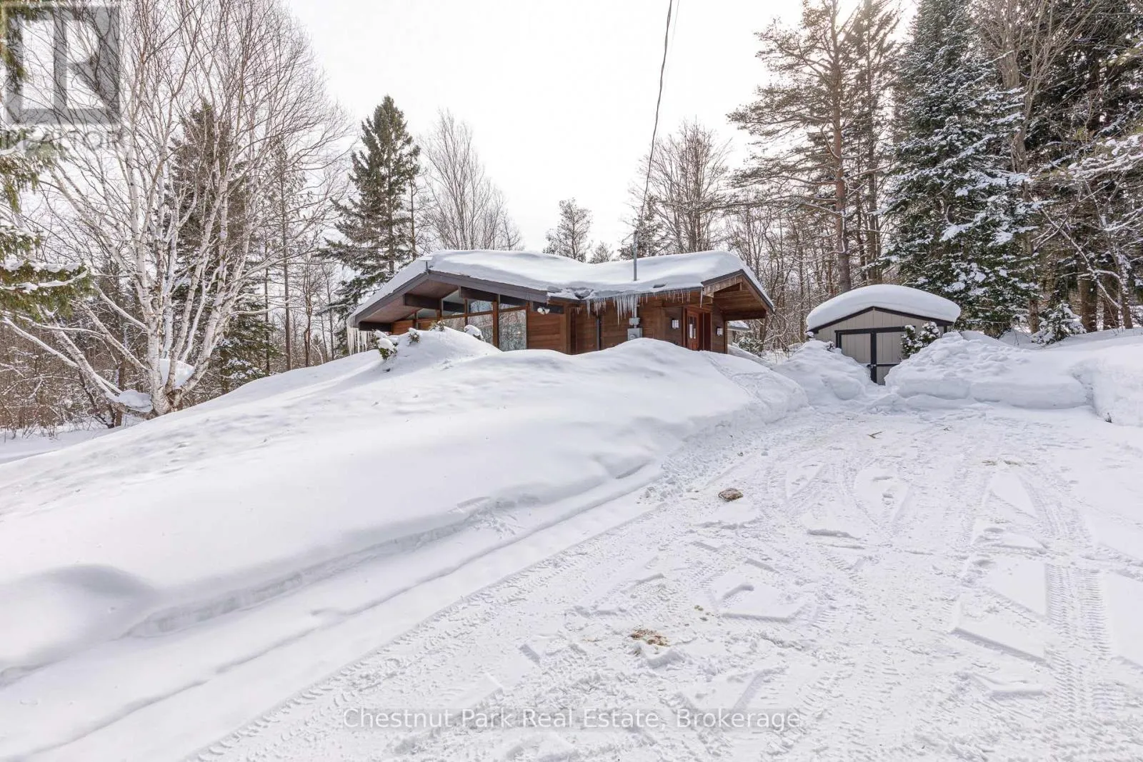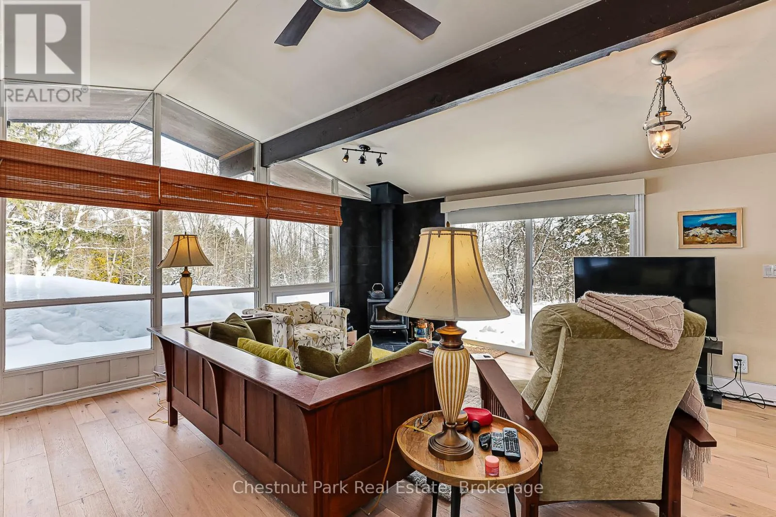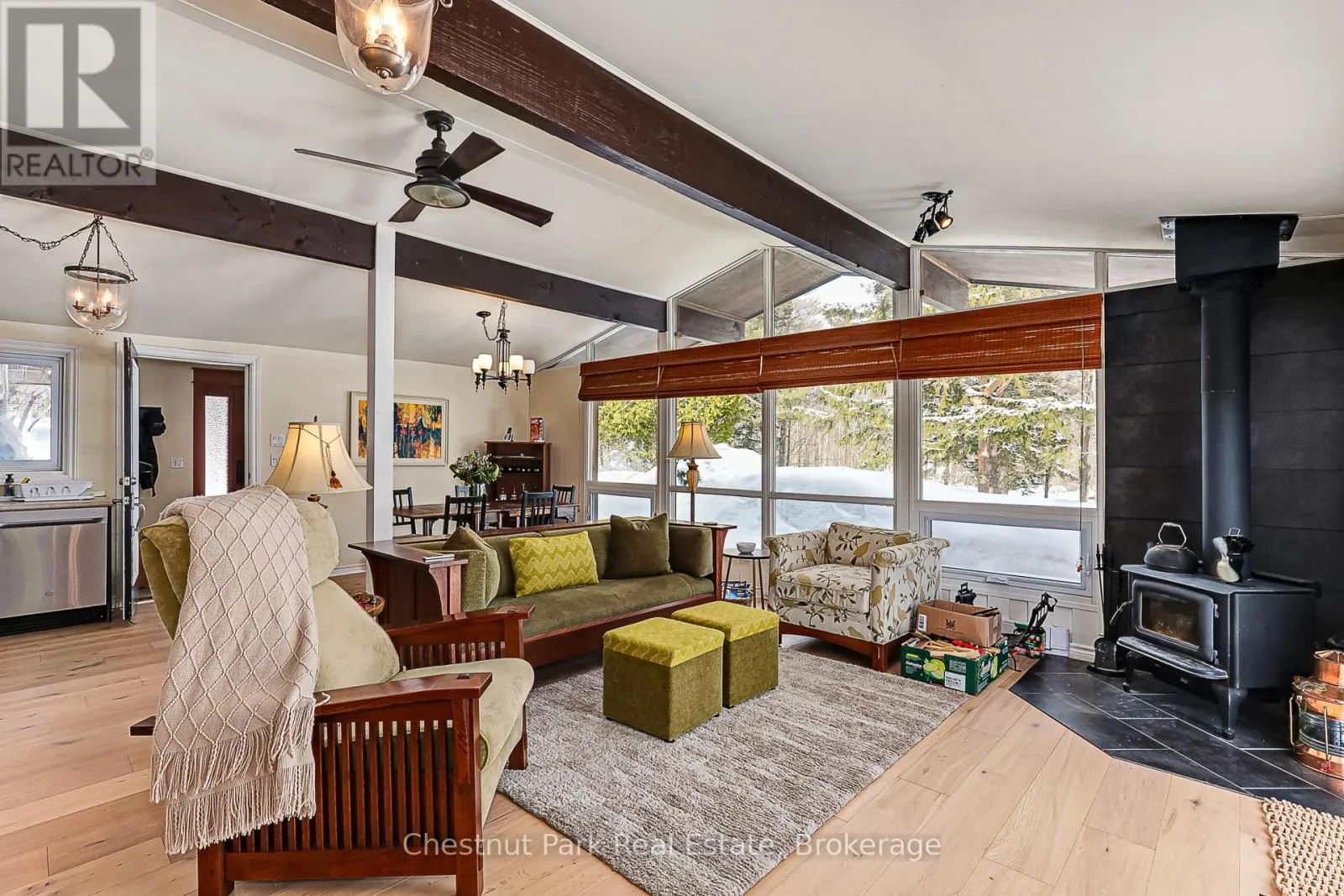 Cross Streets: Castleview and Northmount. ** Directions: Grey Road 19 to Northmount Road to Castleview Road to #116 on the left. FOUR SEASON CASTLE GLEN CHALET - PEACEFUL PERFECTION. Tranquility and peace await at this 3 Bedroom idyllic all-season chalet completely surrounded by nature and access to many trails (including the Bruce Trail) and yet just a few minutes' drive to Osler private ski club, Oslerbrook golf club, downtown Collingwood and Blue Mountain Village. Hike, cycle and snowshoe directly from your front door. Lake of the Clouds - a tranquil, serene lake is just a five-minute walk away through the trail, equally beautiful all-year round and especially delightful reflecting the Autumn leaves. Nestled toward the top of Castle Glen and set well back from the quiet dead end road you are guaranteed ultimate privacy. A welcoming mudroom and laundry flows through to the open concept Living/Dining/Kitchen with a cozy wood stove to relax by after a fun day outdoors. Three spacious and comfortable bedrooms make for an ideal family environment. During the Summer months you can unwind in your expansive garden, enjoy al fresco dining with family and friends or gather around the firepit as night falls to enjoy cozy chats and views of the stars. This sought after location offers lazy days never having to leave your home and immersing yourself in the beauty of nature from the bright and expansive windows or you could head to the slopes for action, cross country ski or snow shoe, or during the Summer months enjoy a round of golf at the many local courses including Oslerbrook which is only minutes down the road. Browse the designer shops or stroll along the waterfront in Collingwood/The Village/Thornbury and enjoy the local nightlife with an impressive array of restaurants to choose from the choices are endless in this fantastic 4 Season destination. This would make the perfect full time residence or equally your 2nd home away from home all season chalet. Water is from the reservoir. Sewage system is communal and approx. $3,700 per year. Also listed FOR SEASONAL LEASE MLS X12401967 (id:27476)