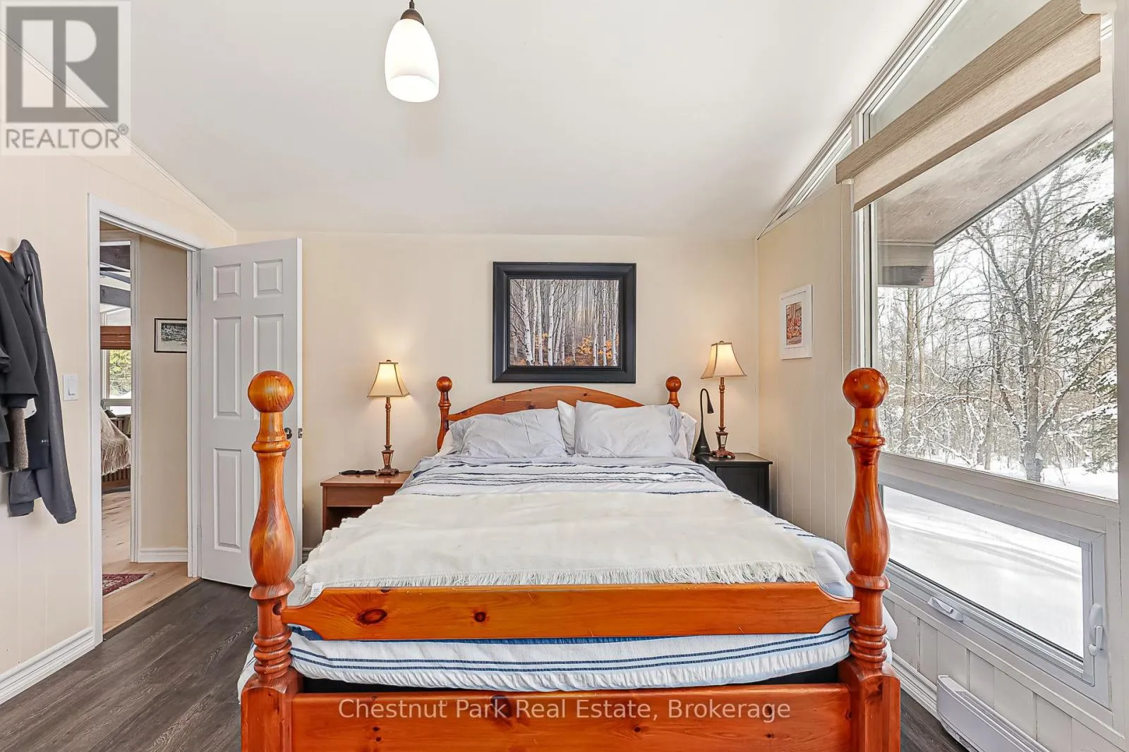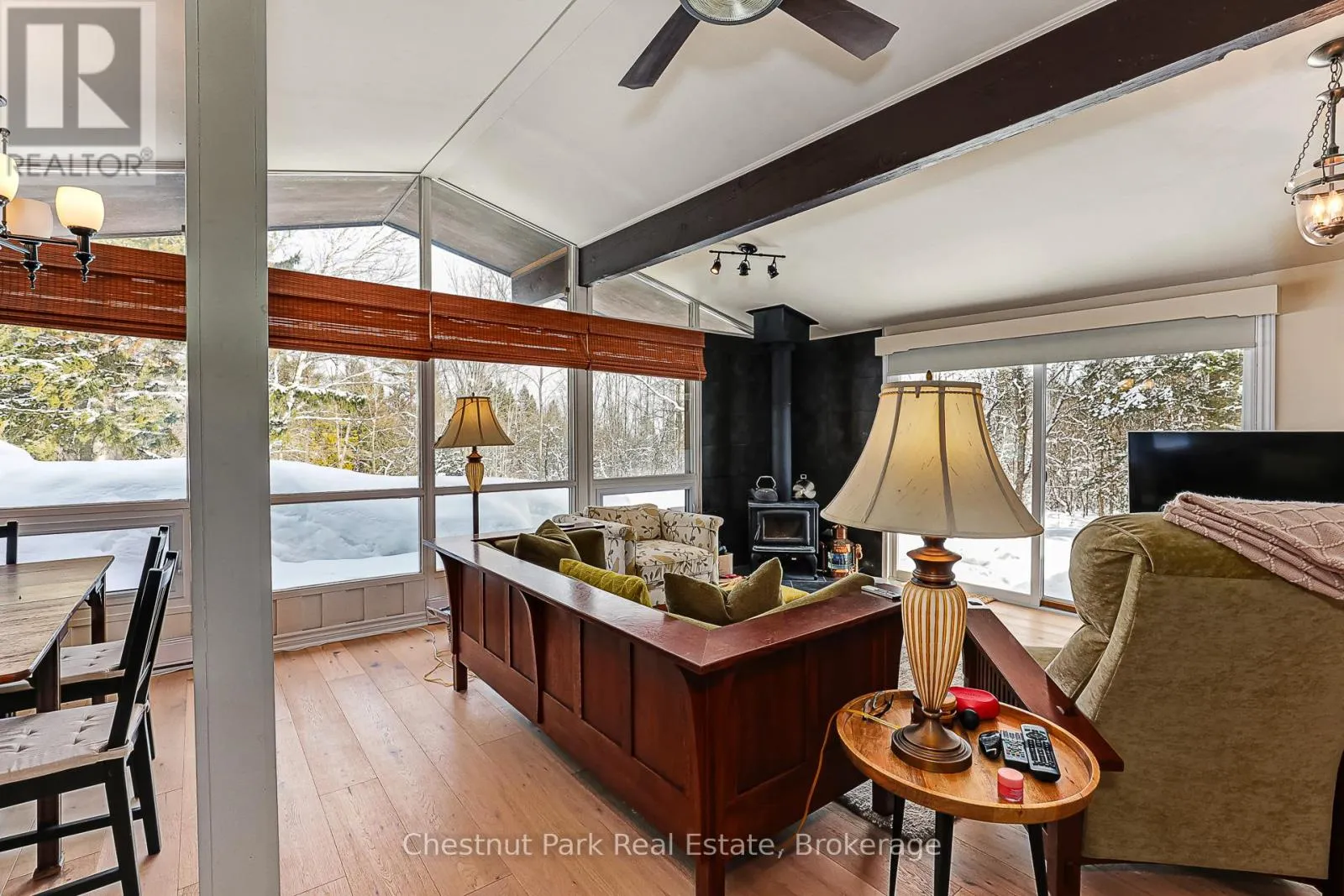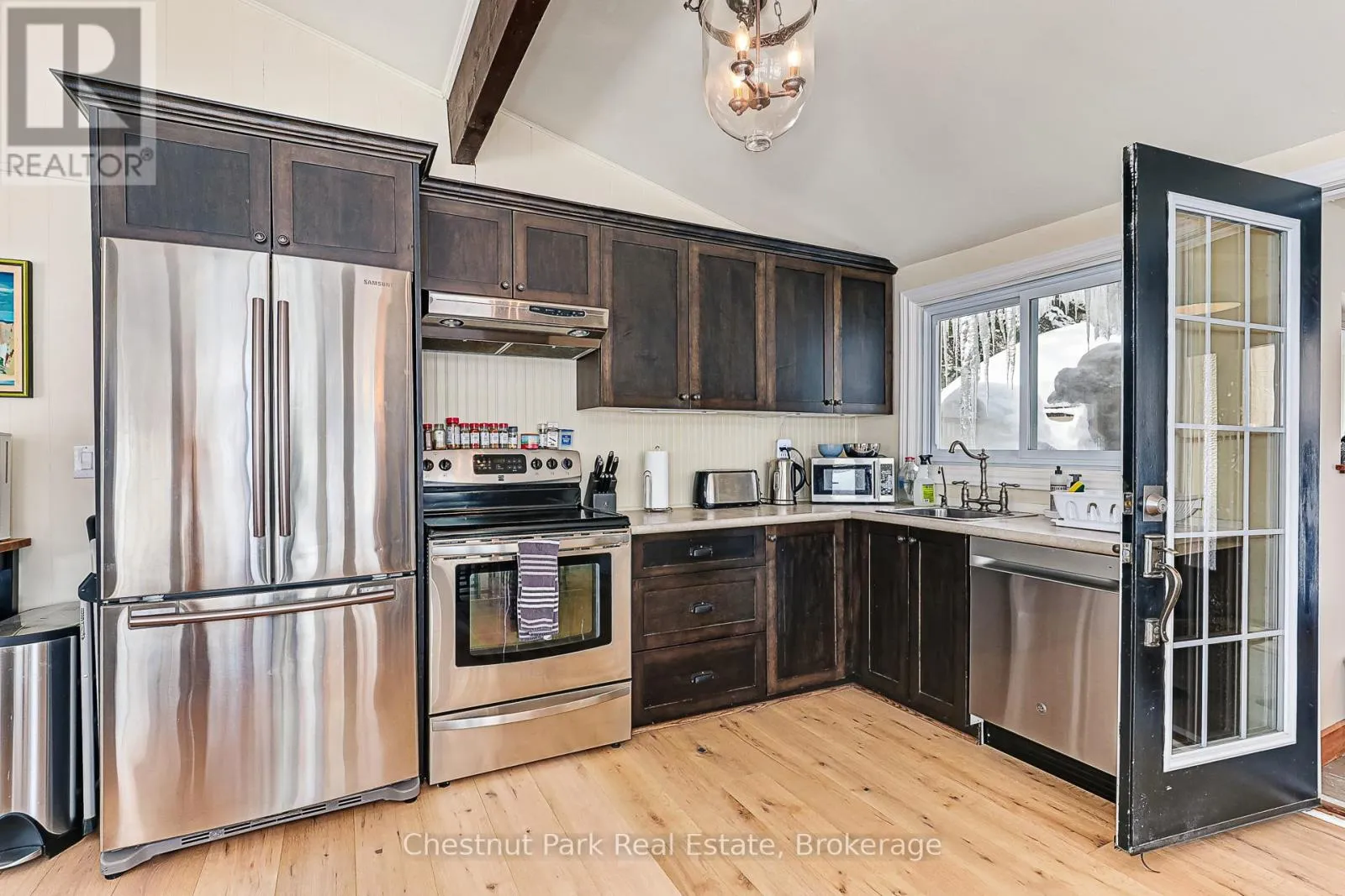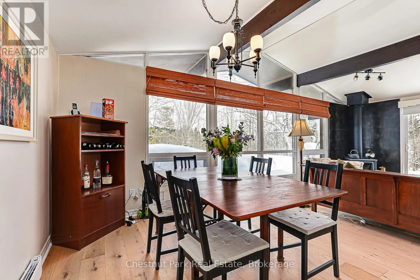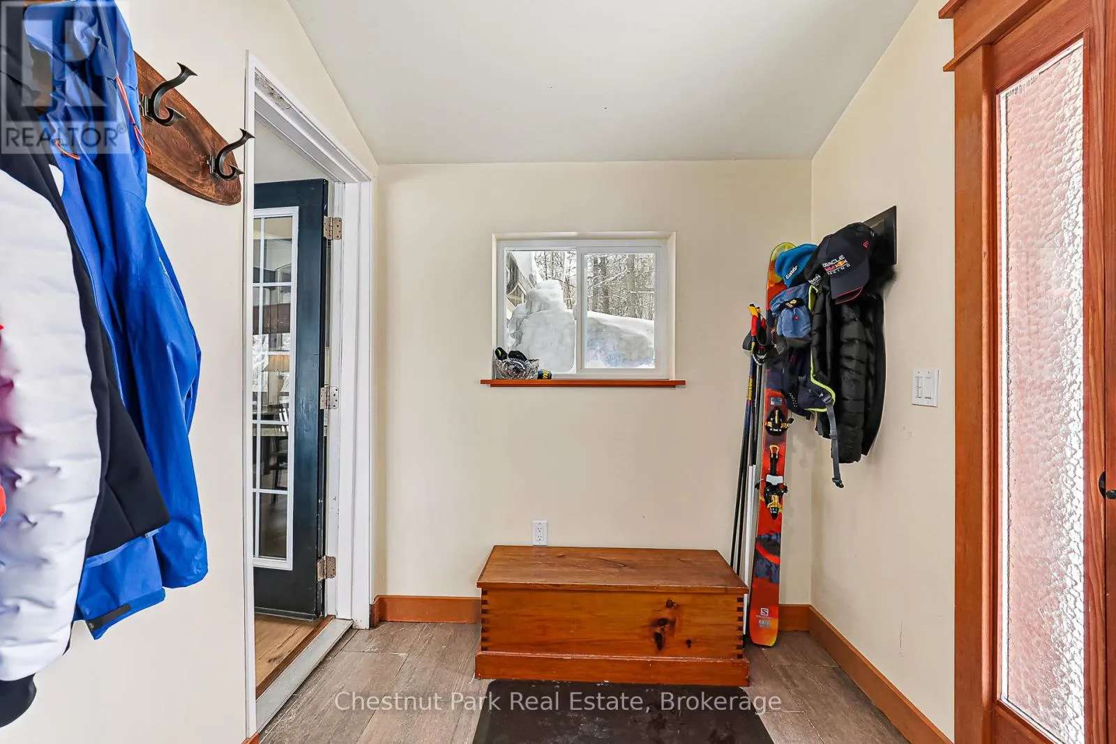 Cross Streets: Castleview and Northmount. ** Directions: Grey Road 19 to Northmount Road to Castleview Road to #116 on the left. FOUR SEASON CASTLE GLEN CHALET - PEACEFUL PERFECTION. Tranquility and peace await at this 3 Bedroom idyllic all-season chalet completely surrounded by nature and access to many trails (including the Bruce Trail) and yet just a few minutes' drive to Osler private ski club, Oslerbrook golf club, downtown Collingwood and Blue Mountain Village. Hike, cycle and snowshoe directly from your front door. Lake of the Clouds - a tranquil, serene lake is just a five-minute walk away through the trail, equally beautiful all-year round and especially delightful reflecting the Autumn leaves. Nestled toward the top of Castle Glen and set well back from the quiet dead end road you are guaranteed ultimate privacy. A welcoming mudroom and laundry flows through to the open concept Living/Dining/Kitchen with a cozy wood stove to relax by after a fun day outdoors. Three spacious and comfortable bedrooms make for an ideal family environment. During the Summer months you can unwind in your expansive garden, enjoy al fresco dining with family and friends or gather around the firepit as night falls to enjoy cozy chats and views of the stars. This sought after location offers lazy days never having to leave your home and immersing yourself in the beauty of nature from the bright and expansive windows or you could head to the slopes for action, cross country ski or snow shoe, or during the Summer months enjoy a round of golf at the many local courses including Oslerbrook which is only minutes down the road. Browse the designer shops or stroll along the waterfront in Collingwood/The Village/Thornbury and enjoy the local nightlife with an impressive array of restaurants to choose from the choices are endless in this fantastic 4 Season destination. This would make the perfect full time residence or equally your 2nd home away from home all season chalet. Water is from the reservoir. Sewage system is communal and approx. $3,700 per year. Also listed FOR SEASONAL LEASE MLS X12401967 (id:27476)