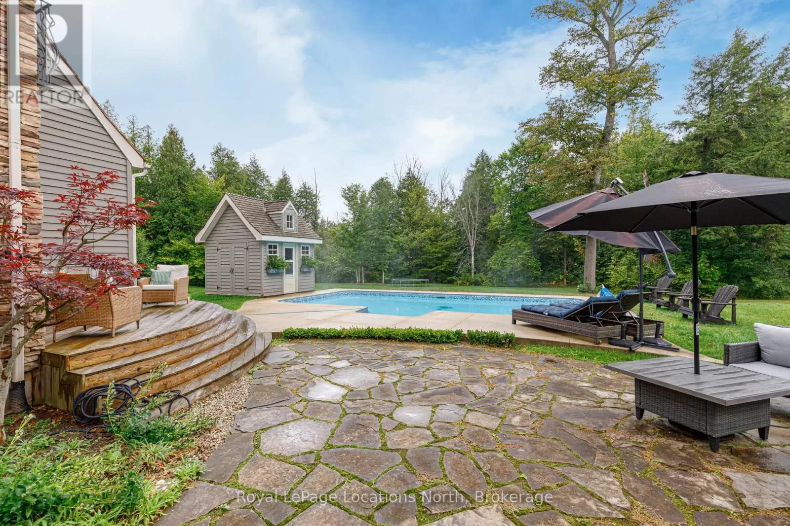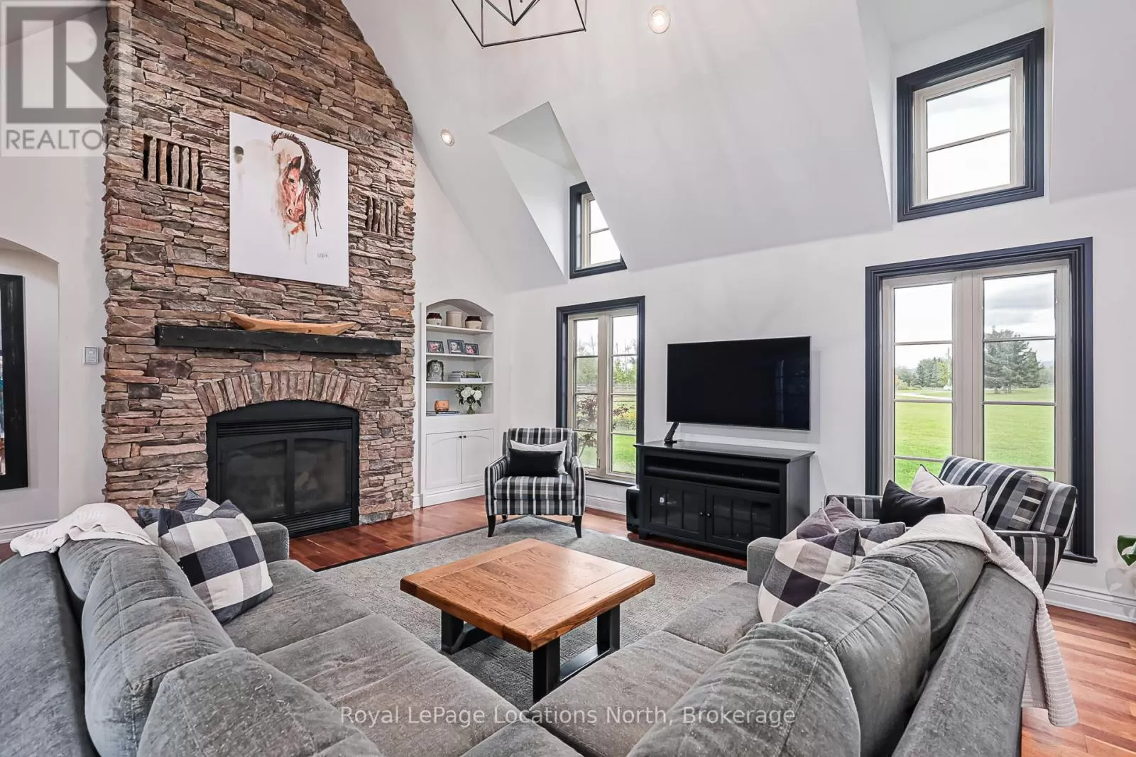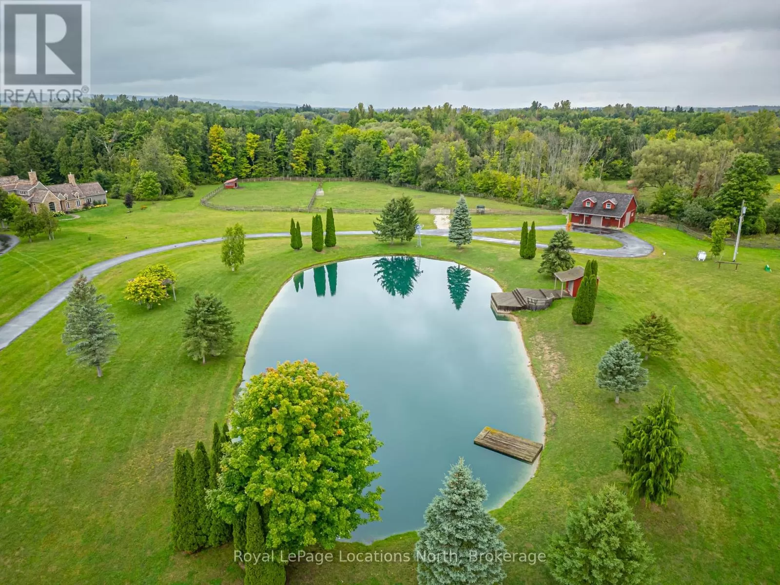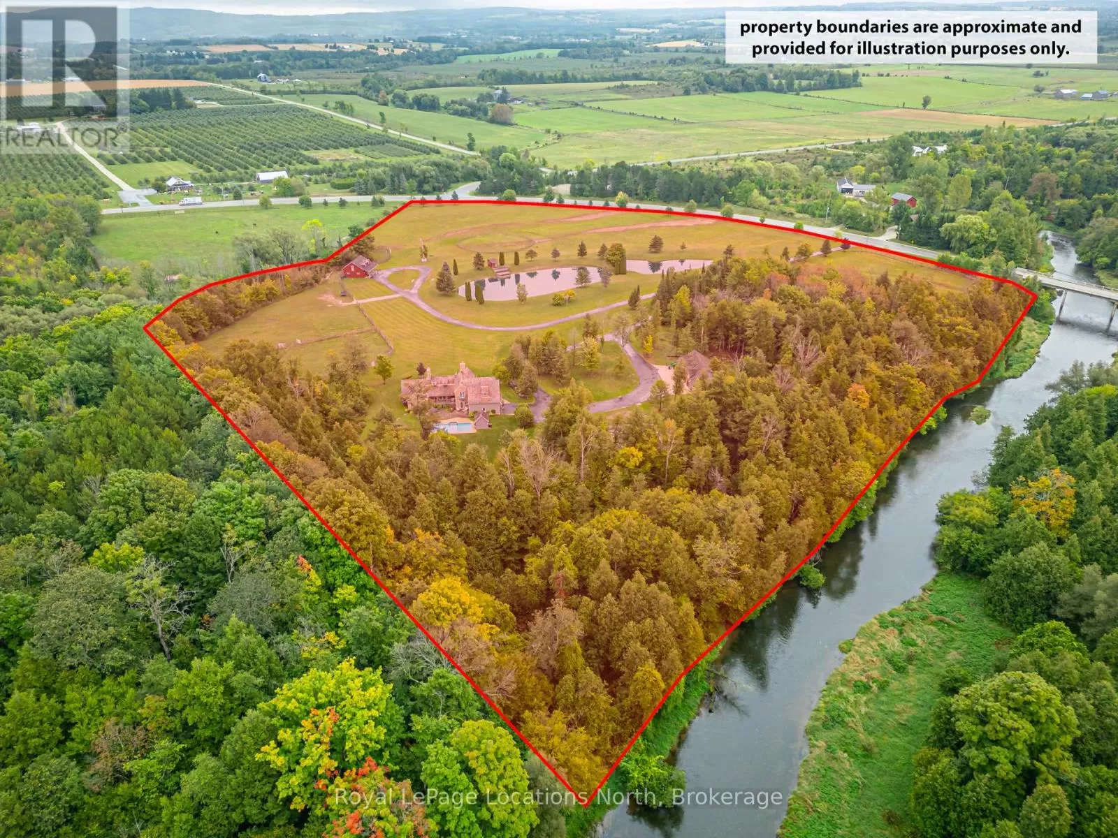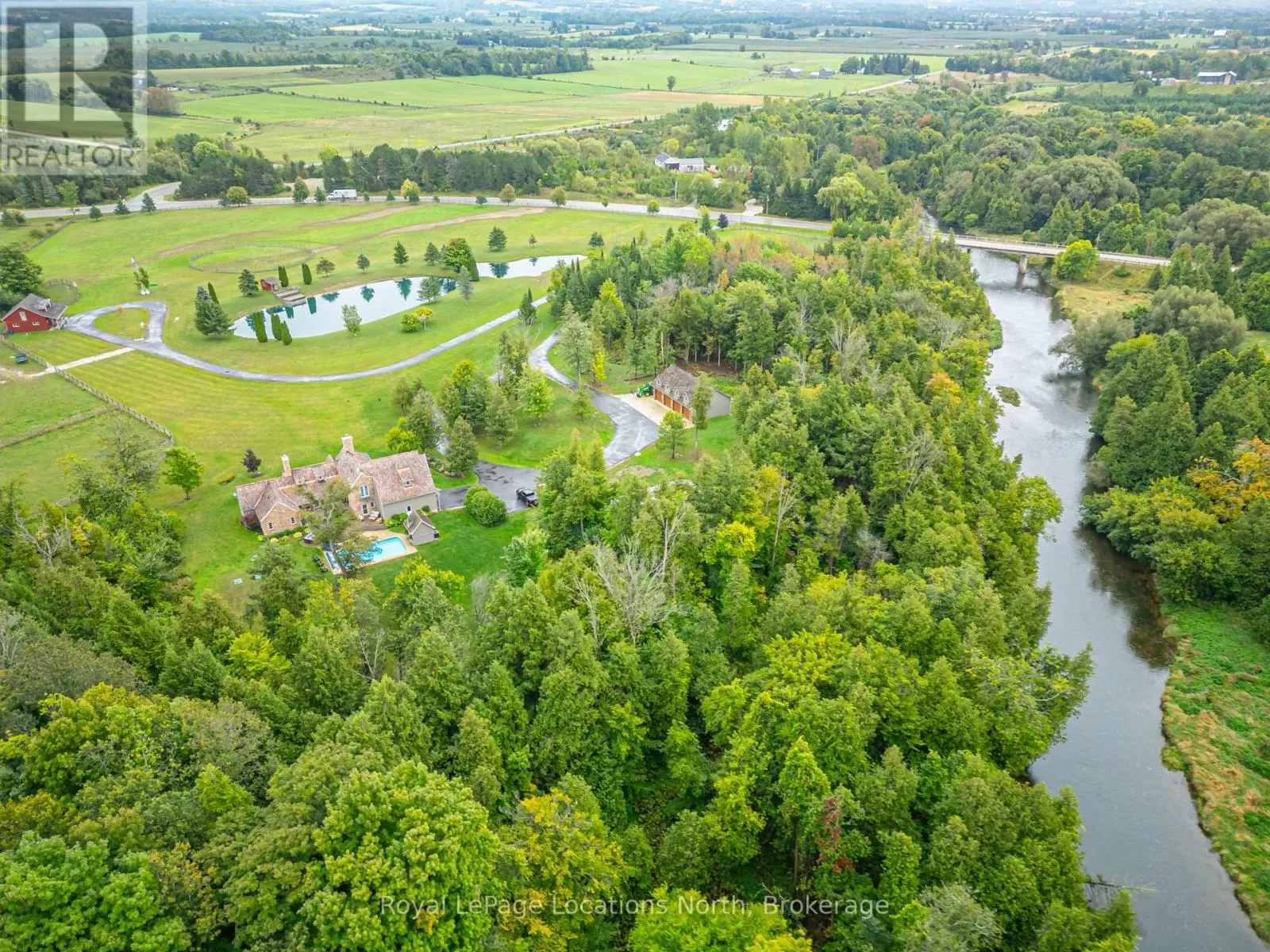 North side of Grey Rd.13 between Grey Rd 40 and Heathcote on the bend in road at 10th Line Rarely does a property of this caliber become available! Spanning 20 expansive acres just outside Thornbury and Clarksburg on Grey Rd. 13, this estate is a true gem. A newly paved, winding driveway leads you to a secluded residence thats been meticulously designed for comfort and style. The 3000+ square-foot home features a gourmet kitchen equipped with stainless steel appliances, honed marble counter tops, terracotta floors, and a fireplace surrounded by built-in cabinetry. The main floor primary bedroom boasts a generous en-suite bathroom and a spacious walk-in closet. The great room impresses with its soaring ceilings and another elegant fireplace. Currently serving as a music room, the formal dining area also includes a built-in office cupboard. Upstairs, you'll find two generously sized bedrooms, while the lower level offers a large gym and sauna. Several walkouts lead to a stunning 16x32 saltwater pool and a pool house. The cement pad is perfect for skating in winter and doubles as a pickleball court in warmer months. An attached double garage provides convenient access to both the main floor and lower level, while a detached 4-car garage with in-floor heating offers ample vehicle storage. The upstairs bonus space is finished, ideal for guest accommodations. A second winding paved driveway leads to the equestrian area, which features a remarkable 4-stall barn with hydro, water, and a spray-foamed loft. There are two paddock areas with shelters and a riding ring. A charming bunkie with tiered decking overlooks two picturesque ponds, and to complete this extraordinary property, the Beaver River gracefully flows along the entire western boundary! (id:27476)
