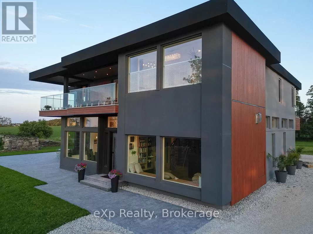 Cross Streets: 4th Line and 18th Sideroad. ** Directions: From Thornbury head southeast on Highway 26. Turn right and head south on Grey Road 2. Turn left and head east on Sideroad 21. Turn right and head south on 4 Line. Turn left and head east on Sideroad 18. Nestled on a private 24.82 acre ravine lot, this breathtaking escarpment estate offers glorious design, unparalleled serenity, and some of the most exquisite views The Blue Mountains has to offer. This stunning, eco-friendly home rose from a collection of sea cans brilliantly transformed into a luxurious property. Meticulously curated, it masterfully combines industrial steel with the warmth of natural wood elements, creating a cohesive and striking aesthetic.The bespoke stone-surface front door opens to a magnificent floating staircase crafted from steel and wood. The open-concept main floor is bathed in light which interacts dynamically with exposed corrugated steel. White oak flooring and natural accents beautifully complement the metalwork and harmonize with spectacular outdoor views. Featuring endless windows and a striking gold leaf accent wall, the kitchen and dining room lead to an expansive patio. A reading room invites relaxation by a 3-sided fireplace shaped from black granite from the west coast Canadian shield. The formal sitting area is open yet intimate. A sound-dampening wall of corrugated steel panels enhances the billiard and entertainment area. A spacious mudroom with separate entrance is ideal for ski and hiking gear.The second level is accessible by either stairs or a delightful glass-walled elevator. The handsome primary suite boasts a sumptuous bathroom with soaker tub and a balcony, both offering more unobstructed views of the bay. Solid cherry doors lead to two additional bedrooms, a gym, and a sauna with steam shower; a light filled balcony is designed to receive a jacuzzi. Independent guest accommodation, which can be configured with either one or two bedrooms, has its own separate entrance. This area can function as a standalone unit or be seamlessly integrated into the main house.Redefining strength and elegance, this home is born from imagination and designed to be in harmony with nature. It is at once restful, inspiring, and joyful. (id:27476)
