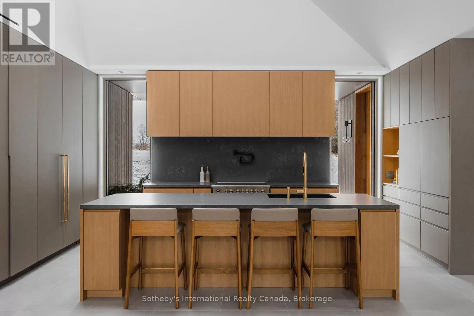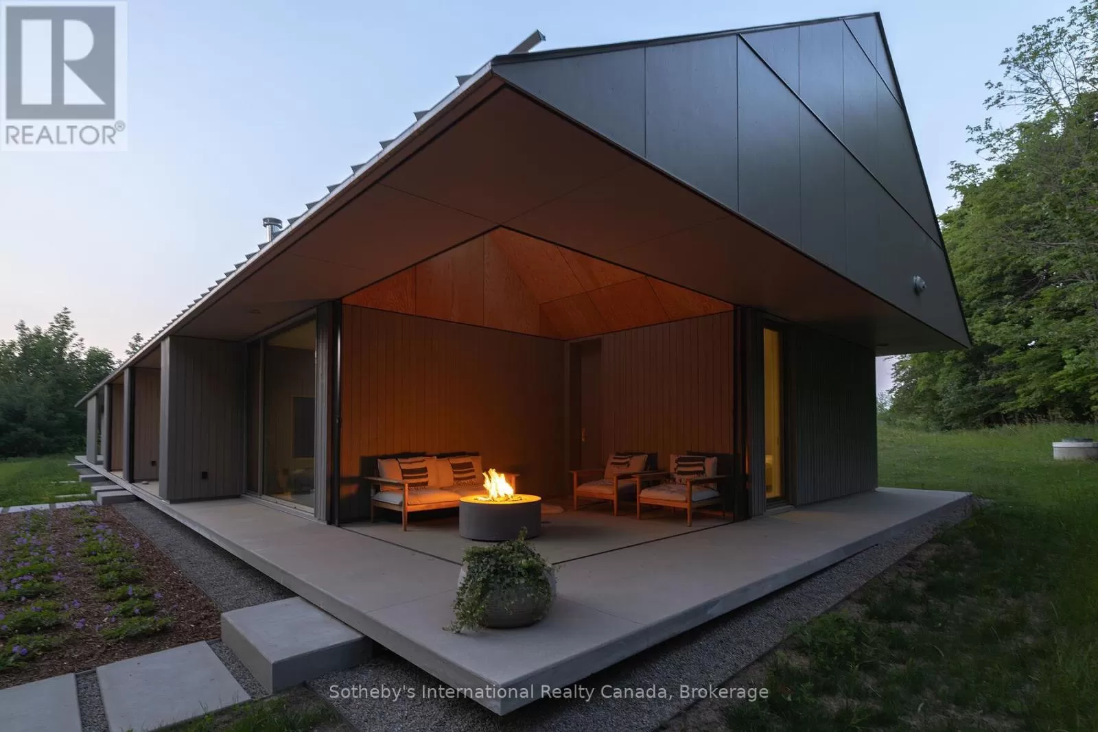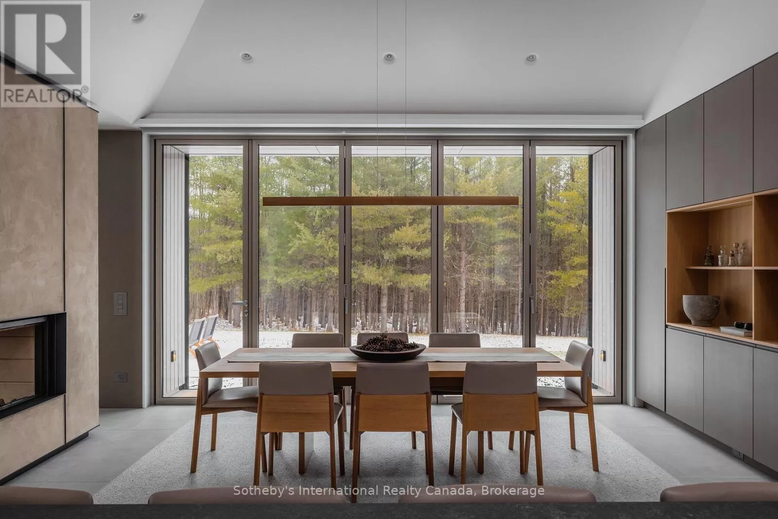Hwy 26 to Grey Rd 40, Turn left on Grey County Rd 2, Turn Right on Grey County Rd 119, Turn left on 11 Line Welcome to Ridge House, a stunning blend of minimalist architecture and modern living, set on 25 acres of pristine land in the tranquil hamlet of Ravenna. Designed to the exacting Passive House Standards by the renowned firm Superkul and built by John W. Gordon Custom Builders, this home seamlessly integrates with its natural surroundings of towering evergreens and peaceful woods. Nestled just below the property's highest ridge, Ridge House emerges naturally from the landscape, creating a sense of calm and seclusion. As you approach, the driveway disappears into the forest, and the distinctive roofline, floating among the trees, captures the eye. This thoughtful and intentional design makes Ridge House both visually striking and highly functional, a serene retreat where every detail enhances a connection to nature. Inside, the clean, open-concept layout highlights a relaxed, uncomplicated lifestyle. Natural light floods the living and dining areas, which flow effortlessly into the outdoors, blurring the lines between interior and exterior spaces. A dedicated office offers a peaceful work or relaxation space, while the spa-like bathroom, complete with a soaking tub that opens to a zen garden, provides a luxurious retreat. The single-level floor plan enhances the home's minimalist ethos, eliminating stairs for a smooth, fluid living experience. The primary bedroom, positioned at one end of the house, offers a private sanctuary, while guest rooms on the opposite side ensure privacy and comfort. A chef's kitchen, which blends functionality with beauty, anchors the space. A two-way STUV fireplace adds warmth and elegance, serving as a centerpiece that connects indoor and outdoor spaces. Ridge House isn't just a home; it's an invitation to experience a harmonious blend of modern design and natural beauty, where simplicity and sophistication meet. (id:27476)