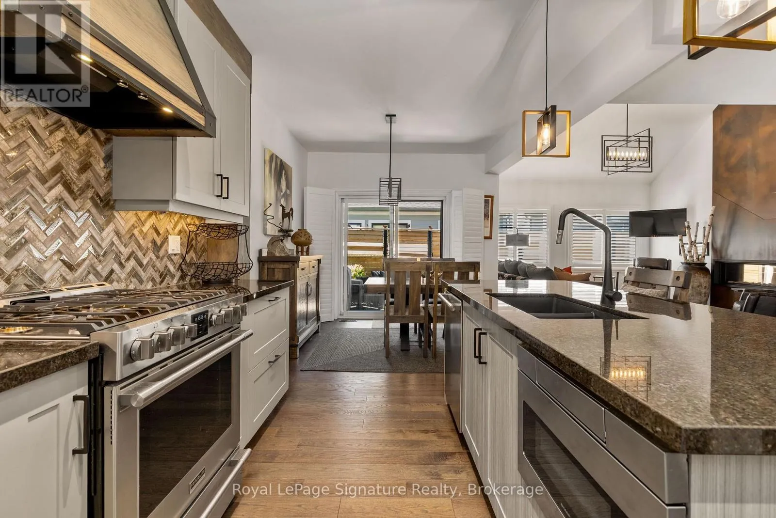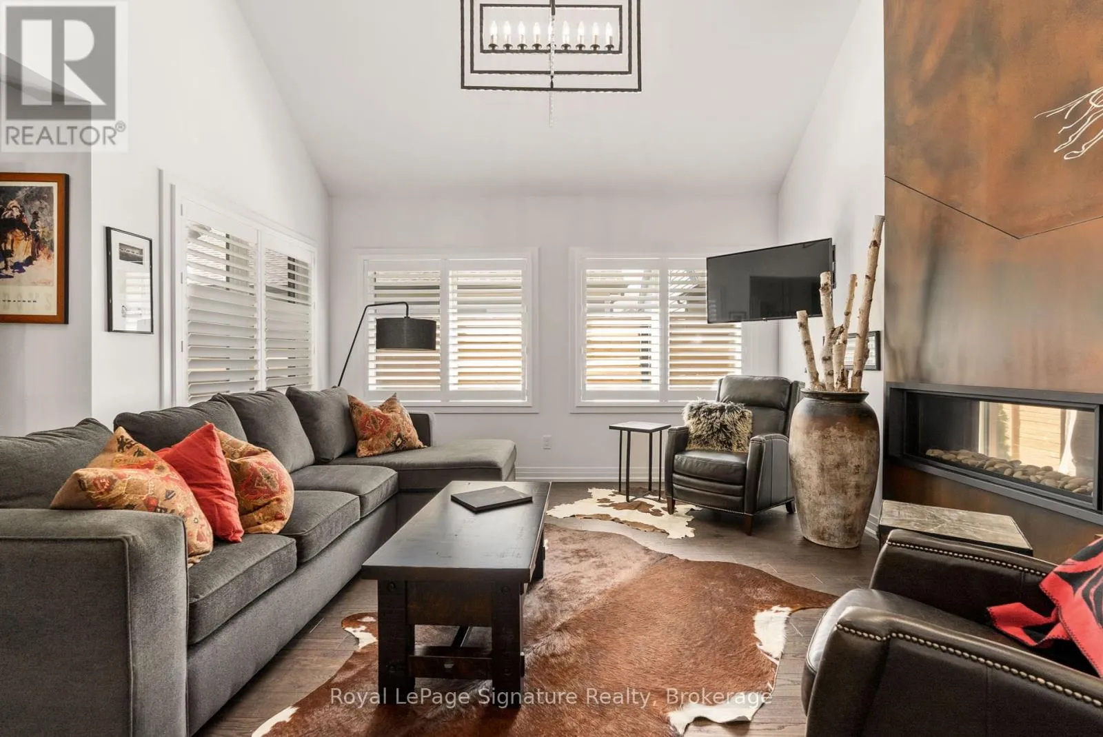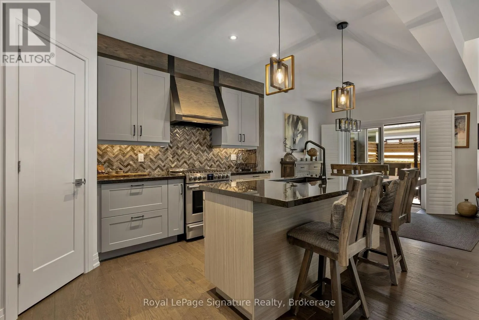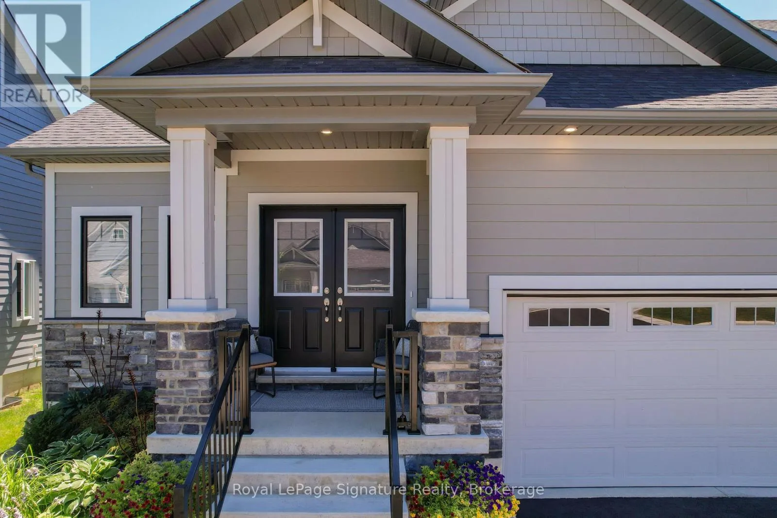 Cross Streets: Beacon Drive. ** Directions: Hwy 26 to Lora Bay Drive, straight at roundabout, left on Sunset Blvd, left on Beacon Drive, left on Clippers Lane. Just a 2-minute stroll to the private residents-only beach, this stunning home in The Cottages at Lora Bay, a prestigious waterfront community in Thornbury, blends upscale design with low-maintenance living in a vibrant, four-season setting. Thoughtfully upgraded throughout, the home features hardwood flooring on the main level, smooth ceilings, upgraded trim, doors, hardware, and custom lighting. The gourmet kitchen is a showstopper with thickened granite counters, walnut cabinetry details, rusted steel accents, and a full suite of Frigidaire Professional appliances, including a gas range with air-fry oven and Sharp microwave drawer. Under-cabinet lighting, added outlets, pot lights, and dimmers enhance function and flair. A custom two-sided gas fireplace serves as a striking focal point, with a dramatic floor-to-ceiling steel surround in the living room and a warm board and batten feature wall in the primary suite blending industrial edge, rustic character, and timeless charm. The serene suite includes a spa-like ensuite with in-floor heating, upgraded tile and cabinetry, and direct access to a full-width custom deck designed for privacy with shutters. Additional highlights include: custom window coverings and shutters, stone walkway and sealed, paved driveway edged in stone, fully landscaped yard with privacy panels, flower boxes, and mature plantings, 9-foot basement ceilings, laundry with stacked washer/dryer and cabinetry, festive lighting switch, surge protector, and more. Enjoy the unbeatable Lora Bay lifestyle, walk to the clubhouse restaurant for dinner, unwind in the residents gym, explore scenic trails, or spend your days by the water. This home offers refined comfort in a one-of-a-kind community, steps from Georgian Bay and minutes to downtown Thornbury. (id:27476)