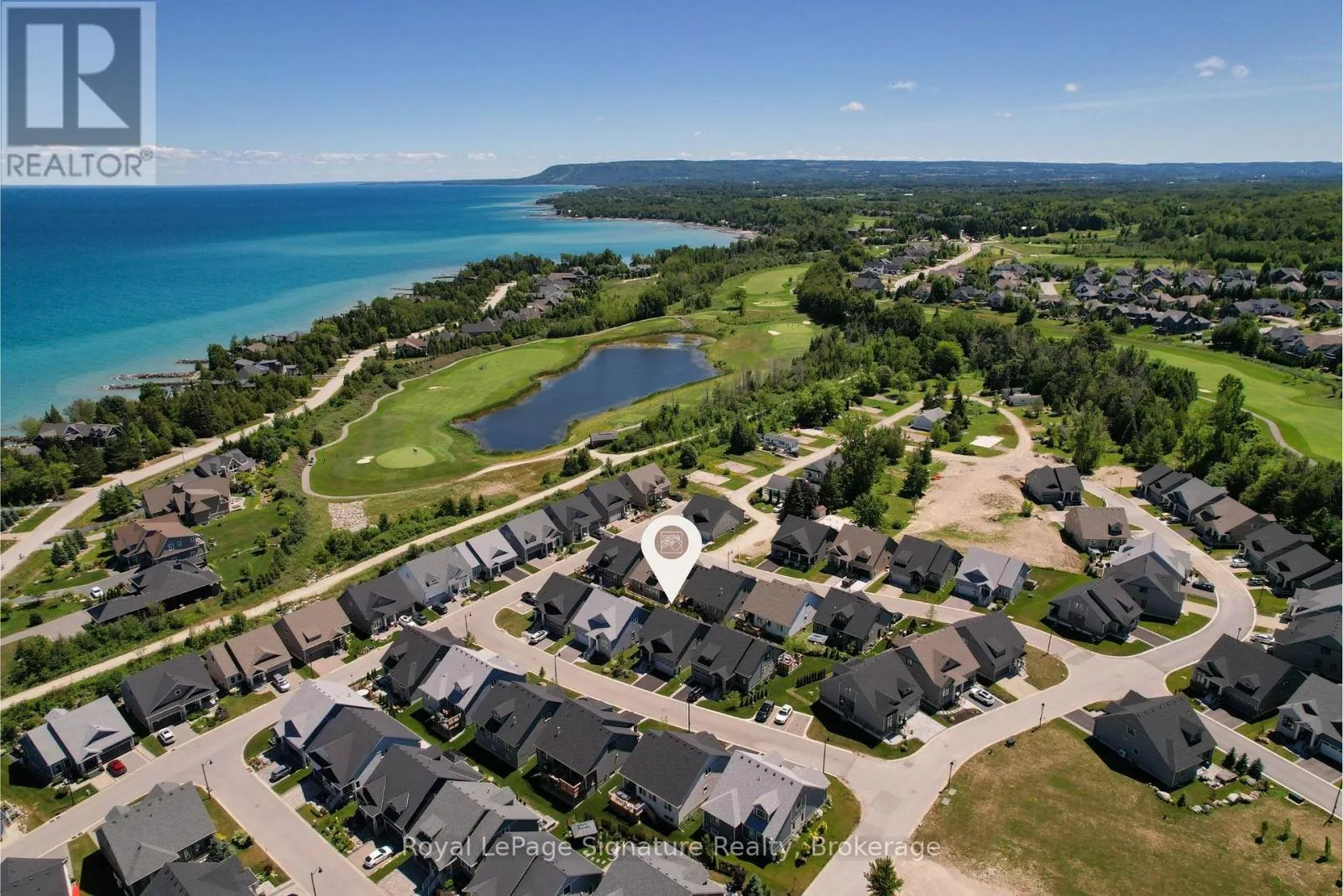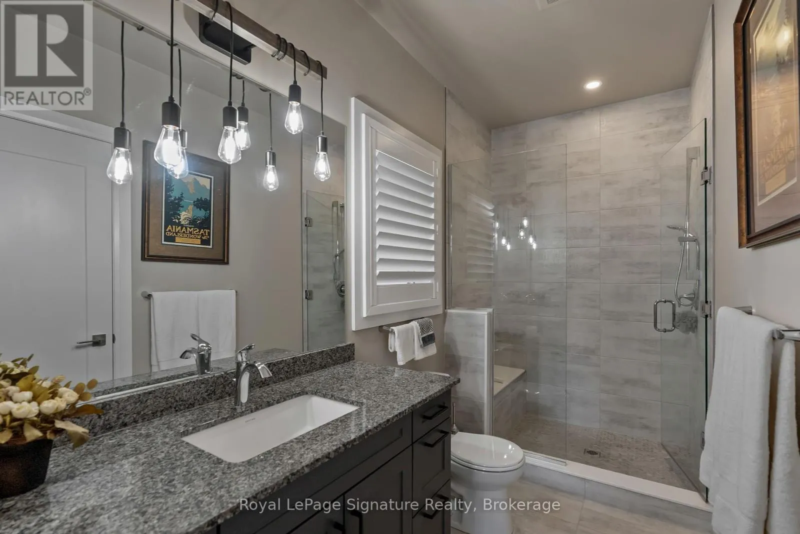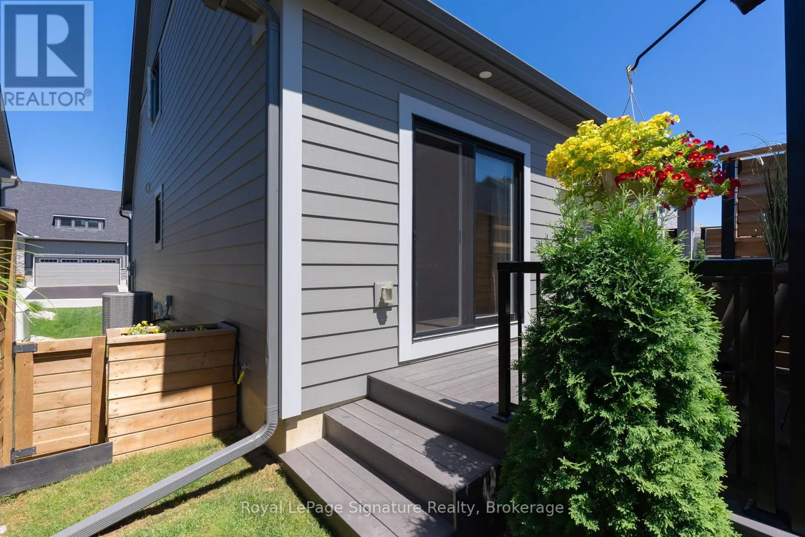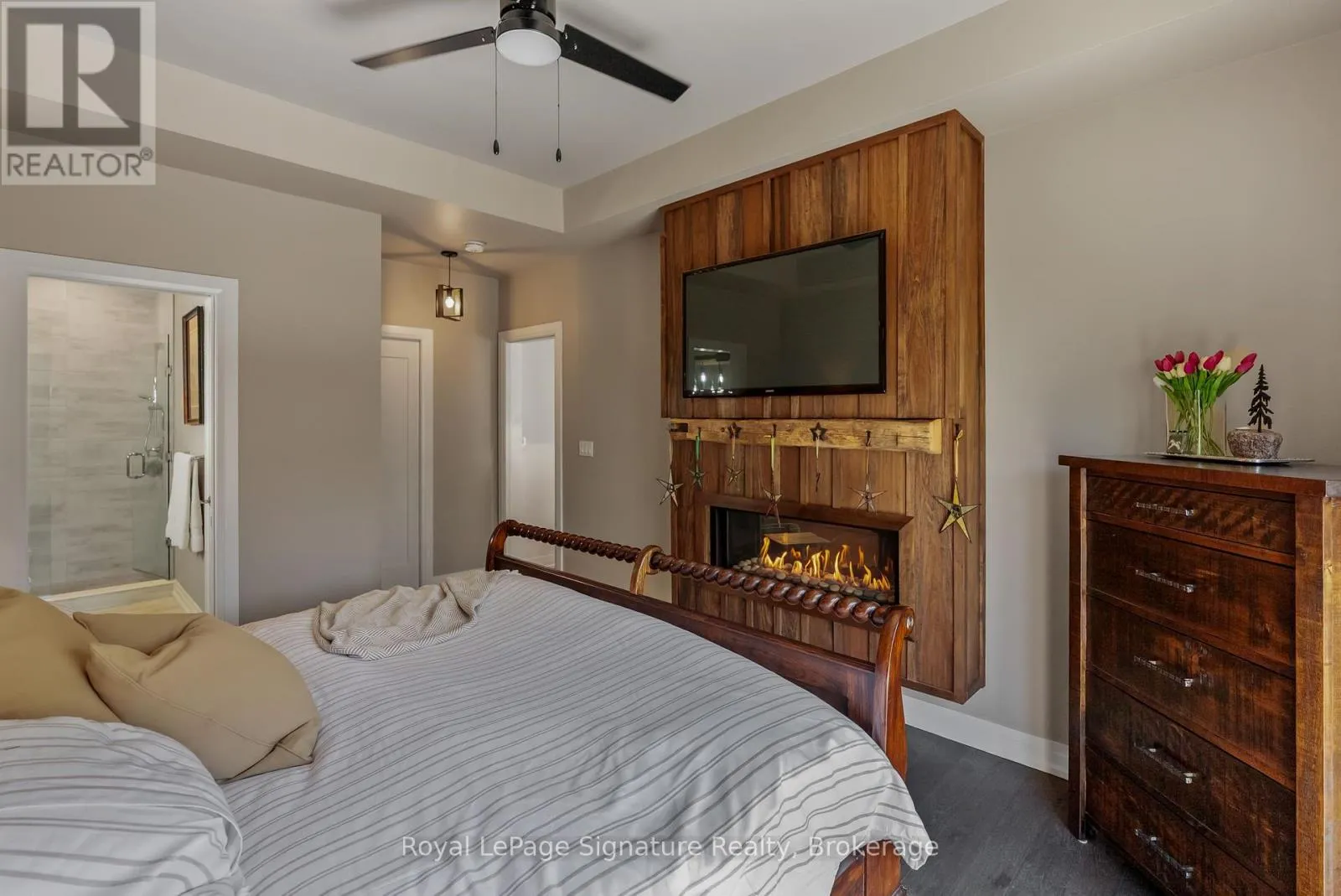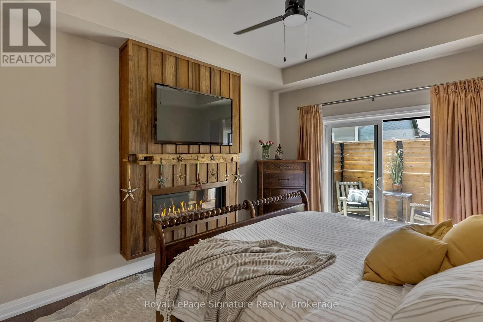 Cross Streets: Beacon Drive. ** Directions: Hwy 26 to Lora Bay Drive, straight at roundabout, left on Sunset Blvd, left on Beacon Drive, left on Clippers Lane. Just a 2-minute stroll to the private residents-only beach, this stunning home in The Cottages at Lora Bay, a prestigious waterfront community in Thornbury, blends upscale design with low-maintenance living in a vibrant, four-season setting. Thoughtfully upgraded throughout, the home features hardwood flooring on the main level, smooth ceilings, upgraded trim, doors, hardware, and custom lighting. The gourmet kitchen is a showstopper with thickened granite counters, walnut cabinetry details, rusted steel accents, and a full suite of Frigidaire Professional appliances, including a gas range with air-fry oven and Sharp microwave drawer. Under-cabinet lighting, added outlets, pot lights, and dimmers enhance function and flair. A custom two-sided gas fireplace serves as a striking focal point, with a dramatic floor-to-ceiling steel surround in the living room and a warm board and batten feature wall in the primary suite blending industrial edge, rustic character, and timeless charm. The serene suite includes a spa-like ensuite with in-floor heating, upgraded tile and cabinetry, and direct access to a full-width custom deck designed for privacy with shutters. Additional highlights include: custom window coverings and shutters, stone walkway and sealed, paved driveway edged in stone, fully landscaped yard with privacy panels, flower boxes, and mature plantings, 9-foot basement ceilings, laundry with stacked washer/dryer and cabinetry, festive lighting switch, surge protector, and more. Enjoy the unbeatable Lora Bay lifestyle, walk to the clubhouse restaurant for dinner, unwind in the residents gym, explore scenic trails, or spend your days by the water. This home offers refined comfort in a one-of-a-kind community, steps from Georgian Bay and minutes to downtown Thornbury. (id:27476)