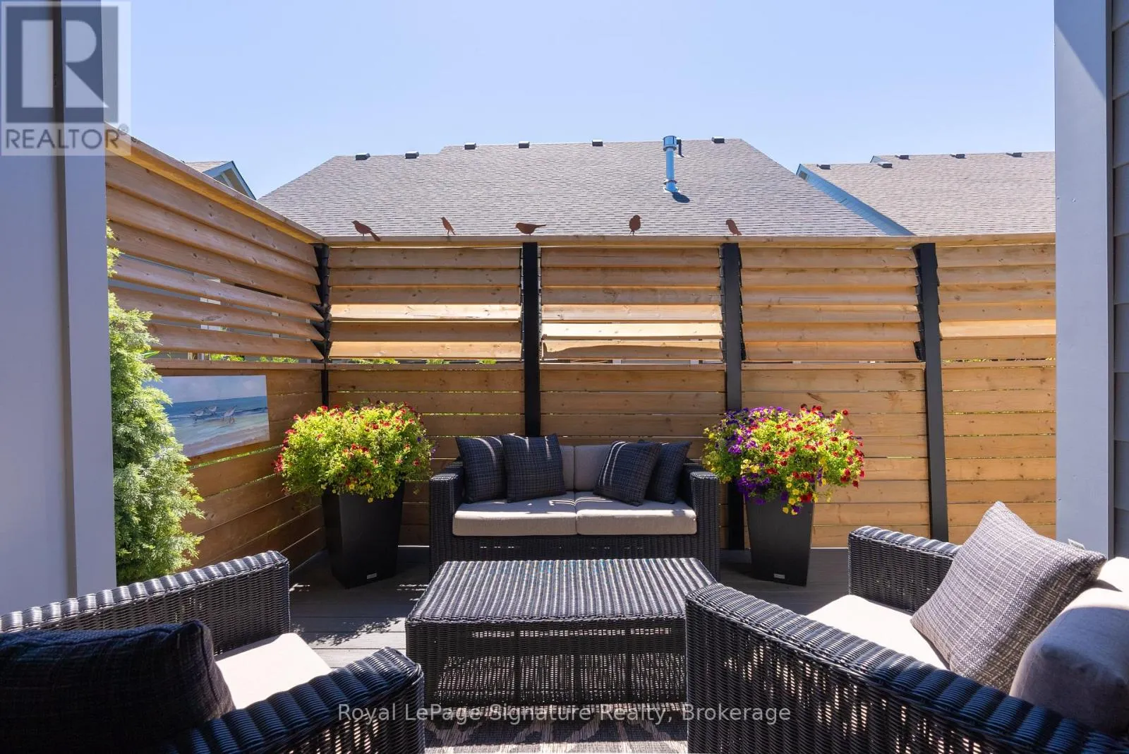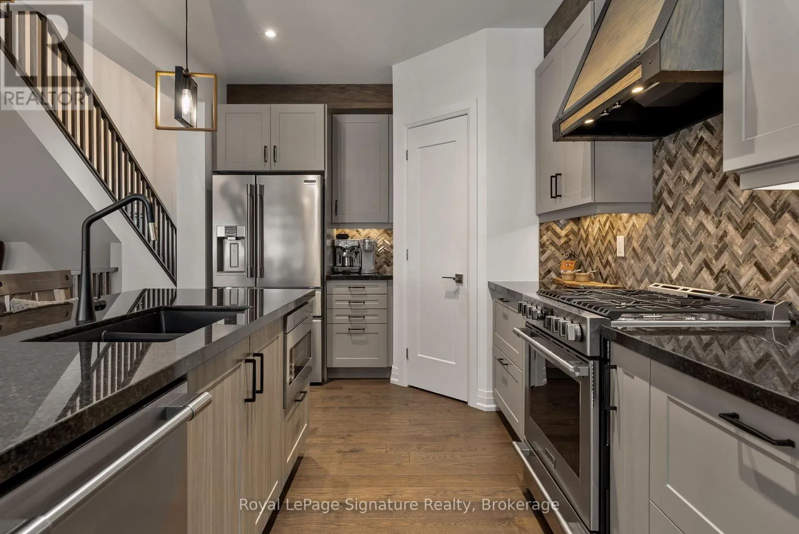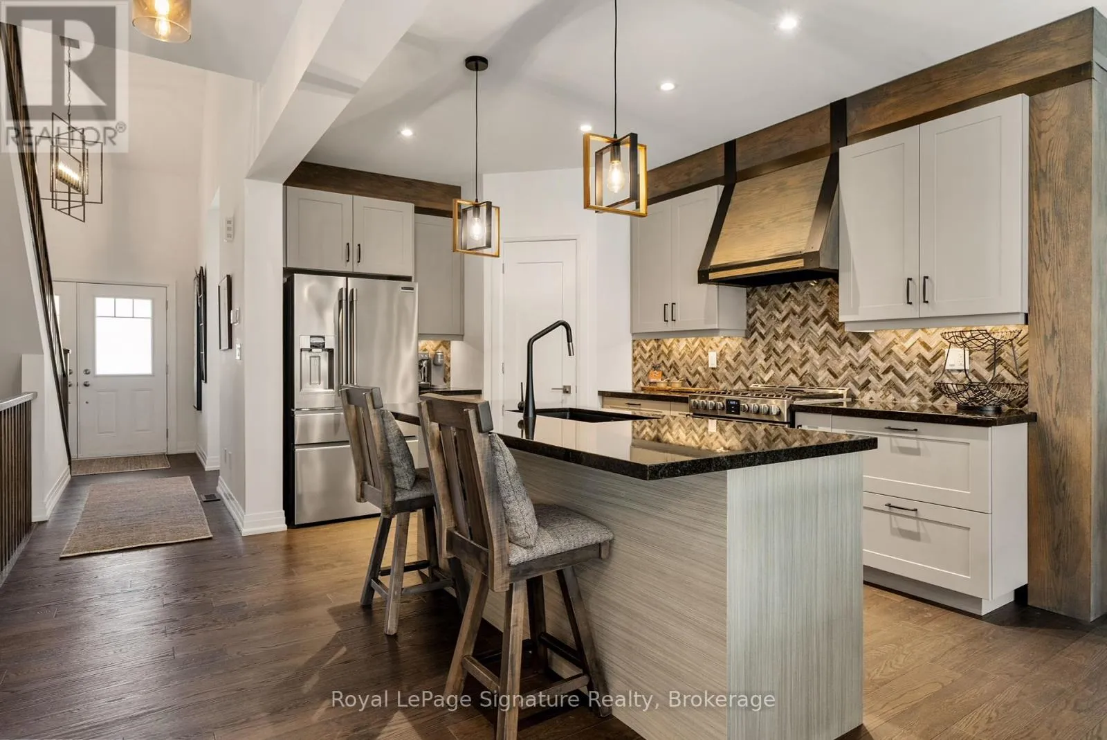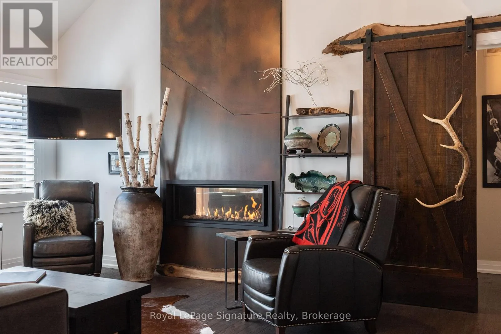 Cross Streets: Beacon Drive. ** Directions: Hwy 26 to Lora Bay Drive, straight at roundabout, left on Sunset Blvd, left on Beacon Drive, left on Clippers Lane. Just a 2-minute stroll to the private residents-only beach, this stunning home in The Cottages at Lora Bay, a prestigious waterfront community in Thornbury, blends upscale design with low-maintenance living in a vibrant, four-season setting. Thoughtfully upgraded throughout, the home features hardwood flooring on the main level, smooth ceilings, upgraded trim, doors, hardware, and custom lighting. The gourmet kitchen is a showstopper with thickened granite counters, walnut cabinetry details, rusted steel accents, and a full suite of Frigidaire Professional appliances, including a gas range with air-fry oven and Sharp microwave drawer. Under-cabinet lighting, added outlets, pot lights, and dimmers enhance function and flair. A custom two-sided gas fireplace serves as a striking focal point, with a dramatic floor-to-ceiling steel surround in the living room and a warm board and batten feature wall in the primary suite blending industrial edge, rustic character, and timeless charm. The serene suite includes a spa-like ensuite with in-floor heating, upgraded tile and cabinetry, and direct access to a full-width custom deck designed for privacy with shutters. Additional highlights include: custom window coverings and shutters, stone walkway and sealed, paved driveway edged in stone, fully landscaped yard with privacy panels, flower boxes, and mature plantings, 9-foot basement ceilings, laundry with stacked washer/dryer and cabinetry, festive lighting switch, surge protector, and more. Enjoy the unbeatable Lora Bay lifestyle, walk to the clubhouse restaurant for dinner, unwind in the residents gym, explore scenic trails, or spend your days by the water. This home offers refined comfort in a one-of-a-kind community, steps from Georgian Bay and minutes to downtown Thornbury. (id:27476)