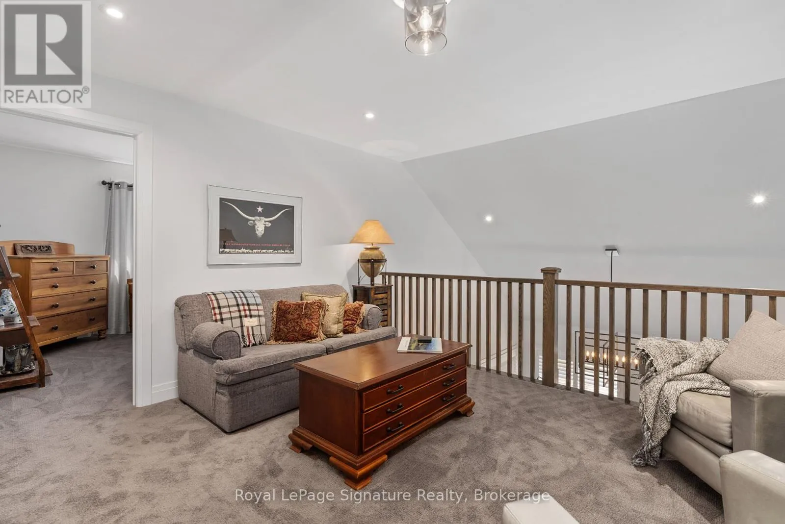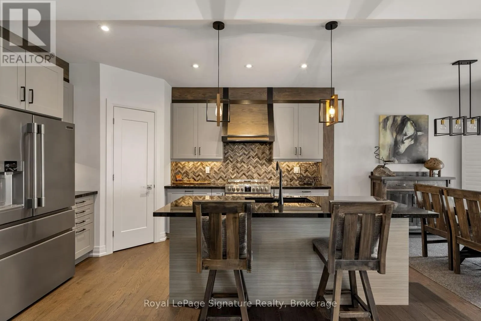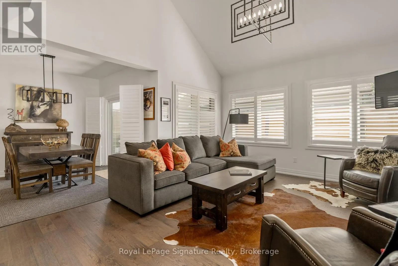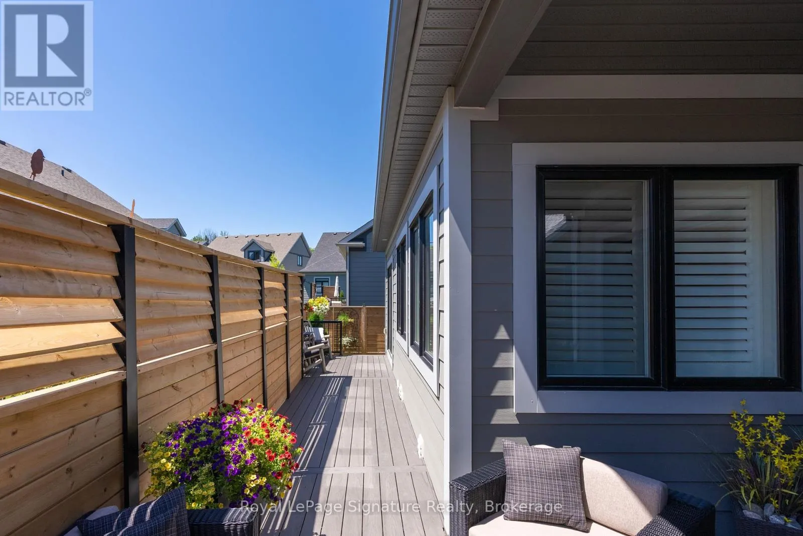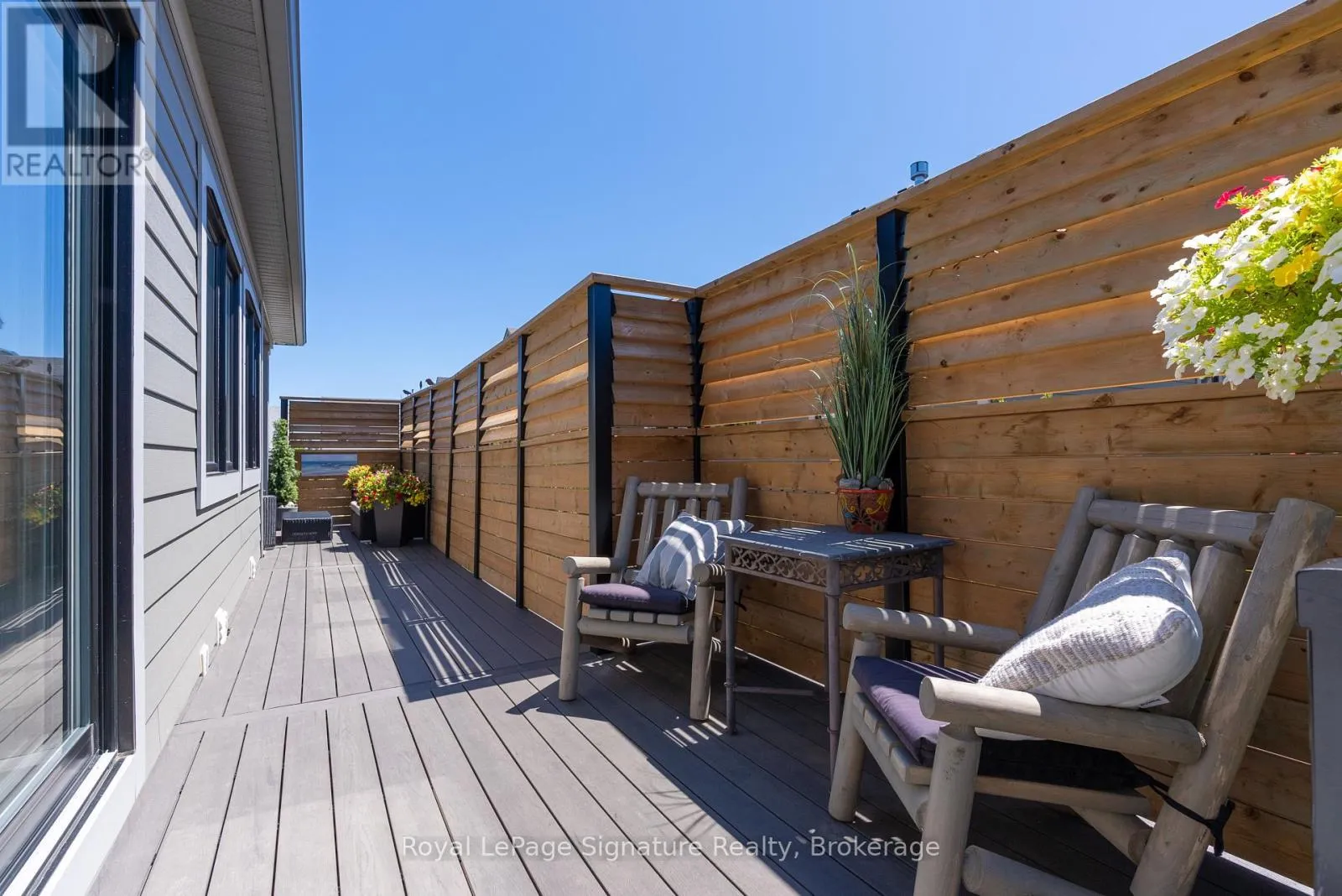 Cross Streets: Beacon Drive. ** Directions: Hwy 26 to Lora Bay Drive, straight at roundabout, left on Sunset Blvd, left on Beacon Drive, left on Clippers Lane. Just a 2-minute stroll to the private residents-only beach, this stunning home in The Cottages at Lora Bay, a prestigious waterfront community in Thornbury, blends upscale design with low-maintenance living in a vibrant, four-season setting. Thoughtfully upgraded throughout, the home features hardwood flooring on the main level, smooth ceilings, upgraded trim, doors, hardware, and custom lighting. The gourmet kitchen is a showstopper with thickened granite counters, walnut cabinetry details, rusted steel accents, and a full suite of Frigidaire Professional appliances, including a gas range with air-fry oven and Sharp microwave drawer. Under-cabinet lighting, added outlets, pot lights, and dimmers enhance function and flair. A custom two-sided gas fireplace serves as a striking focal point, with a dramatic floor-to-ceiling steel surround in the living room and a warm board and batten feature wall in the primary suite blending industrial edge, rustic character, and timeless charm. The serene suite includes a spa-like ensuite with in-floor heating, upgraded tile and cabinetry, and direct access to a full-width custom deck designed for privacy with shutters. Additional highlights include: custom window coverings and shutters, stone walkway and sealed, paved driveway edged in stone, fully landscaped yard with privacy panels, flower boxes, and mature plantings, 9-foot basement ceilings, laundry with stacked washer/dryer and cabinetry, festive lighting switch, surge protector, and more. Enjoy the unbeatable Lora Bay lifestyle, walk to the clubhouse restaurant for dinner, unwind in the residents gym, explore scenic trails, or spend your days by the water. This home offers refined comfort in a one-of-a-kind community, steps from Georgian Bay and minutes to downtown Thornbury. (id:27476)