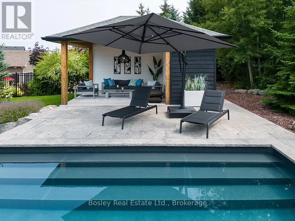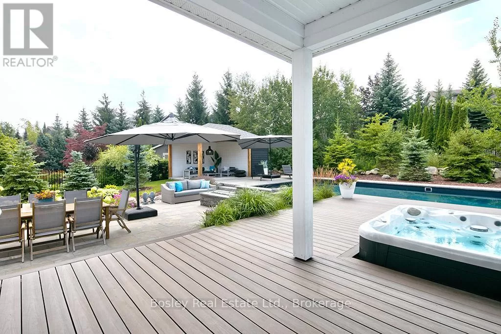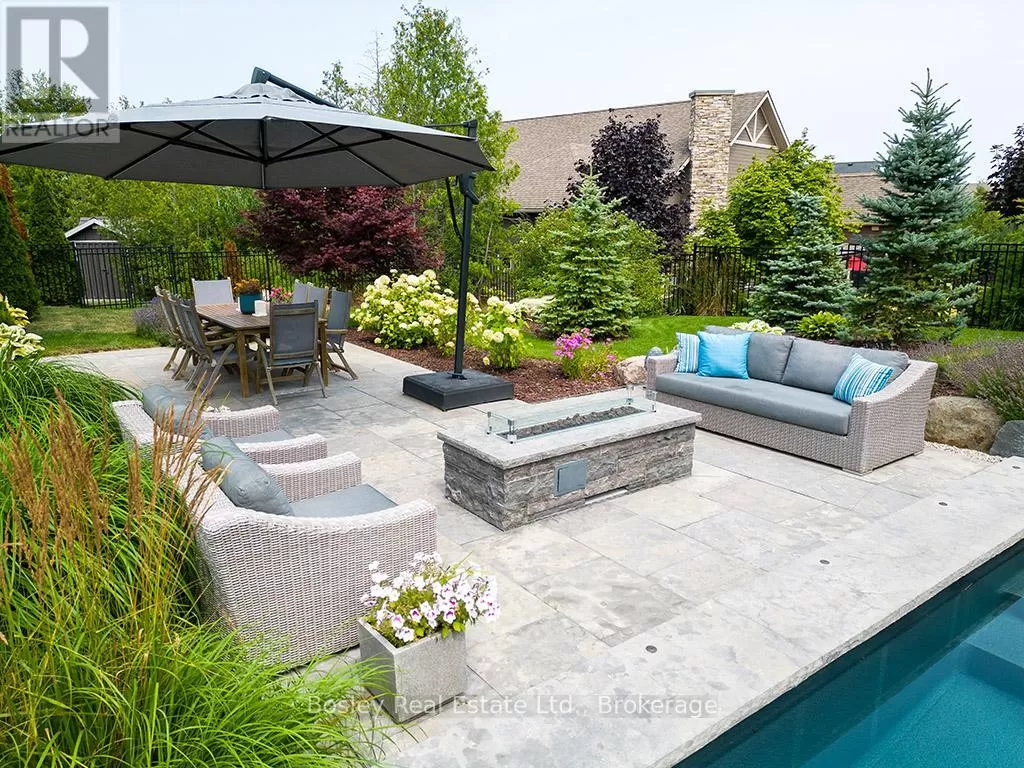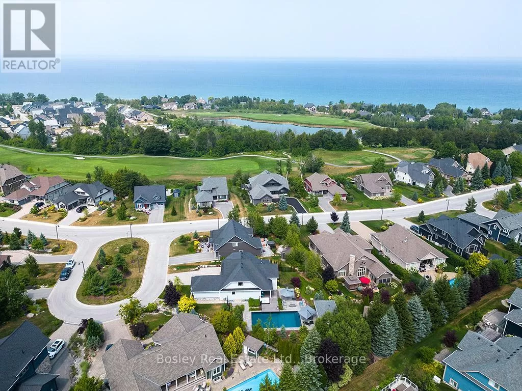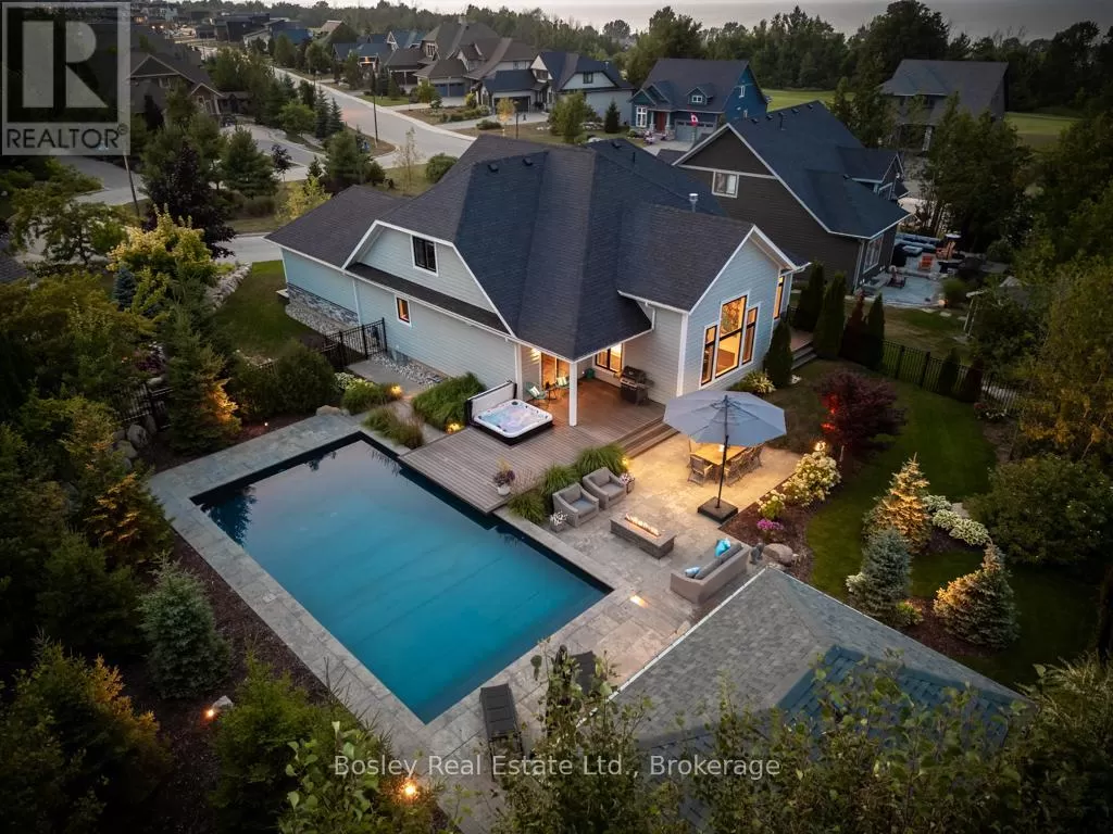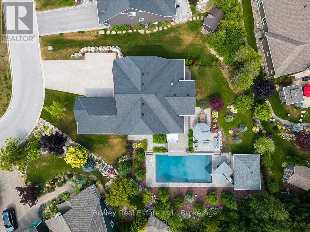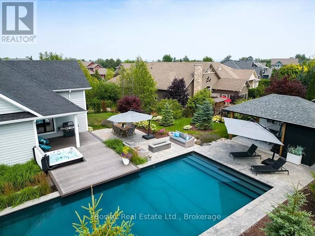 Cross Streets: West Ridge. ** Directions: From West Ridge turn on to McCallum Crt. Tucked away on a quiet cul de sac in the prestigious Lora Bay community, this exceptional residence, built by Reids Heritage Homes in 2019, pairs elegant design with thoughtful upgrades and resort-style outdoor living. Backing onto mature trees, the home offers rare privacy and tranquility just minutes from Georgian Bay, golf, skiing, and the shops and restaurants of Thornbury.A covered front porch opens into a refined foyer with updated tile (2025), setting the tone for the elevated finishes throughout. A custom home office with built-in cabinetry and millwork (2022) sits just off the entry, while the newly renovated powder room (2025) adds a modern touch for guests.The great room is the heart of the home, with soaring ceilings, a gas fireplace, and oversized windows overlooking the manicured backyard. The chefs kitchen features quartz counters, high-end appliances, a walk-in pantry, and a butlers pantry connecting to the mudroom, laundry, and two-car garage.The main-floor primary suite offers serene garden views, a walk-in closet, and a spa-like ensuite with double vanities, a soaking tub, and glass shower.Step outside to your private oasis: a covered deck for dining and lounging, lush gardens, a built-in hot tub, and a heated saltwater pool installed in 2020 by Clear Choice. This showstopping outdoor space was awarded second place in the 2021 North American Inground Pool Design Awards.Upstairs, a versatile loft-style family room, two spacious guest suites, and a five-piece bath provide comfort and space.The fully finished basement includes a large recreation room with a gas fireplace, custom wet bar, built-ins, a guest bedroom, four-piece bath, home gym or optional fifth bedroom, and ample storage.Residents of Lora Bay enjoy a vibrant community with access to a championship golf course, scenic walking trails, and Georgian Bay just moments away. (id:27476)