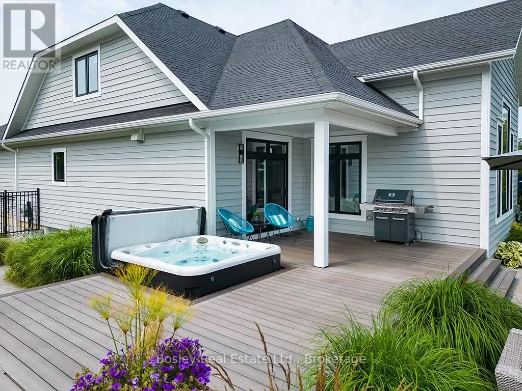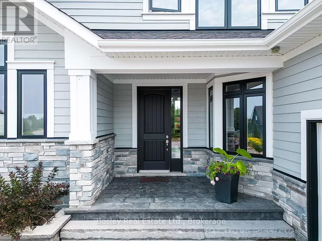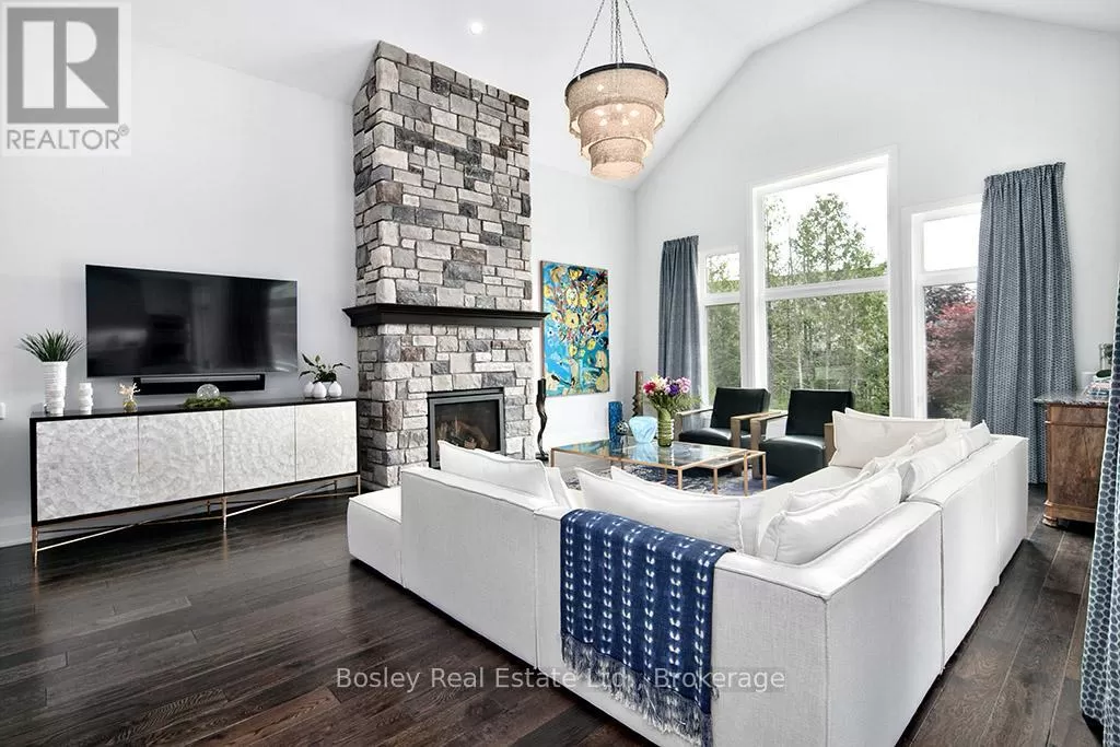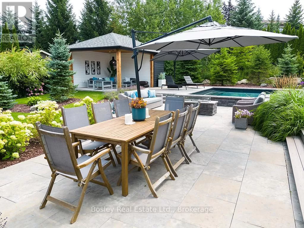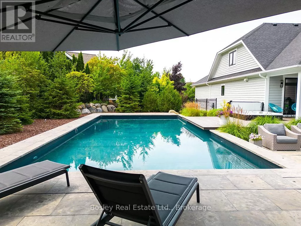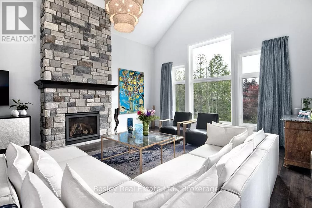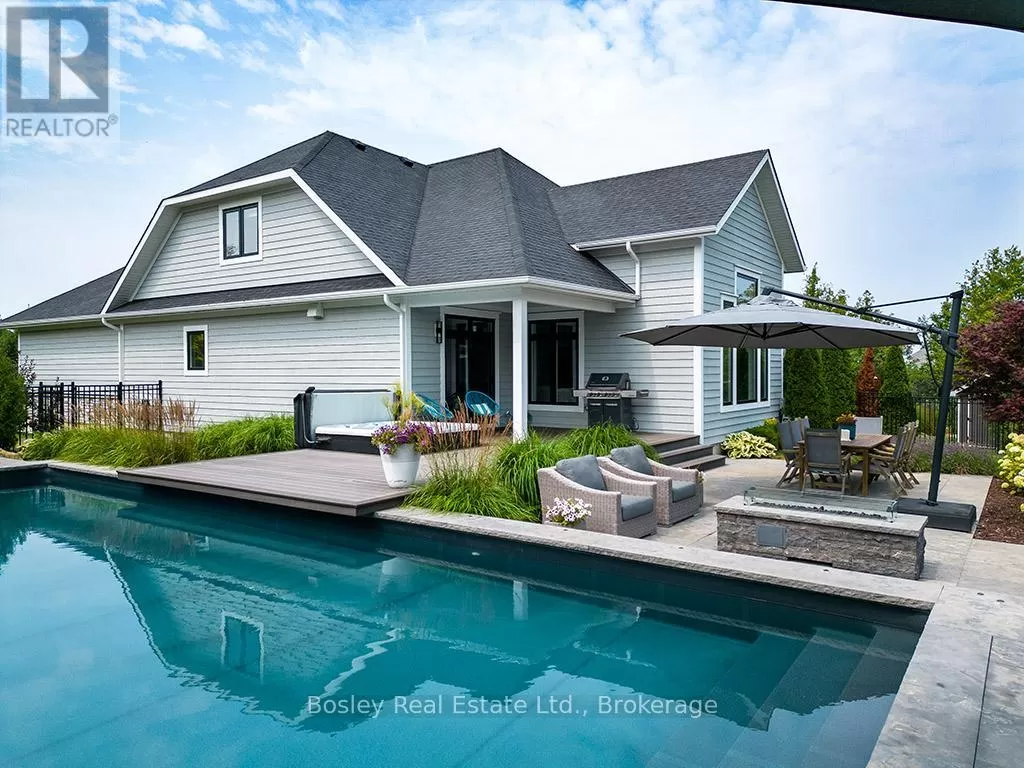 Cross Streets: West Ridge. ** Directions: From West Ridge turn on to McCallum Crt. Tucked away on a quiet cul de sac in the prestigious Lora Bay community, this exceptional residence, built by Reids Heritage Homes in 2019, pairs elegant design with thoughtful upgrades and resort-style outdoor living. Backing onto mature trees, the home offers rare privacy and tranquility just minutes from Georgian Bay, golf, skiing, and the shops and restaurants of Thornbury.A covered front porch opens into a refined foyer with updated tile (2025), setting the tone for the elevated finishes throughout. A custom home office with built-in cabinetry and millwork (2022) sits just off the entry, while the newly renovated powder room (2025) adds a modern touch for guests.The great room is the heart of the home, with soaring ceilings, a gas fireplace, and oversized windows overlooking the manicured backyard. The chefs kitchen features quartz counters, high-end appliances, a walk-in pantry, and a butlers pantry connecting to the mudroom, laundry, and two-car garage.The main-floor primary suite offers serene garden views, a walk-in closet, and a spa-like ensuite with double vanities, a soaking tub, and glass shower.Step outside to your private oasis: a covered deck for dining and lounging, lush gardens, a built-in hot tub, and a heated saltwater pool installed in 2020 by Clear Choice. This showstopping outdoor space was awarded second place in the 2021 North American Inground Pool Design Awards.Upstairs, a versatile loft-style family room, two spacious guest suites, and a five-piece bath provide comfort and space.The fully finished basement includes a large recreation room with a gas fireplace, custom wet bar, built-ins, a guest bedroom, four-piece bath, home gym or optional fifth bedroom, and ample storage.Residents of Lora Bay enjoy a vibrant community with access to a championship golf course, scenic walking trails, and Georgian Bay just moments away. (id:27476)