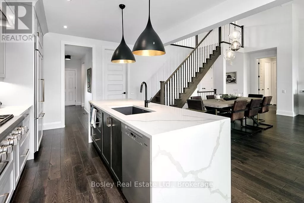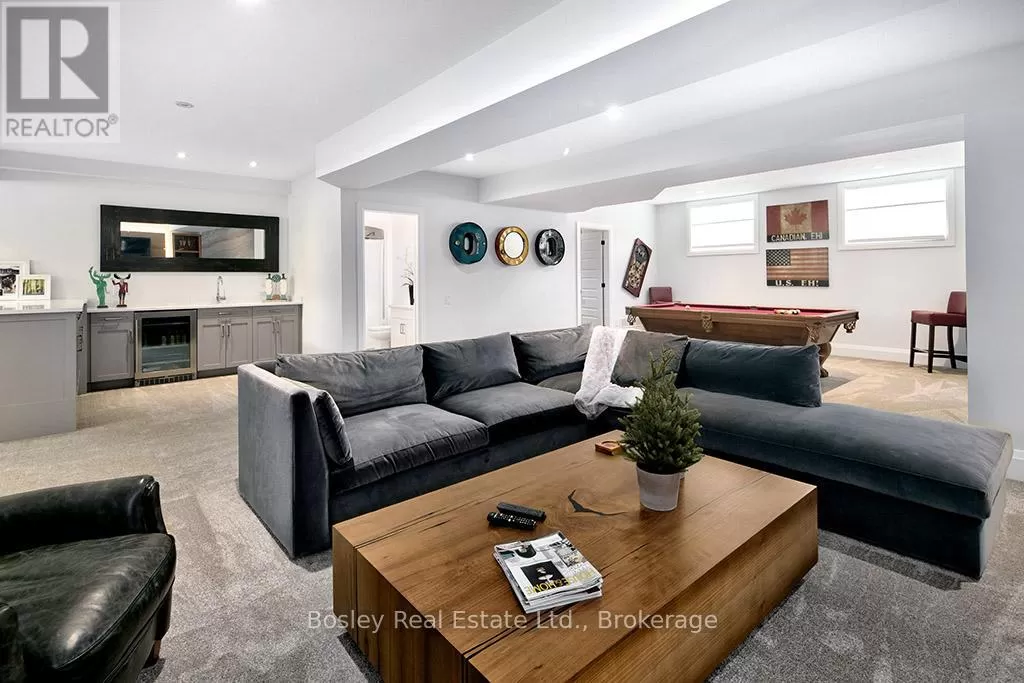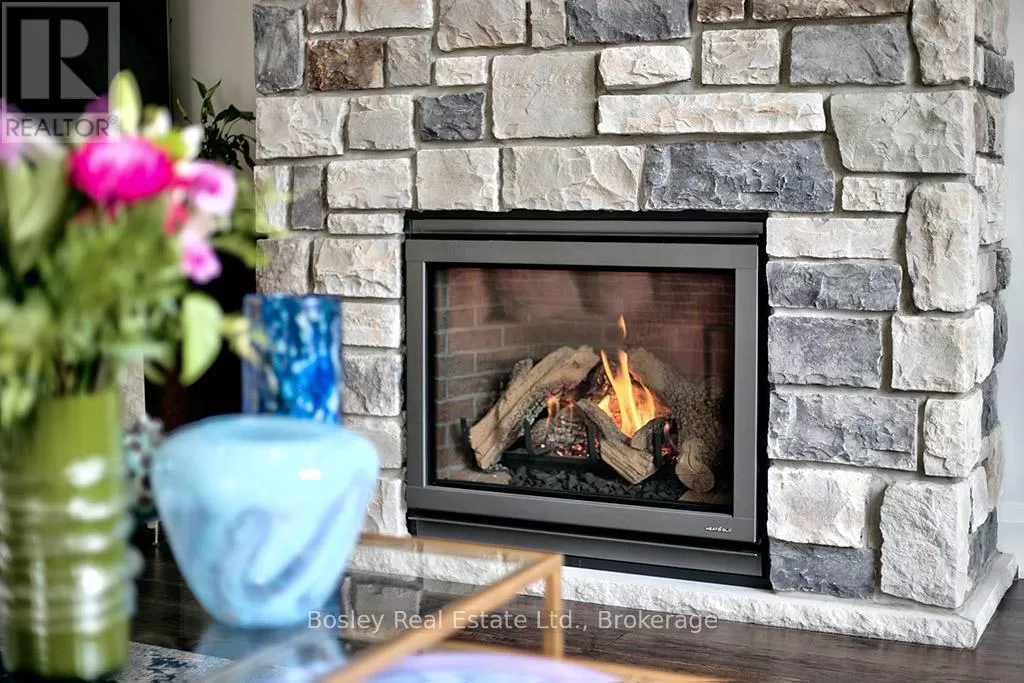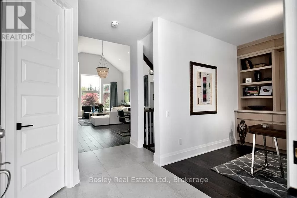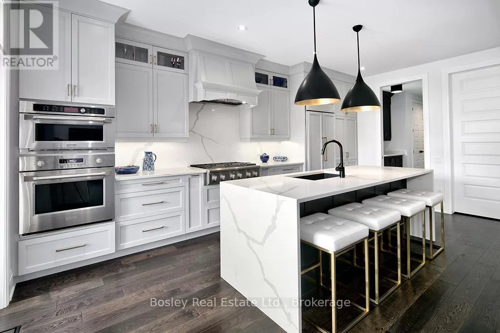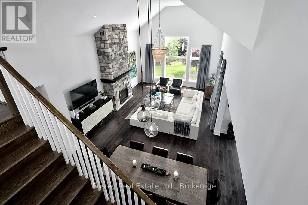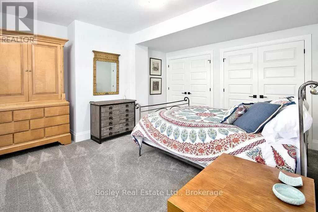 Cross Streets: West Ridge. ** Directions: From West Ridge turn on to McCallum Crt. Tucked away on a quiet cul de sac in the prestigious Lora Bay community, this exceptional residence, built by Reids Heritage Homes in 2019, pairs elegant design with thoughtful upgrades and resort-style outdoor living. Backing onto mature trees, the home offers rare privacy and tranquility just minutes from Georgian Bay, golf, skiing, and the shops and restaurants of Thornbury.A covered front porch opens into a refined foyer with updated tile (2025), setting the tone for the elevated finishes throughout. A custom home office with built-in cabinetry and millwork (2022) sits just off the entry, while the newly renovated powder room (2025) adds a modern touch for guests.The great room is the heart of the home, with soaring ceilings, a gas fireplace, and oversized windows overlooking the manicured backyard. The chefs kitchen features quartz counters, high-end appliances, a walk-in pantry, and a butlers pantry connecting to the mudroom, laundry, and two-car garage.The main-floor primary suite offers serene garden views, a walk-in closet, and a spa-like ensuite with double vanities, a soaking tub, and glass shower.Step outside to your private oasis: a covered deck for dining and lounging, lush gardens, a built-in hot tub, and a heated saltwater pool installed in 2020 by Clear Choice. This showstopping outdoor space was awarded second place in the 2021 North American Inground Pool Design Awards.Upstairs, a versatile loft-style family room, two spacious guest suites, and a five-piece bath provide comfort and space.The fully finished basement includes a large recreation room with a gas fireplace, custom wet bar, built-ins, a guest bedroom, four-piece bath, home gym or optional fifth bedroom, and ample storage.Residents of Lora Bay enjoy a vibrant community with access to a championship golf course, scenic walking trails, and Georgian Bay just moments away. (id:27476)
