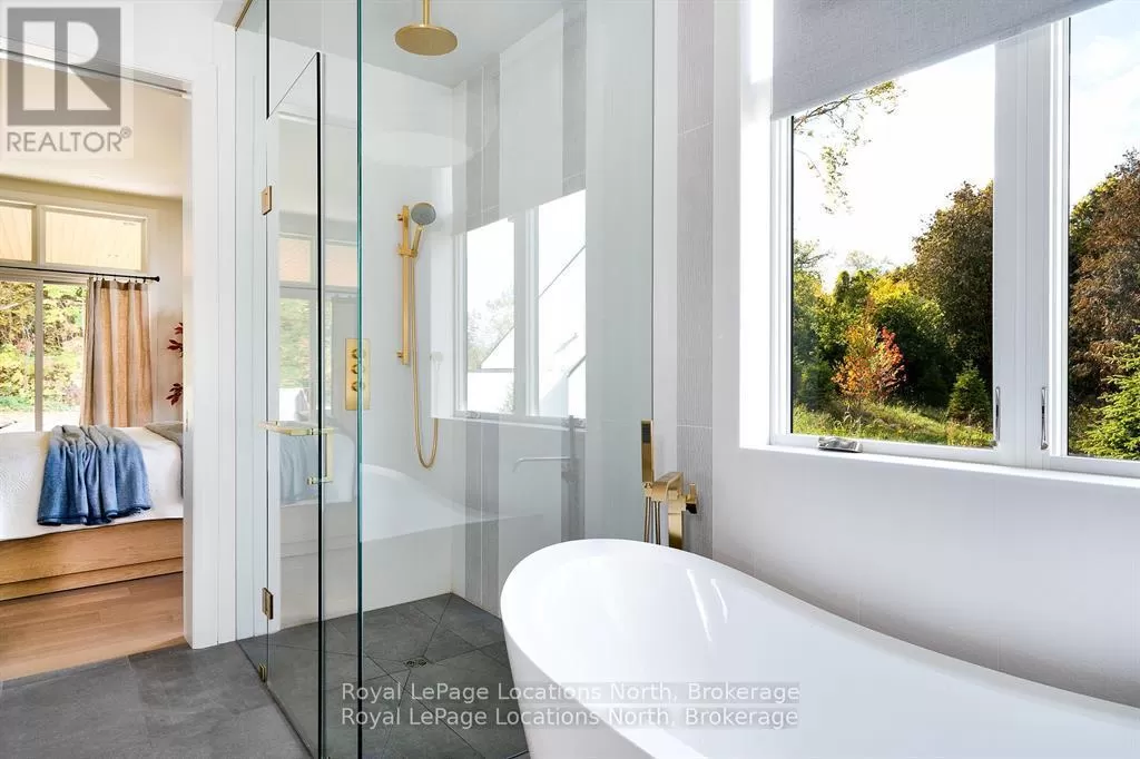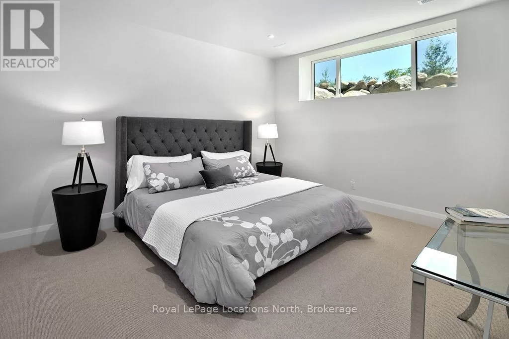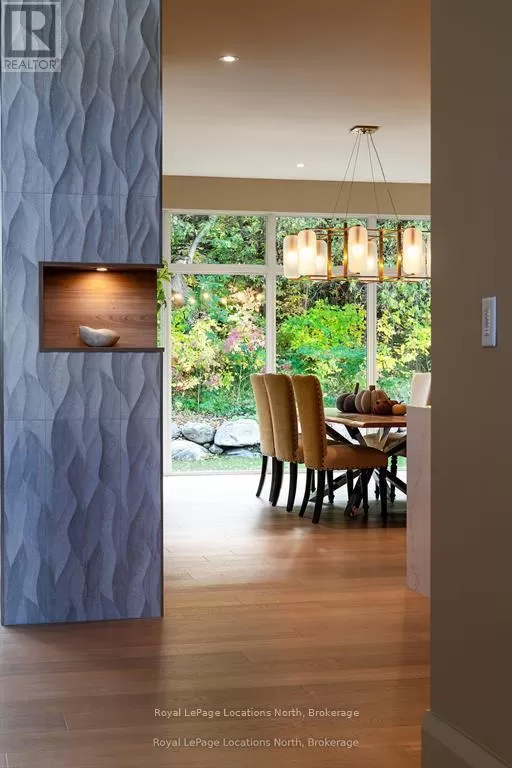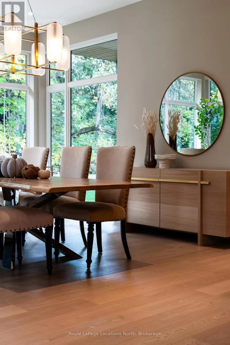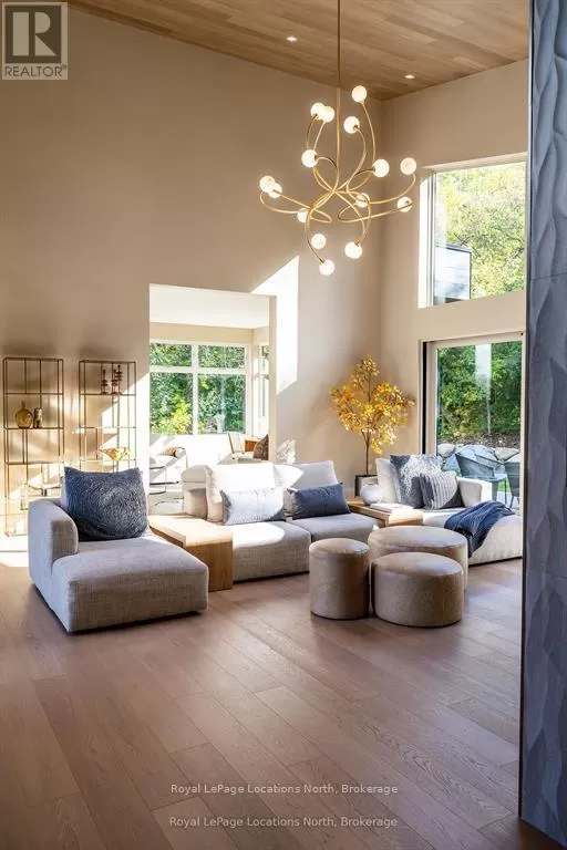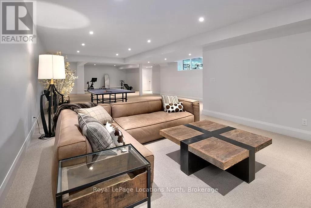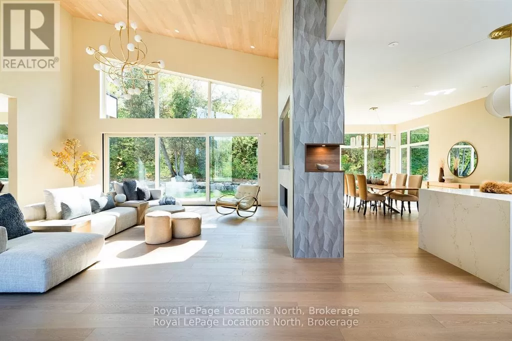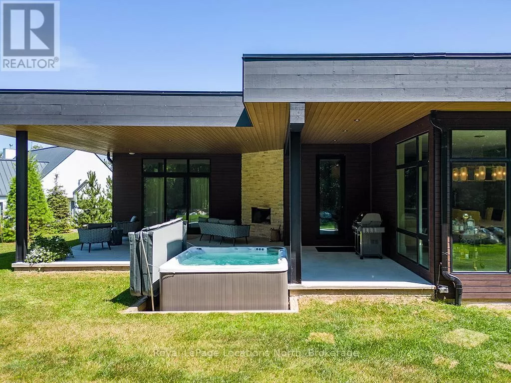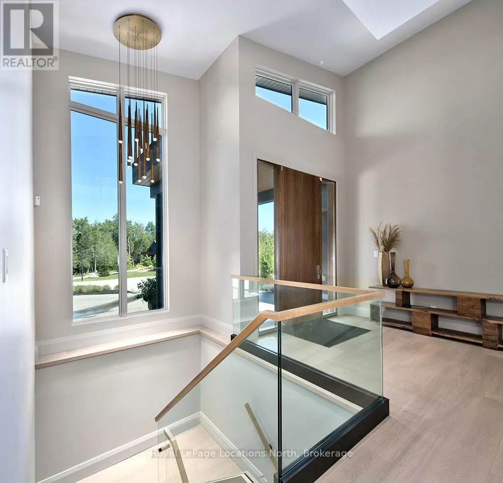 Cross Streets: 10th line. ** Directions: Hwy 26 to 10th Line - North to Pheasant Run (Just before Cameron St). Luxurious new home available in the Pheasant Run enclave. This exceptional property is located on a private cul-de-sac, moments from both the water and town, with the street ending at a 10-acre park.Situated on a 0.6-acre lot, this showcase home features 22ft ceilings in the Great Room with Lift & Slide doors leading to the rear yard, which backs onto a protected green space. The incredible windows ensure abundant light and warmth throughout this gracious home. A gorgeous 2-sided gas fireplace with full-height stonework and unique display details holds a 75" Art TV, providing ambiance throughout the main entertaining space. The grand kitchen is anchored by an incredible 13' island and includes two dishwashers, a second sink/prep area with a beverage fridge, an induction cooktop, built-in appliances including a Miele Cappuccino maker, and a walk-in pantry. The Guest Wing features a unique glass hallway leading to two bedrooms and a full bath with unusual window configurations, creating indulgent personal spaces. A large, comfy den offers a plush away space with a walk-out to the deck. The deluxe mudroom and laundry area provides beautifully designed storage and cabinetry with a luxurious heated stone floor, conveniently located off the 3-car heated garage. There is also an exterior door for a front porch alternative. The Primary Ensuite offers a serene oasis with a walk-in closet, an opulent bath including a sumptuous soaking tub, and a sliding door to the covered patio where a hot tub and outdoor wood-burning fireplace await.The finished lower level offers an additional 2,000 sq ft of finished space with two more bedrooms, each with large daylight window wells, another full bath, a media room with a 48" horizontal gas fireplace, a games area, a bar, and the opportunity to add another bathroom/steam/sauna.This beautifully appointed home is available with custom-curated furnishings. The private rear yard has ample room for both a swimming pool and a sport court (id:27476)