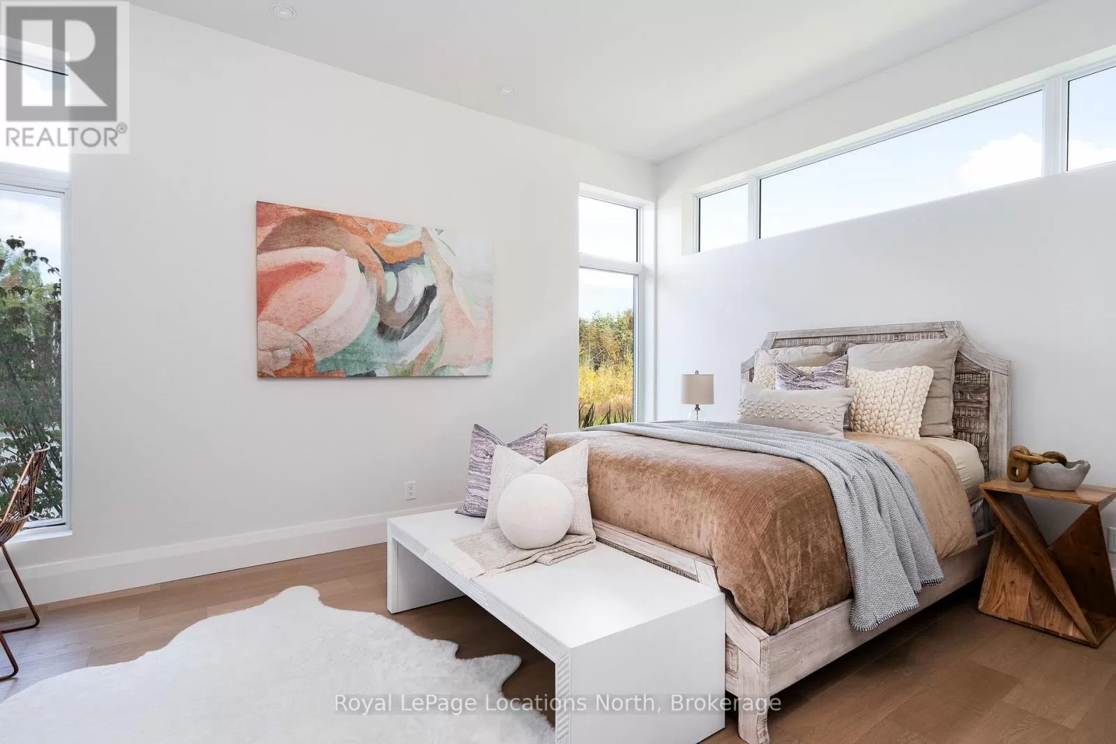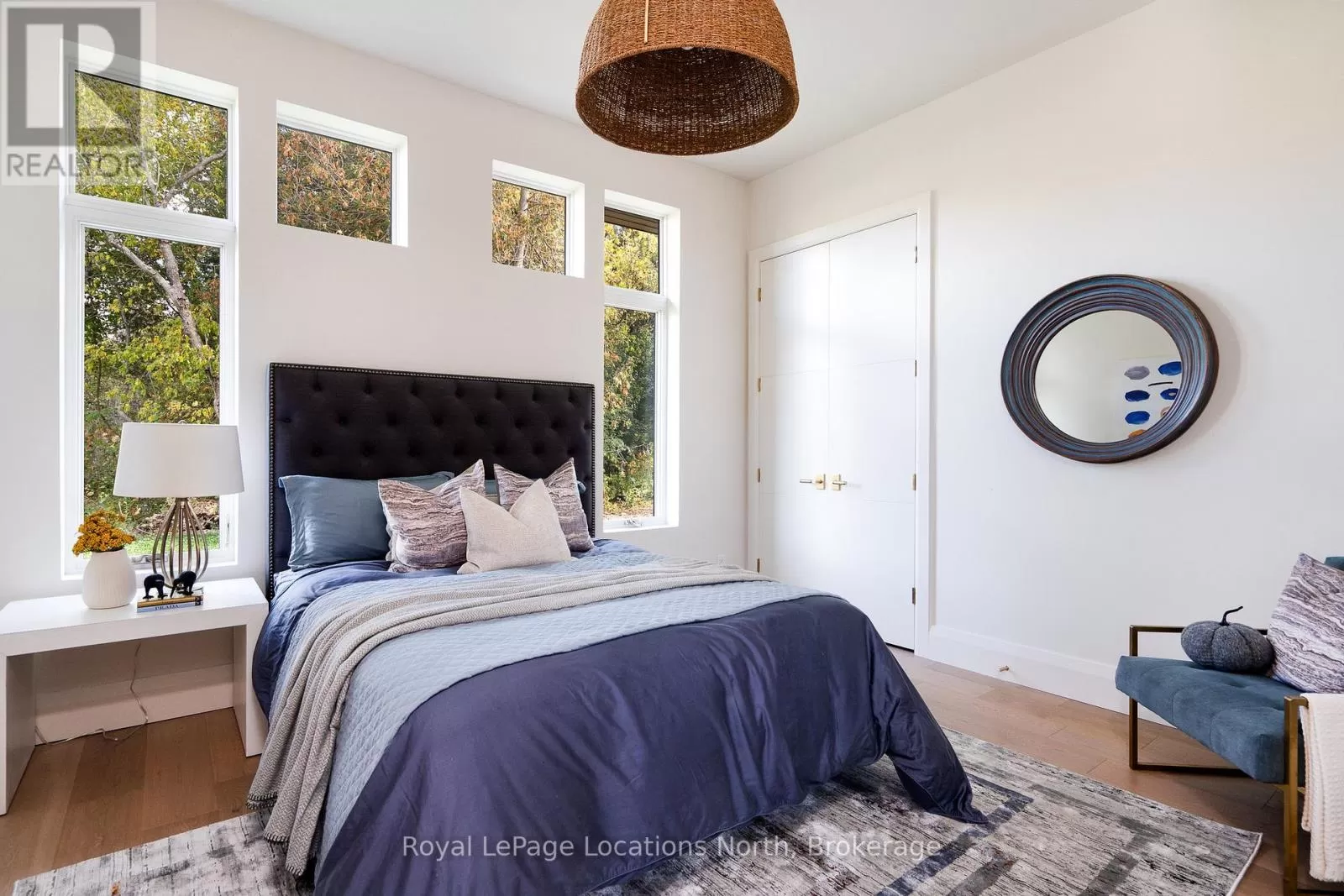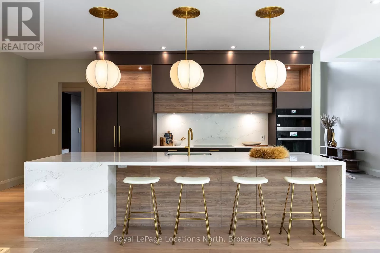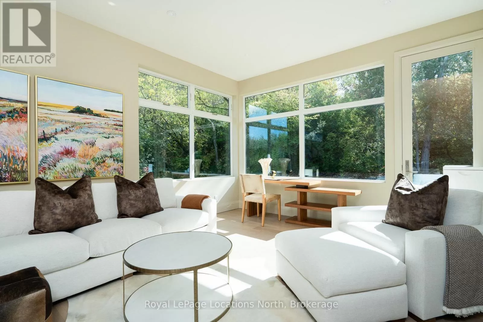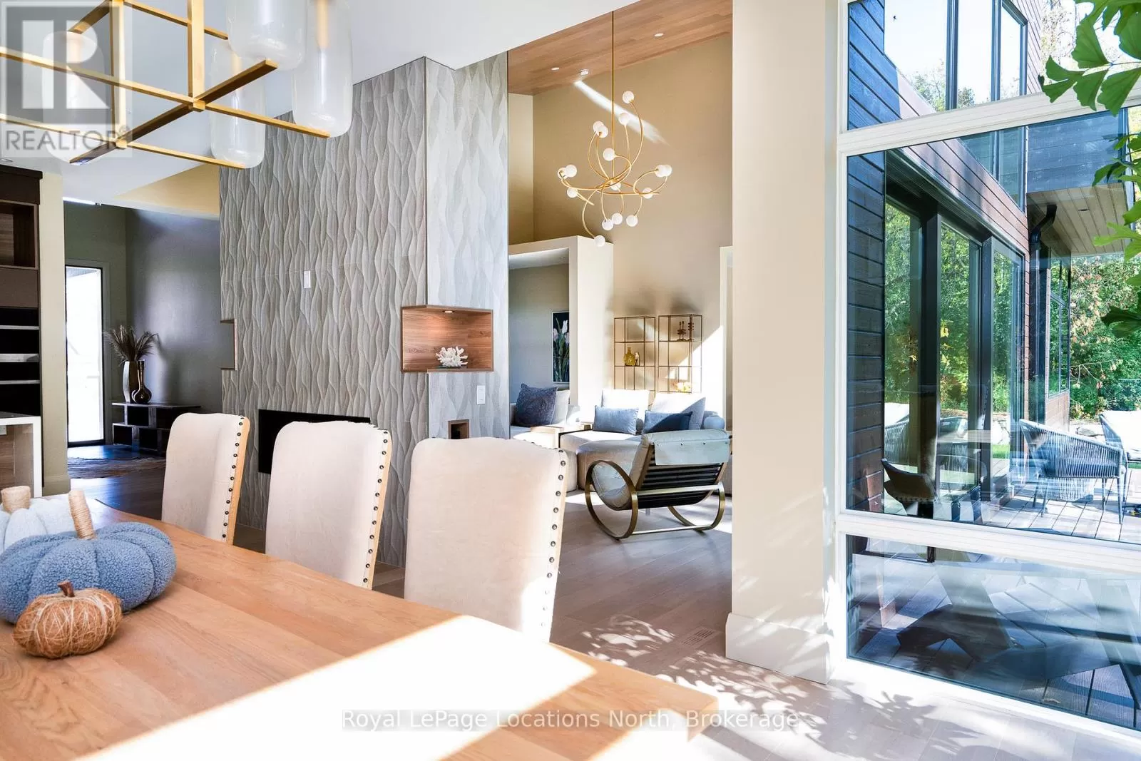 Cross Streets: 10th line. ** Directions: Hwy 26 to 10th Line - North to Pheasant Run (Just before Cameron St). Luxurious new home available in the Pheasant Run enclave. This exceptional property is located on a private cul-de-sac, moments from both the water and town, with the street ending at a 10-acre park.Situated on a 0.6-acre lot, this showcase home features 22ft ceilings in the Great Room with Lift & Slide doors leading to the rear yard, which backs onto a protected green space. The incredible windows ensure abundant light and warmth throughout this gracious home. A gorgeous 2-sided gas fireplace with full-height stonework and unique display details holds a 75" Art TV, providing ambiance throughout the main entertaining space. The grand kitchen is anchored by an incredible 13' island and includes two dishwashers, a second sink/prep area with a beverage fridge, an induction cooktop, built-in appliances including a Miele Cappuccino maker, and a walk-in pantry. The Guest Wing features a unique glass hallway leading to two bedrooms and a full bath with unusual window configurations, creating indulgent personal spaces. A large, comfy den offers a plush away space with a walk-out to the deck. The deluxe mudroom and laundry area provides beautifully designed storage and cabinetry with a luxurious heated stone floor, conveniently located off the 3-car heated garage. There is also an exterior door for a front porch alternative. The Primary Ensuite offers a serene oasis with a walk-in closet, an opulent bath including a sumptuous soaking tub, and a sliding door to the covered patio where a hot tub and outdoor wood-burning fireplace await.The finished lower level offers an additional 2,000 sq ft of finished space with two more bedrooms, each with large daylight window wells, another full bath, a media room with a 48" horizontal gas fireplace, a games area, a bar, and the opportunity to add another bathroom/steam/sauna.This beautifully appointed home is available with custom-curated furnishings. The private rear yard has ample room for both a swimming pool and a sport court (id:27476)