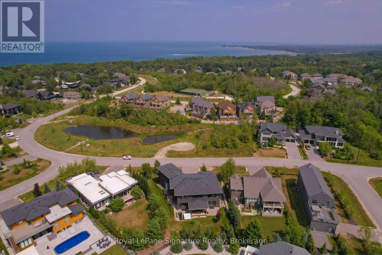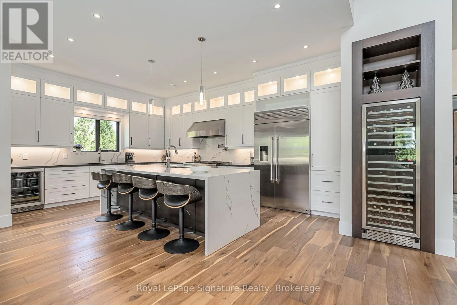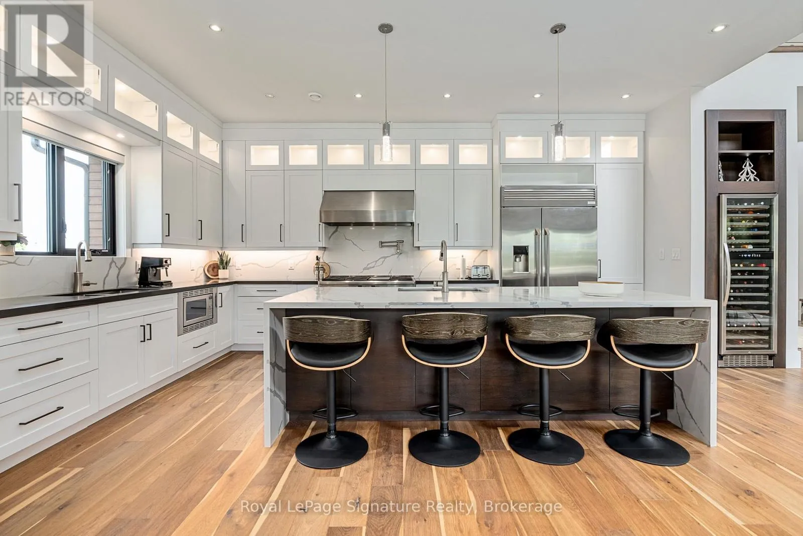 Cross Streets: Arnot Cres. ** Directions: Grey Rd 19 to Sleepy Hollow Rd to Arnot Cres. This custom-built home in the Nipissing Ridge community offers luxury mountain living at the base of Alpine Ski Club and Craigleith. Steps from skiing, hiking, and the shores of Georgian Bay, and minutes to the boutiques, restaurants, and golf courses of The Blue Mountains, it blends year-round recreation with upscale comfort. The 20-foot ceiling great room features expansive windows framing mountain views and a 48-inch linear gas fireplace. The chef's kitchen is equipped with a quartz waterfall island, prep area, beverage station, and premium appliances including a 48-inch Monogram gas range and fridge, Miele dishwasher, wine cooler, and beverage fridge. The main floor primary suite provides a private retreat with a floating vanity, double sinks, glass-enclosed double shower, freestanding tub, heated floors, and a custom dressing room. Engineered hardwood floors, a pre-wired sound system, and a dedicated office enhance everyday living. Upstairs offers a family/games room and three bedrooms, each with an ensuite. The finished lower level includes a family room, games area, two bedrooms, additional bathrooms, in-floor heating, and durable vinyl flooring. Exterior features include stone and wood finishes, an 8-foot glass-paneled entry door, and 9x9 garage doors with a lift system. Move-in ready, this is a rare opportunity to enjoy an active, four-season lifestyle in one of the areas most sought-after communities. (id:27476)
