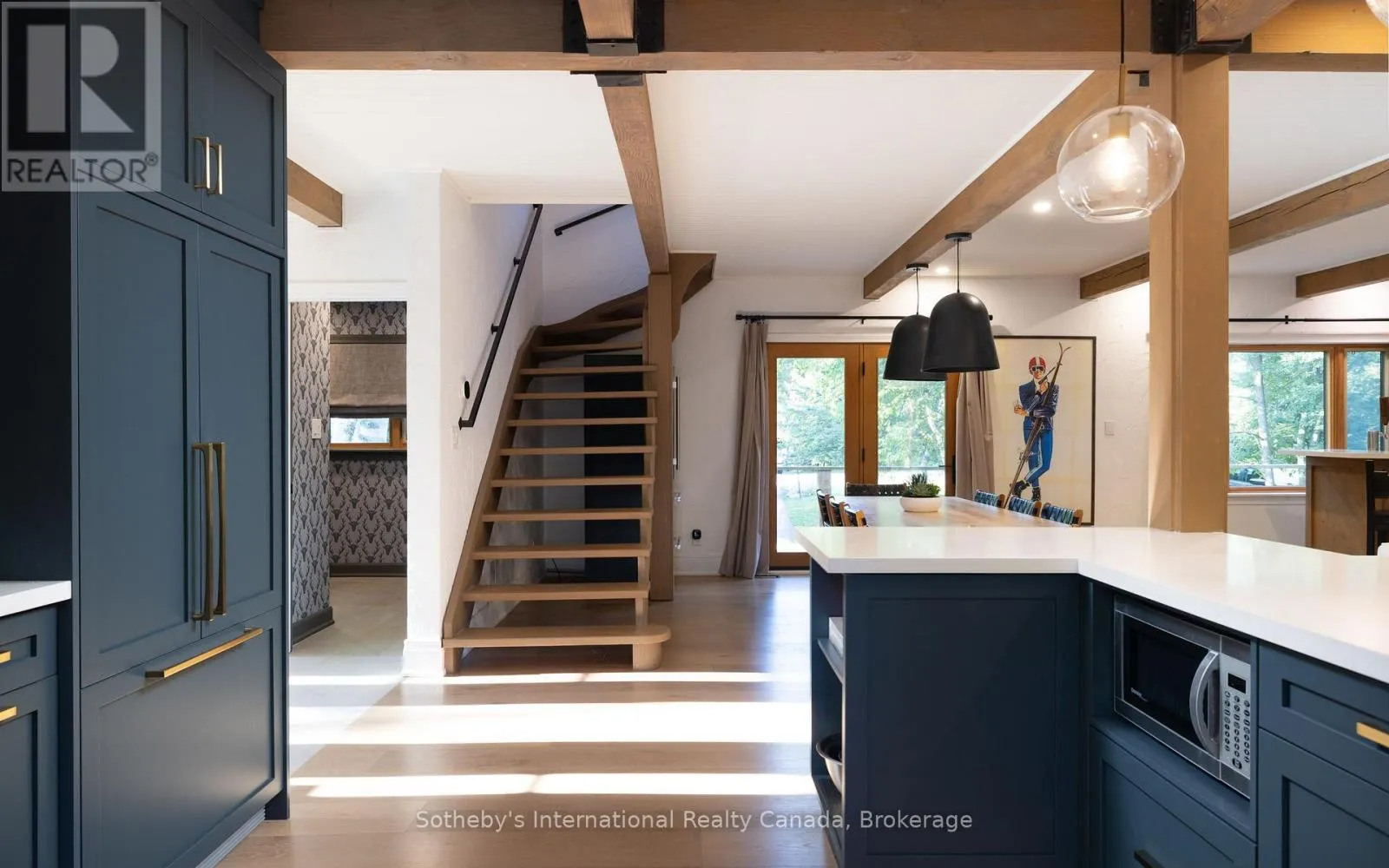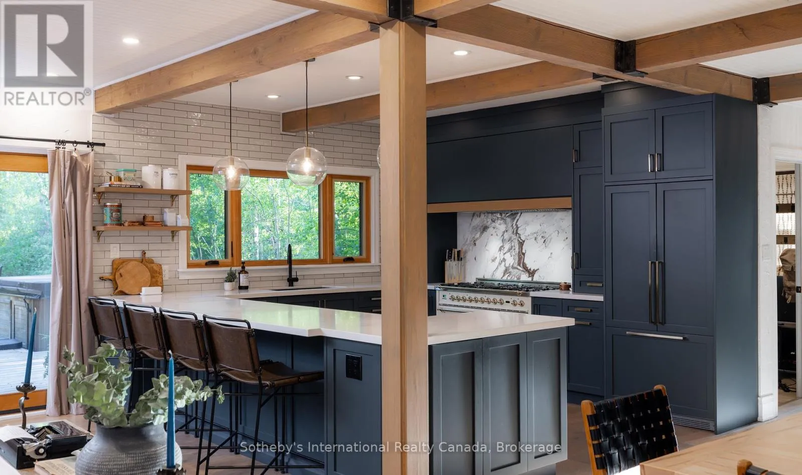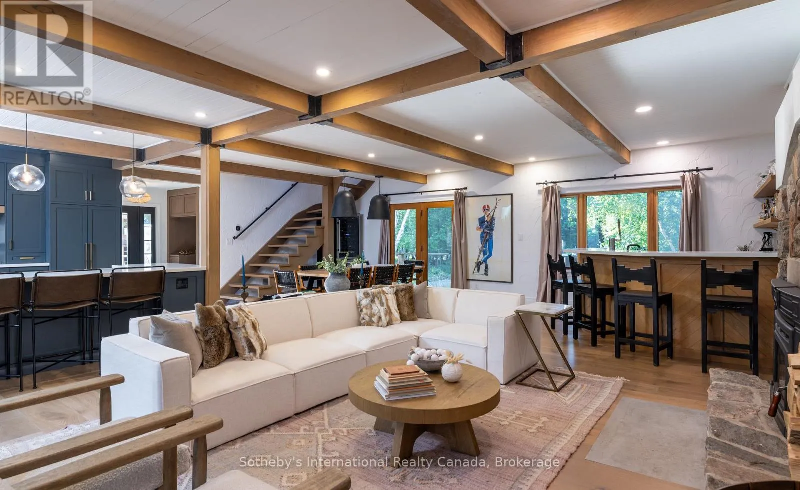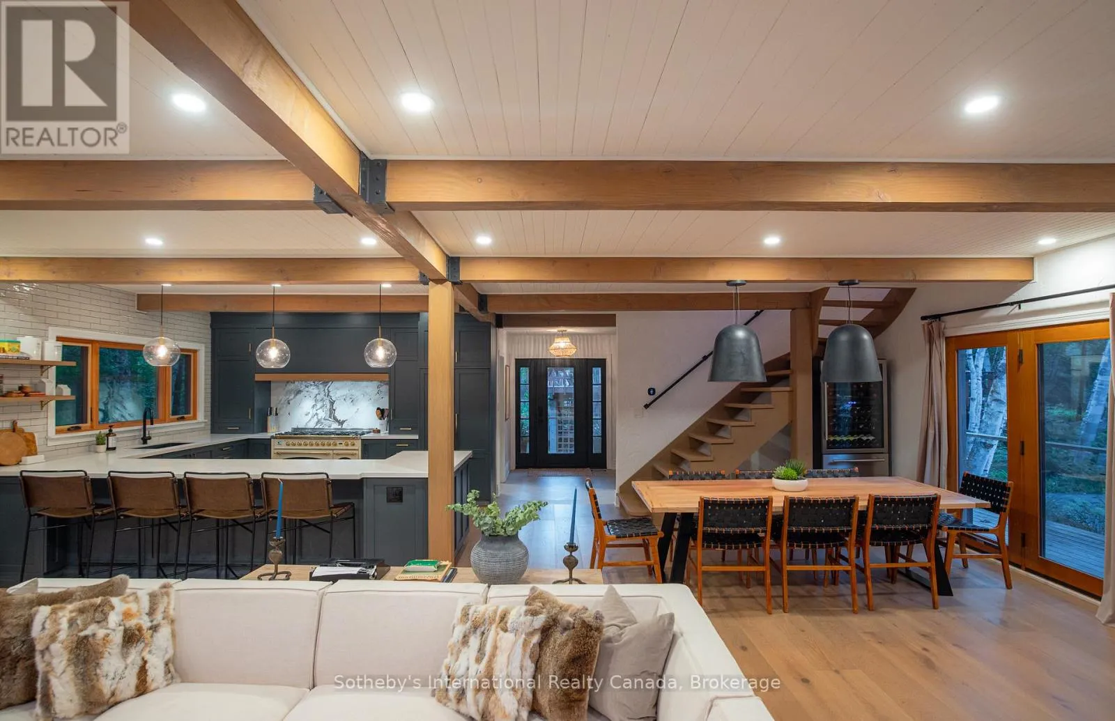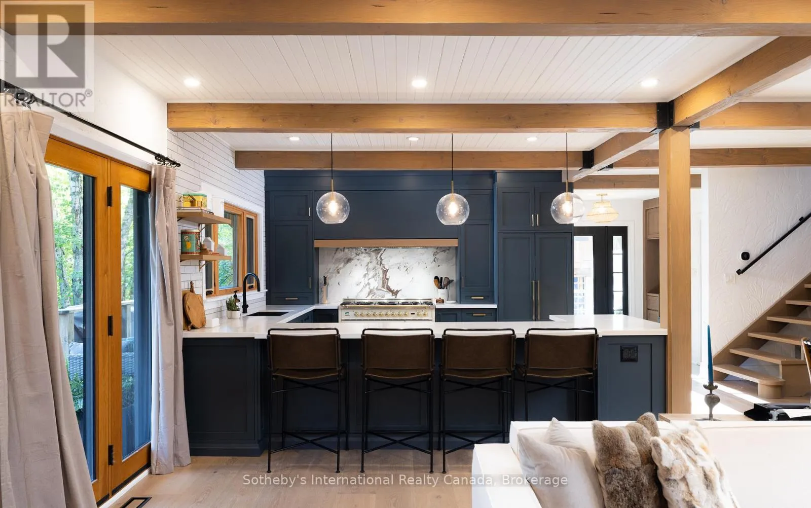 Cross Streets: Highway 26 to Timmons. ** Directions: Hope Street/Timmons Street. Welcome to the ultimate four-season retreat in the heart of Craigleith. Completely reimagined in 2021, this Tyrolean-style chalet was taken back to the studs and rebuilt as a sophisticated modern escape, thoughtfully designed for both weekenders and full-time mountain lovers. With accommodations for 12+ guests, it's the perfect place for family gatherings or entertaining friends after a day on the slopes. Ideally positioned just minutes from private ski clubs, Blue Mountain Village, the Georgian Trail, and your own private community beach, the location is second to none. At the heart of the main level is a stunning custom kitchen by Royal Classic Kitchens, designed for seamless function and flow. Outfitted with quartz countertops, Italian tile, premium appliances, sleek cabinetry, and abundant storage, it caters beautifully to everyday living and elevated entertaining alike. The adjoining dining area offers seating for 12-ideal for lively après dinners-while a custom wet bar with beverage and keg fridges takes entertaining to the next level. The oversized family room, anchored by a dramatic wood-burning fireplace, provides a warm and welcoming focal point for gatherings. From here, walk out to a sunny, south-facing deck featuring a hot tub and generous custom storage-perfect for stowing all your seasonal gear. A stylish mudroom with ski storage and a convenient powder room completes this level with both practicality and polish. Upstairs, a dedicated kids' play zone complements four spacious bedrooms and two modern bathrooms (one is a primary ensuite) with custom finishes and heated floors, while a secret bookshelf door cleverly conceals a whimsical bunk room. Set on a large private lot along one of Craigleith's most coveted streets, this exceptional property blends contemporary luxury with timeless alpine character-ideal as a weekend escape or a year-round home. (id:27476)