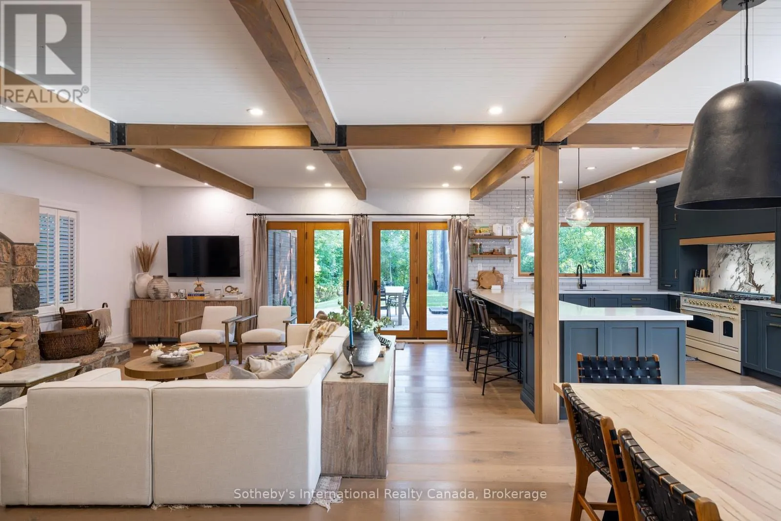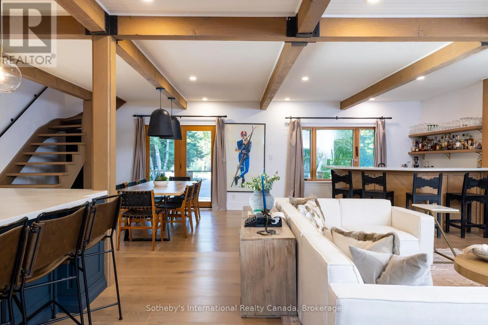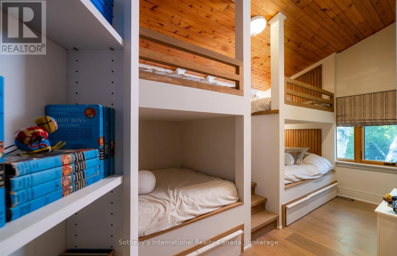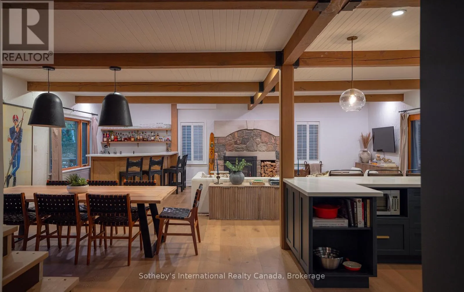 Cross Streets: Highway 26 to Timmons. ** Directions: Hope Street/Timmons Street. Welcome to the ultimate four-season retreat in the heart of Craigleith. Completely reimagined in 2021, this Tyrolean-style chalet was taken back to the studs and rebuilt as a sophisticated modern escape, thoughtfully designed for both weekenders and full-time mountain lovers. With accommodations for 12+ guests, it's the perfect place for family gatherings or entertaining friends after a day on the slopes. Ideally positioned just minutes from private ski clubs, Blue Mountain Village, the Georgian Trail, and your own private community beach, the location is second to none. At the heart of the main level is a stunning custom kitchen by Royal Classic Kitchens, designed for seamless function and flow. Outfitted with quartz countertops, Italian tile, premium appliances, sleek cabinetry, and abundant storage, it caters beautifully to everyday living and elevated entertaining alike. The adjoining dining area offers seating for 12-ideal for lively après dinners-while a custom wet bar with beverage and keg fridges takes entertaining to the next level. The oversized family room, anchored by a dramatic wood-burning fireplace, provides a warm and welcoming focal point for gatherings. From here, walk out to a sunny, south-facing deck featuring a hot tub and generous custom storage-perfect for stowing all your seasonal gear. A stylish mudroom with ski storage and a convenient powder room completes this level with both practicality and polish. Upstairs, a dedicated kids' play zone complements four spacious bedrooms and two modern bathrooms (one is a primary ensuite) with custom finishes and heated floors, while a secret bookshelf door cleverly conceals a whimsical bunk room. Set on a large private lot along one of Craigleith's most coveted streets, this exceptional property blends contemporary luxury with timeless alpine character-ideal as a weekend escape or a year-round home. (id:27476)