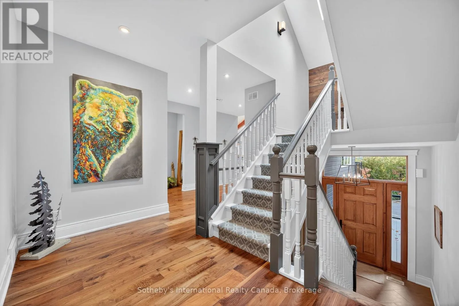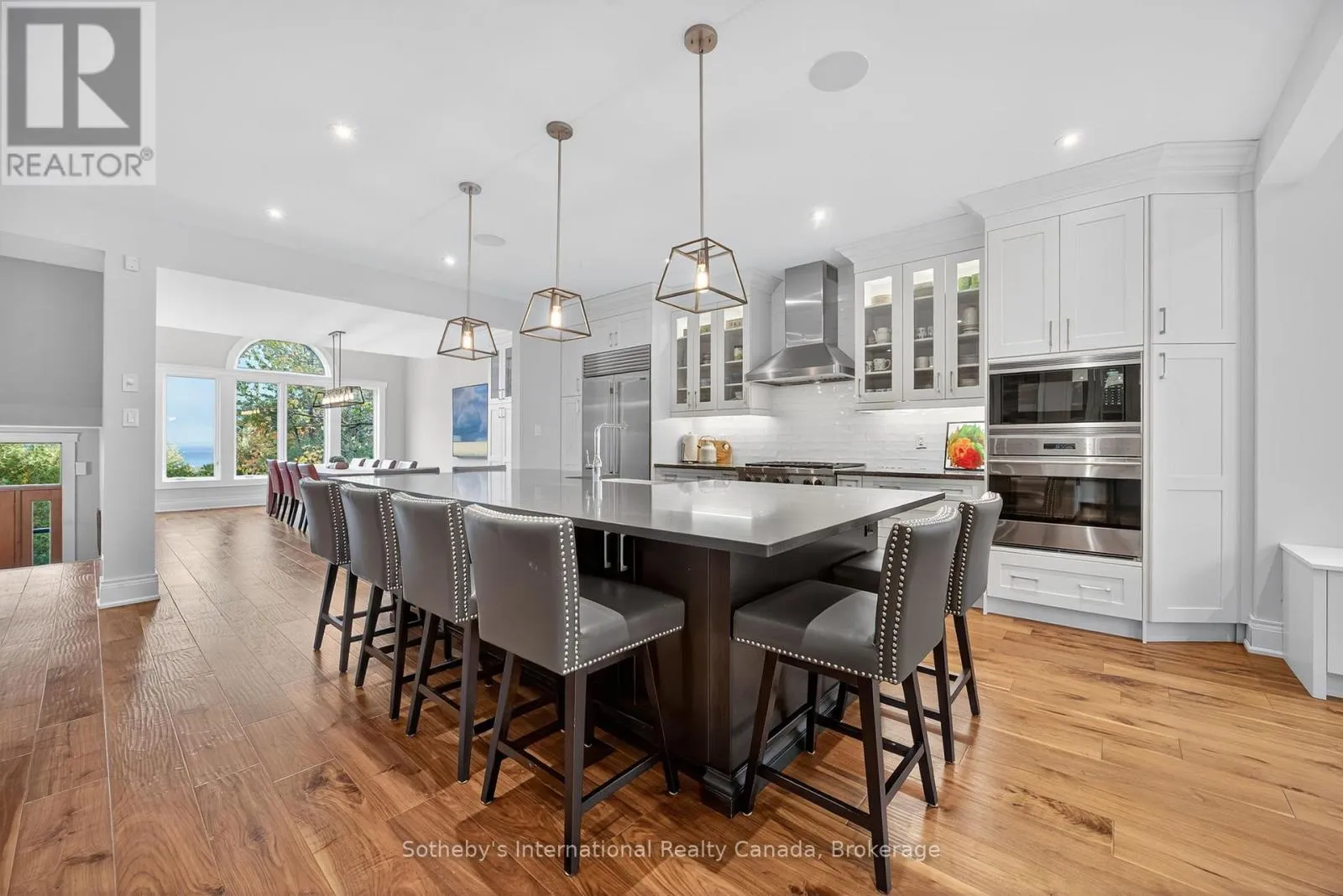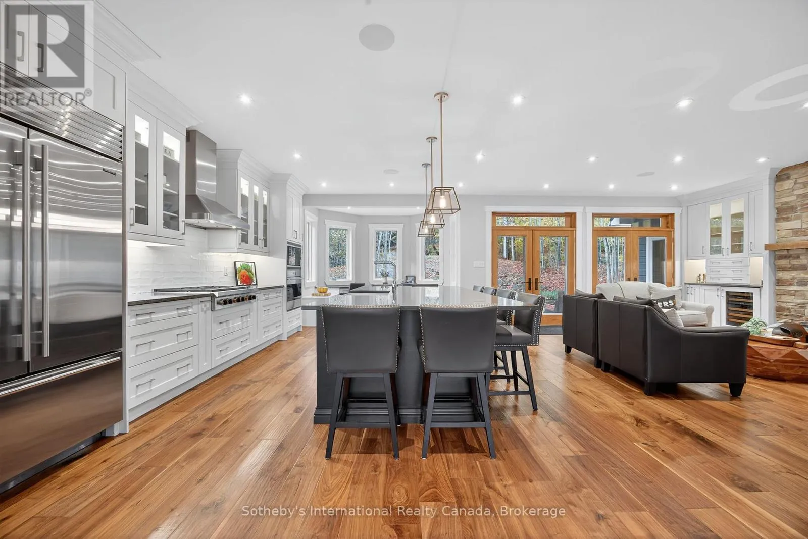 Cross Streets: Arrowhead Rd & Arrowhead Cres. ** Directions: Grey Rd 19 to Sleepy Hollow to Arrowhead Rd to Arrowhead Cres. 5500+ sq ft Luxury Mountain Retreat at the Base of Craigleith & Alpine Ski Clubs. Experience four-season resort living at its finest in one of Ontario's most prestigious ski community locations - a rare property where you can walk to the slopes or ski right from your door. Nestled on a private wooded lot with a soothing creek, fire pit, putting green, and picturesque bridge path, this residence offers the perfect balance of natural beauty and refined luxury.Boasting views of the ski hills and Georgian Bay, this fully renovated (2016) home features soaring ceilings, expansive windows, and three fireplaces-including a floor to ceiling stone gas fireplace in the great room, a cozy wood-burning fireplace in the upper living area, and additional gas fireplace in the family room creating a relaxing ambiance in multiple areas . The gourmet kitchen is a chef's dream, featuring high-end appliances, an oversized island with seating for eight. The open-concept dining area, framed by expansive bay views, comfortably seats ten, beer taps & multiple wine/beverage fridges-perfect for hosting après-ski dinners and family gatherings. Home includes a games room, gym, and lower-level walkout. After a day on the slopes, enter through the grand mudroom with custom cabinetry and heated floors, offering seamless comfort and function. Main floor primary suite opens directly to the back deck and features a spa-like ensuite with a glass shower, soaker tub, and dual sinks. Additional luxuries include two laundry rooms with stainless steel front-load appliances and whole-home speaker system.Outdoors, enjoy beautifully landscaped grounds with a winding, illuminated driveway, a hot tub overlooking the bay, and a basketball hoop. The steel roof adds enduring quality and peace of mind.Whether you're skiing, hiking, snowshoeing, or teeing off at nearby golf courses, this is the ultimate four-season lifestyle. Just minutes from Blue Mountain Village, Thornbury, and Collingwood's shops and bistros. (id:27476)