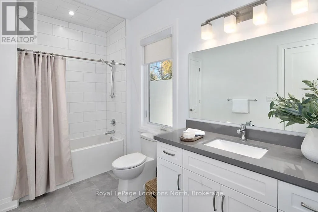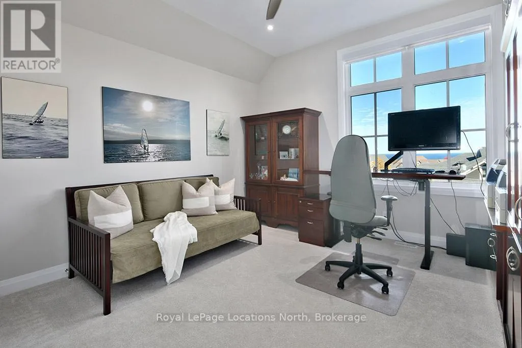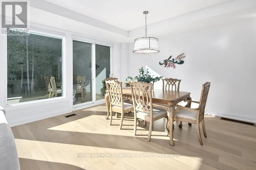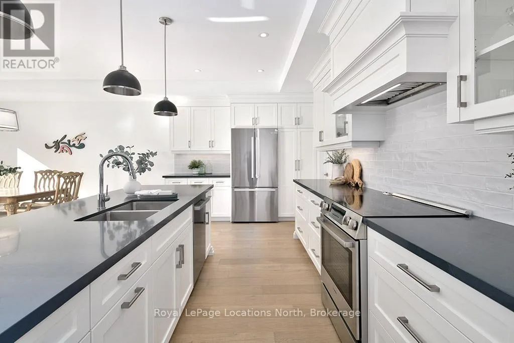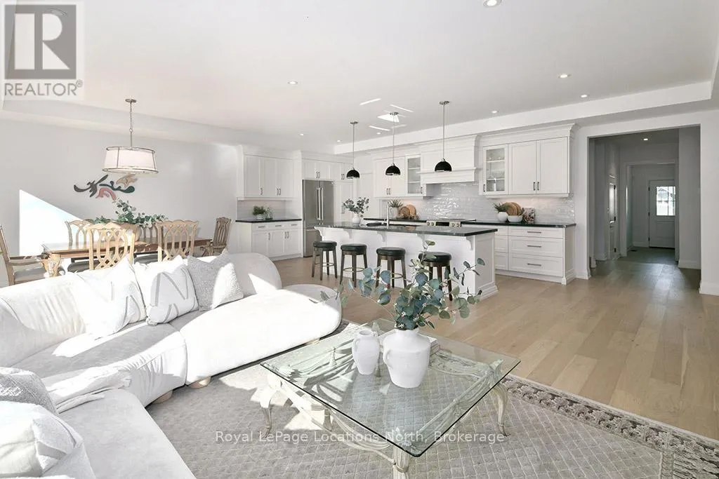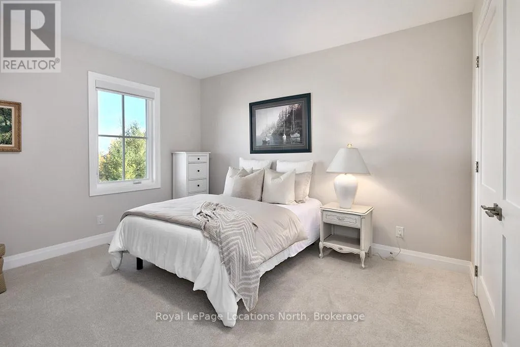 Off Hwy 26 Turn onto Lora Bay Drive, West Ridge Drive, Landry Lane, Property is on the Left. Beautifully finished end-unit townhome featuring 3+1 bedrooms and 3.5 bathrooms, combining luxury, comfort, and functionality in one of Thornbury's most desirable communities.Step inside to a bright, open-concept main level featuring large windows that frame views of mature trees, warm wood floors, and a modern gas fireplace that anchors the inviting living area. The chef-inspired kitchen has quartz countertops, a spacious island with seating, ample cabinetry, and a large walk-in pantry-perfect for everyday living and entertaining alike. The dining area opens to a private back patio, ideal for relaxing or dining al fresco. A 2pc bath and access to the oversized garage complete the main level.Upstairs, the spacious primary suite is a true retreat, featuring a walk-in closet and a spa-like 5pc ensuite with a freestanding tub, walk-in shower with niche and bench, and a double vanity. Two additional guest bedrooms, a 4pc guest bath, and convenient upper-level laundry offer comfort and convenience.The fully finished lower level expands your living space with a rec room, a bedroom or gym, and a 3pc bathroom-ideal for guests or a private workout zone.Nestled within the prestigious Lora Bay community, residents enjoy access to a championship golf course, 2 beaches, club amenities like a fitness room and restaurant and a lifestyle that embraces the outdoors-just minutes to skiing, boating, and downtown Thornbury's charming shops, restaurants, and cafés.Experience the luxury, comfort, and community of Lora Bay living-your next chapter begins here! (id:27476)