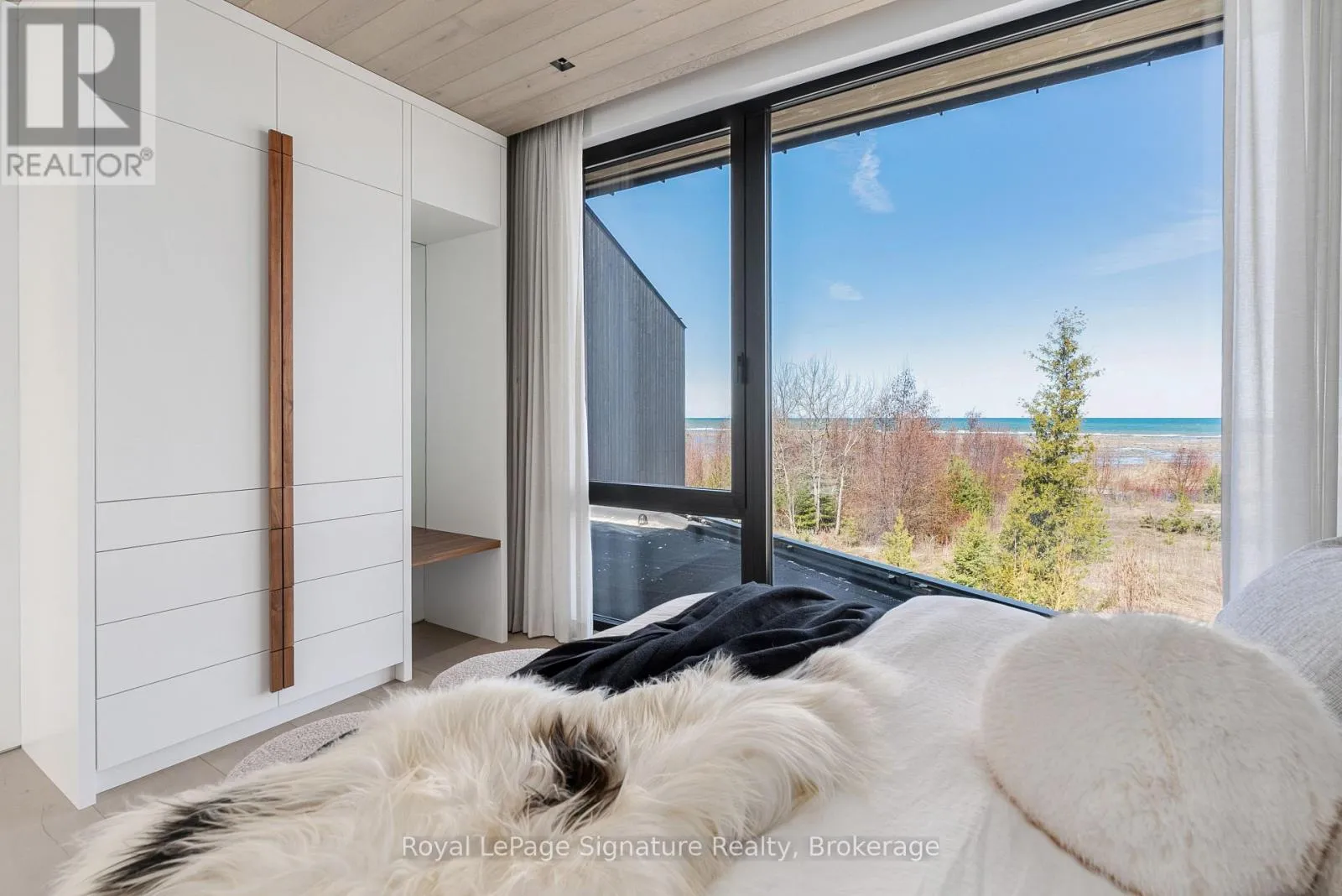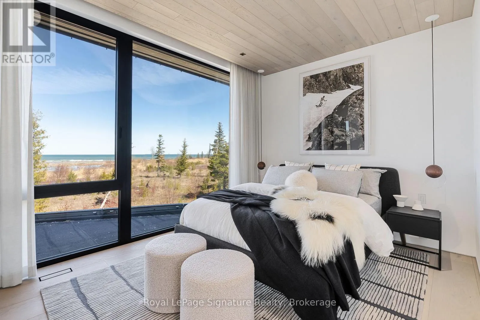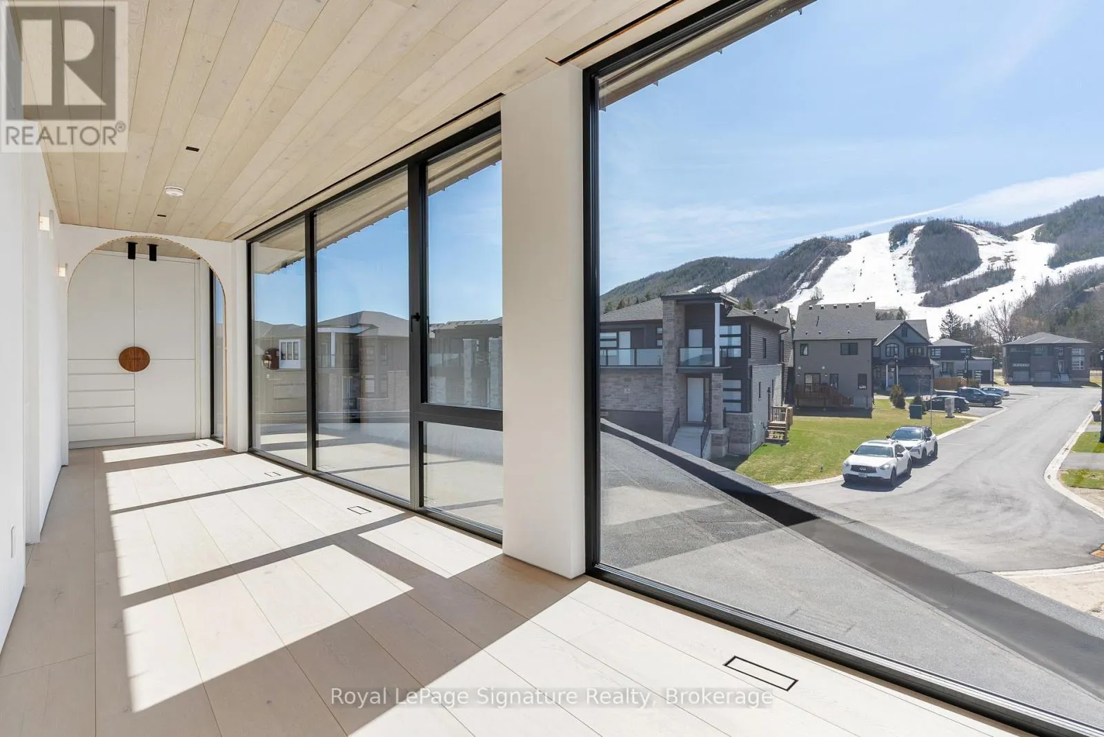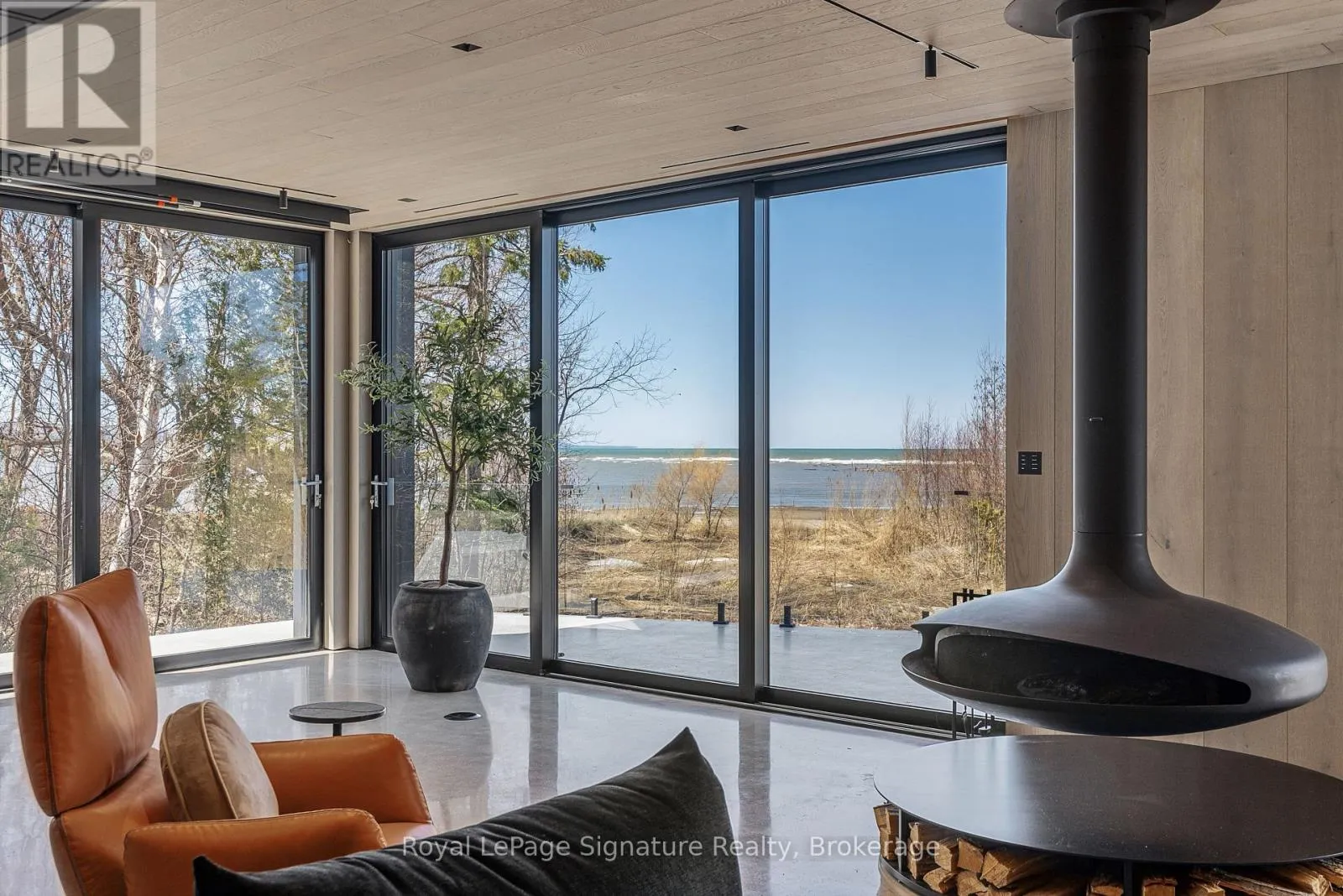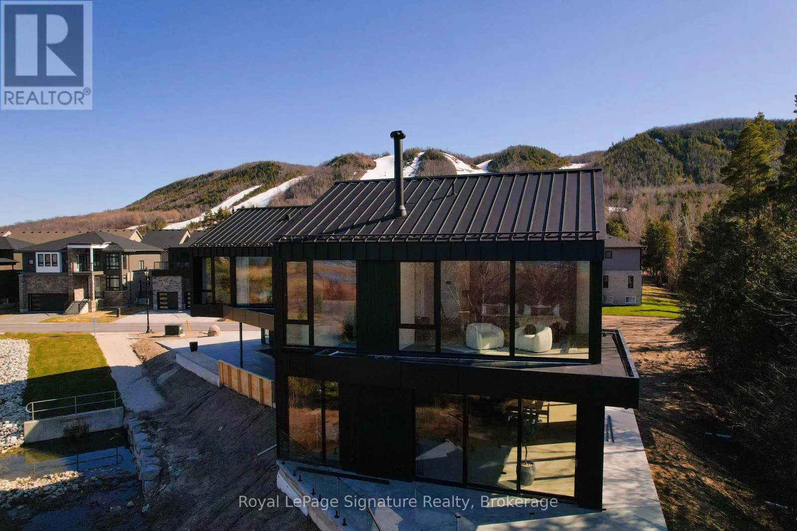 Cross Streets: Sebastian St & Jewel St. ** Directions: From Highway 26, turn north on Delphi Lane. Continue straight onto Jewel St to stop sign.Turn left onto Sebastian St. House is on corner at curve. Welcome to 120 Sebastian Street - a showpiece of modern architecture and refined craftsmanship, designed by Foreshew Design Associates and finished by The Local Studio. Just steps from Georgian Bay & Georgian Peaks Ski Club, this four-bedroom, 3.5-bath home spans approximately 3,500 sq. ft. of thoughtfully curated living space, seamlessly blending high design with the relaxed elegance of Southern Georgian Bay living. Radiant heated polished concrete floors flow through the open-concept main level, where the living and dining area is anchored by a floating wood-burning fireplace and custom metal shelving. Oversized glass pocket doors with motorized screens connect the indoors to the covered patio - perfect for four-season entertaining. Movie nights reach new heights with a 12-foot motorized drop-down projector screen and hidden projector, transforming the space into a private cinema with stunning views of Georgian Bay. The custom Chervin kitchen features marble counters and backsplash, Bosch and JennAir appliances, dual Fisher & Paykel drawer dishwashers, a hidden coffee station, and a concealed walk-in pantry with custom metal shelving - all designed for form and function. Upstairs, the primary suite is a serene retreat with panoramic views of Georgian Bay, a microcement finished ensuite with integrated soaker tub and custom double vanity. One bedroom offers custom triple bunk beds and a centre-pivot arched door, adding a playful architectural touch. Two additional bedrooms and spa-inspired bathrooms provide space and comfort for family or guests. Every detail has been meticulously designed - from the Lutron smart home system and snow-melt driveway and walkway to the Drutex triple-pane windows, metal roof, and radiant in-floor heating throughout the main level and garage. The heated garage with built-ins, bar fridge, and EV charger wiring extends both convenience and style. A rare blend of luxury, design, and Georgian Bay living - just steps from the slopes. (id:27476)
