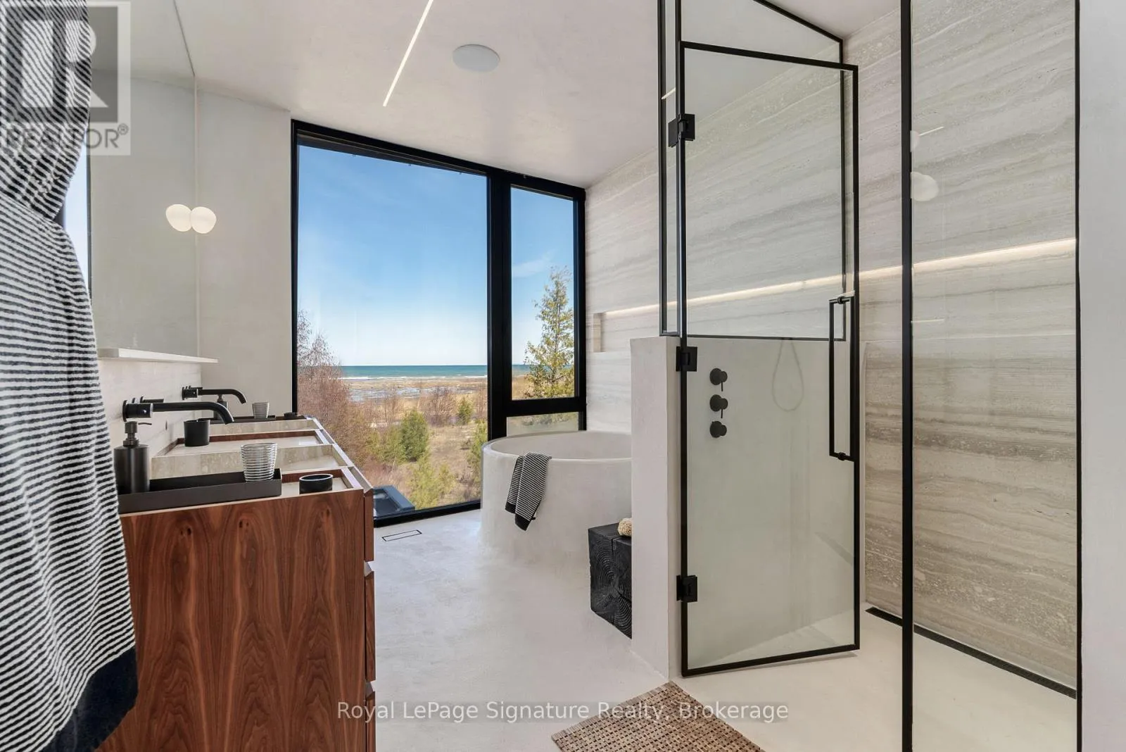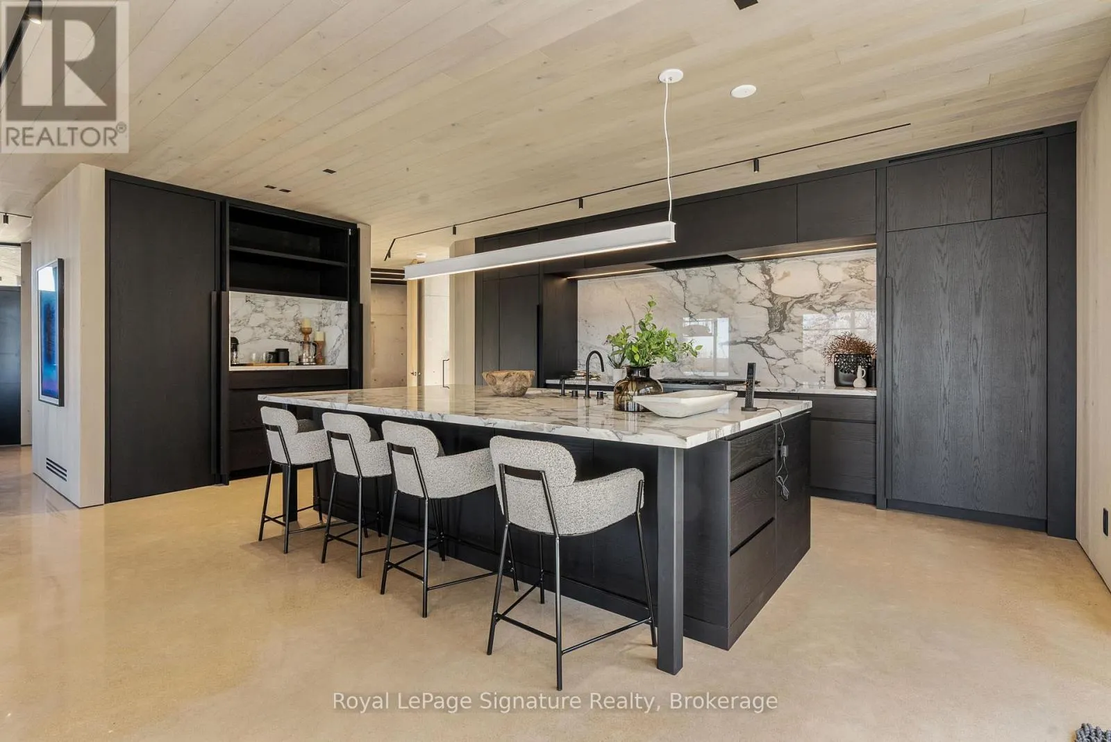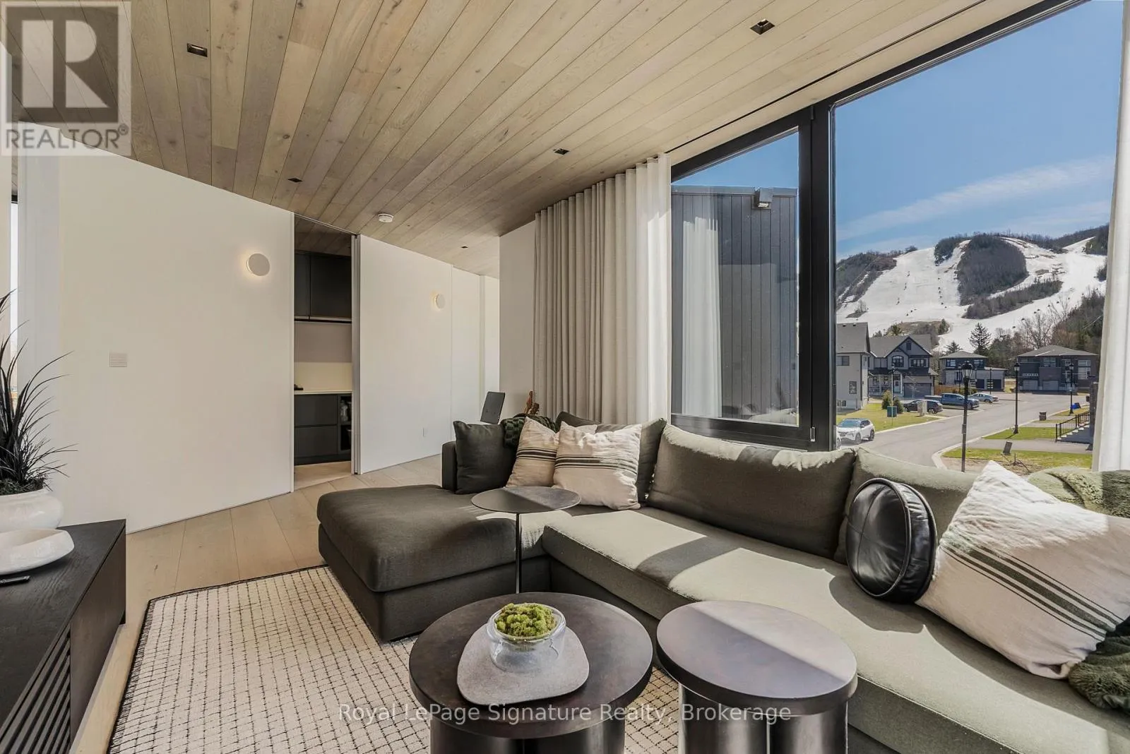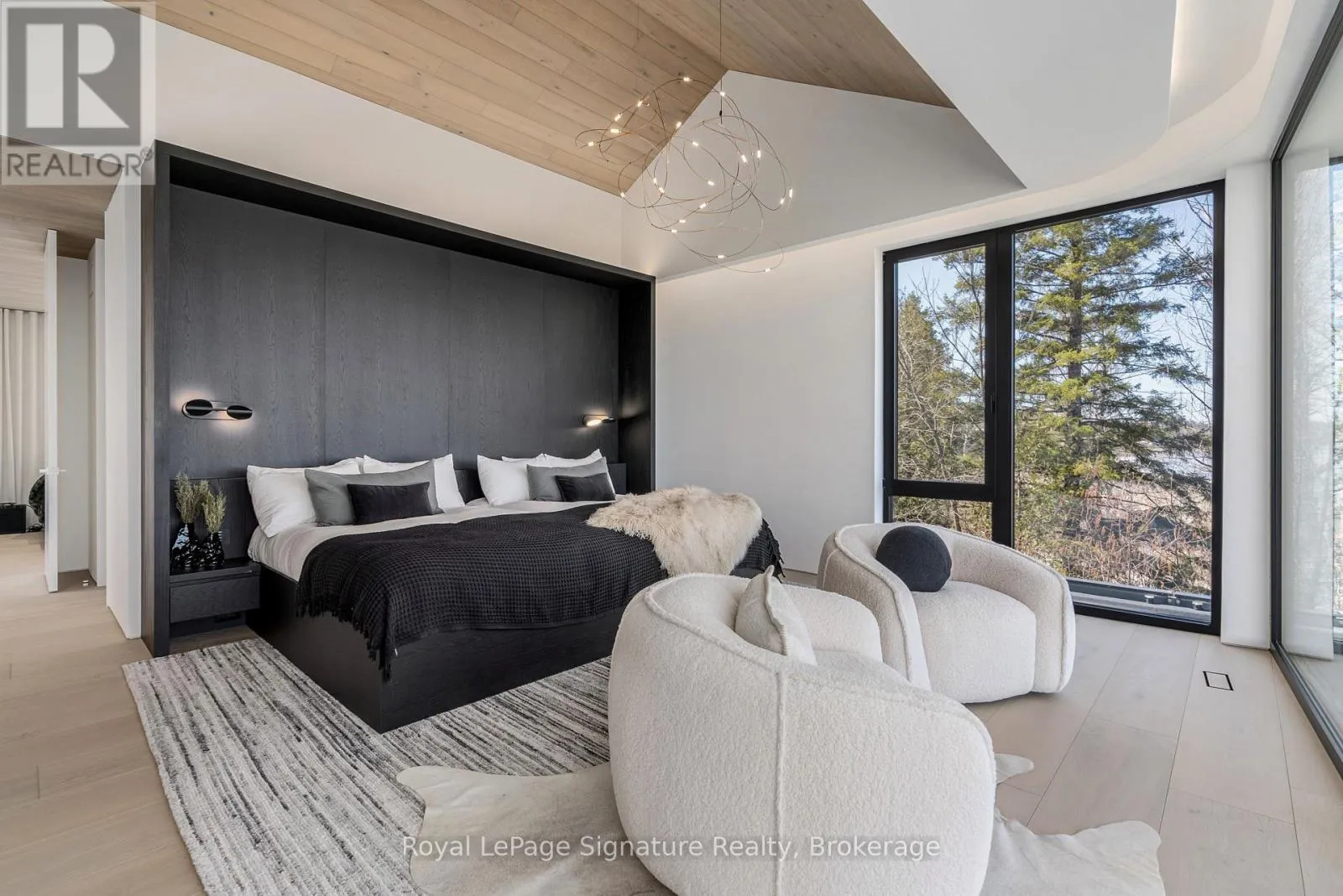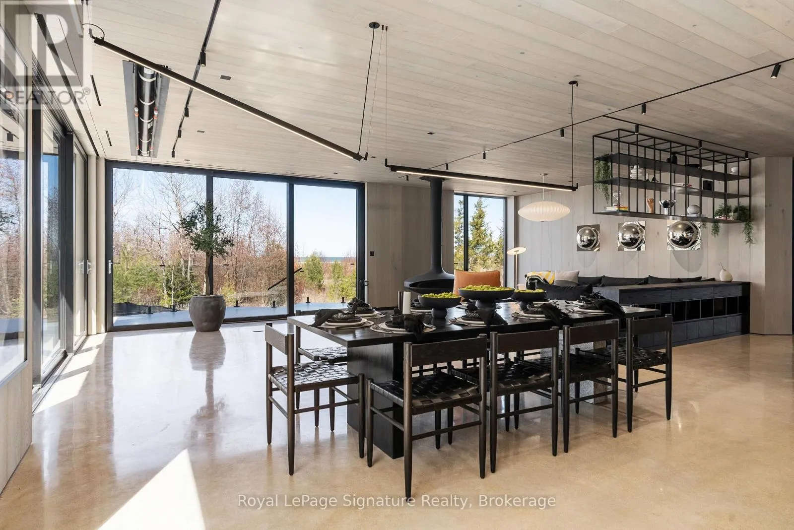Cross Streets: Sebastian St & Jewel St. ** Directions: From Highway 26, turn north on Delphi Lane. Continue straight onto Jewel St to stop sign.Turn left onto Sebastian St. House is on corner at curve. Welcome to 120 Sebastian Street - a showpiece of modern architecture and refined craftsmanship, designed by Foreshew Design Associates and finished by The Local Studio. Just steps from Georgian Bay & Georgian Peaks Ski Club, this four-bedroom, 3.5-bath home spans approximately 3,500 sq. ft. of thoughtfully curated living space, seamlessly blending high design with the relaxed elegance of Southern Georgian Bay living. Radiant heated polished concrete floors flow through the open-concept main level, where the living and dining area is anchored by a floating wood-burning fireplace and custom metal shelving. Oversized glass pocket doors with motorized screens connect the indoors to the covered patio - perfect for four-season entertaining. Movie nights reach new heights with a 12-foot motorized drop-down projector screen and hidden projector, transforming the space into a private cinema with stunning views of Georgian Bay. The custom Chervin kitchen features marble counters and backsplash, Bosch and JennAir appliances, dual Fisher & Paykel drawer dishwashers, a hidden coffee station, and a concealed walk-in pantry with custom metal shelving - all designed for form and function. Upstairs, the primary suite is a serene retreat with panoramic views of Georgian Bay, a microcement finished ensuite with integrated soaker tub and custom double vanity. One bedroom offers custom triple bunk beds and a centre-pivot arched door, adding a playful architectural touch. Two additional bedrooms and spa-inspired bathrooms provide space and comfort for family or guests. Every detail has been meticulously designed - from the Lutron smart home system and snow-melt driveway and walkway to the Drutex triple-pane windows, metal roof, and radiant in-floor heating throughout the main level and garage. The heated garage with built-ins, bar fridge, and EV charger wiring extends both convenience and style. A rare blend of luxury, design, and Georgian Bay living - just steps from the slopes. (id:27476)