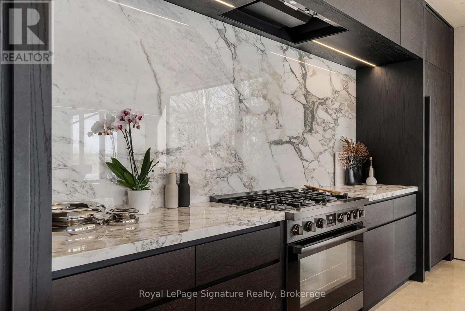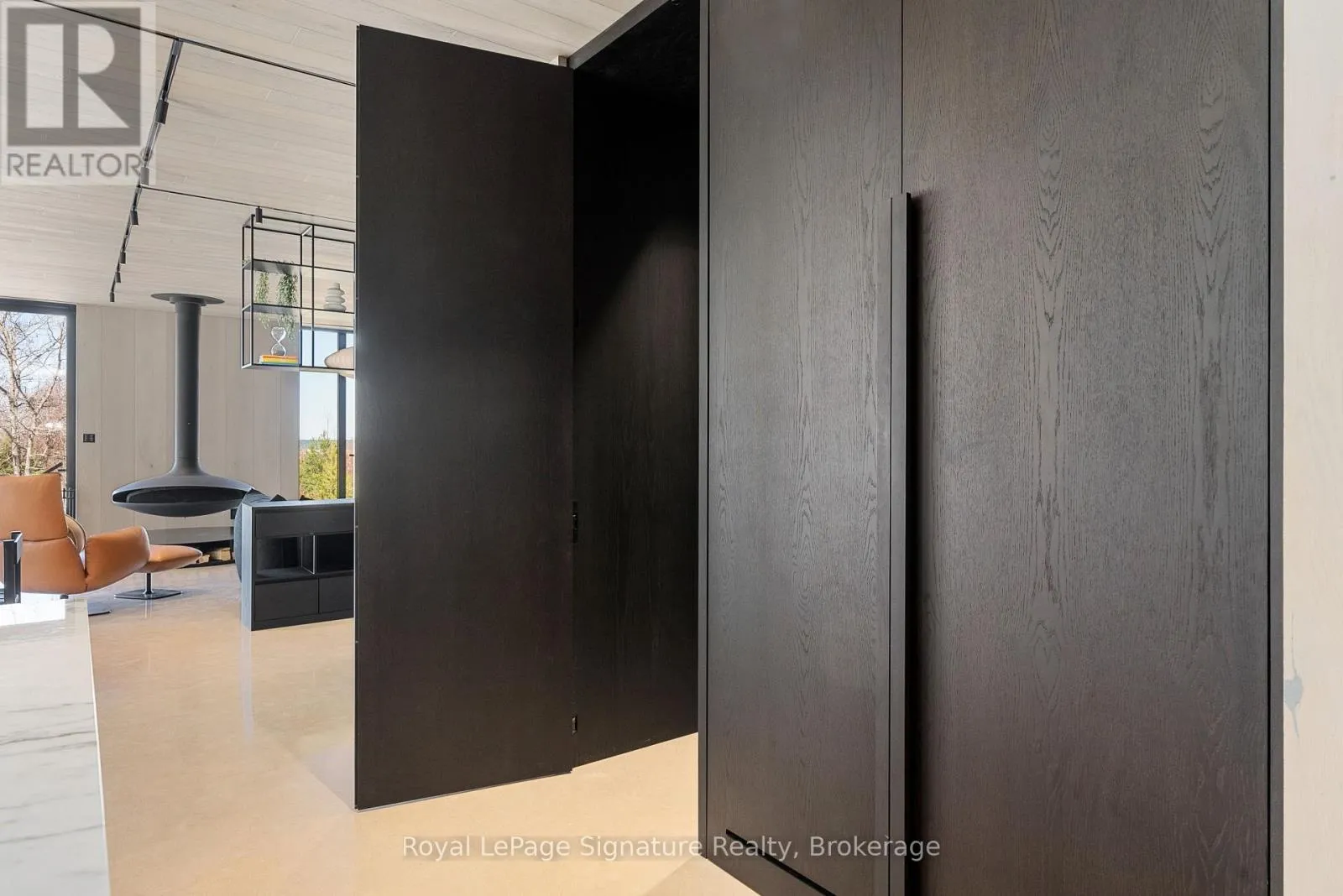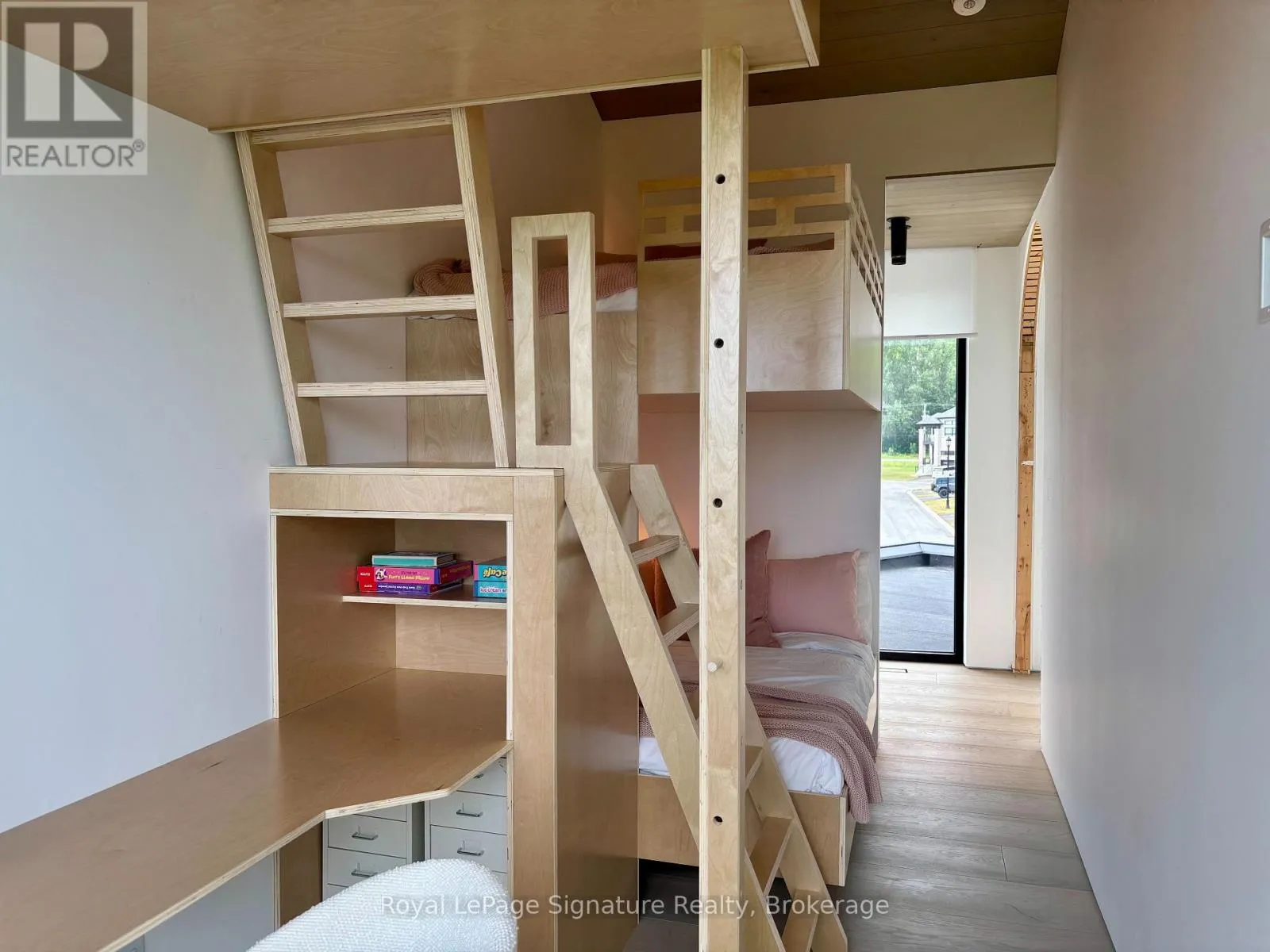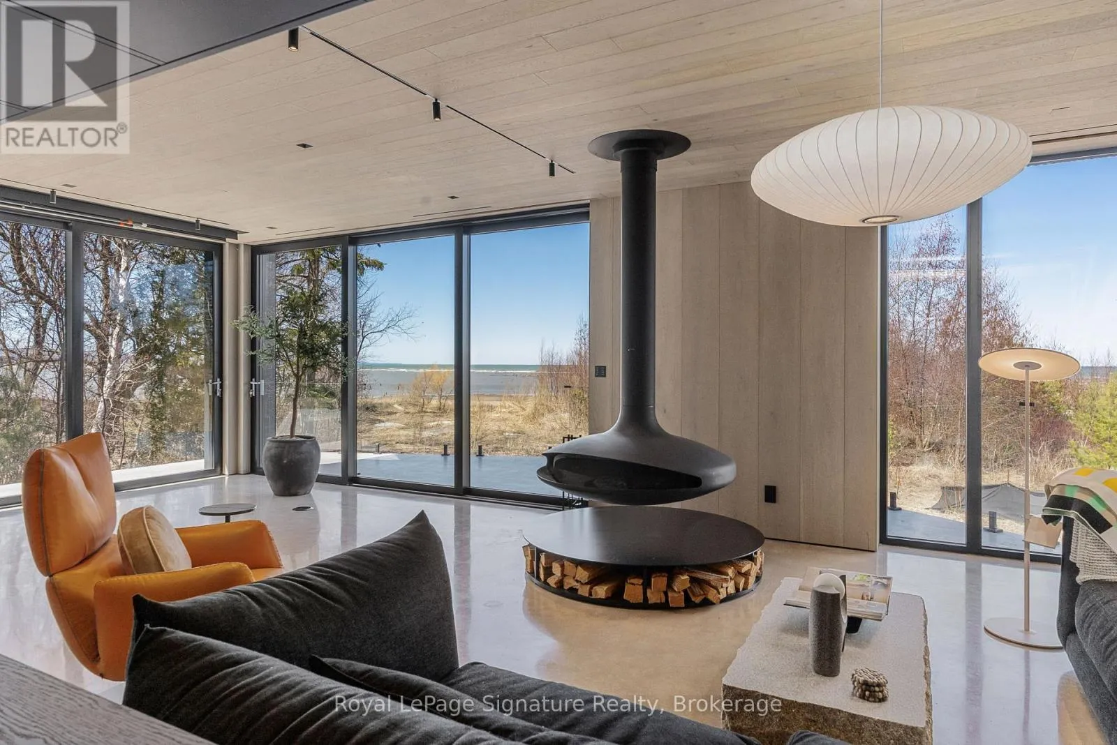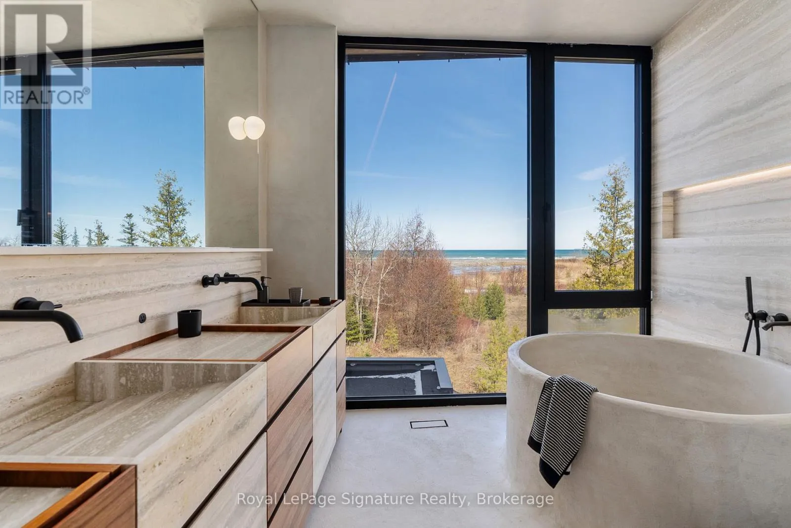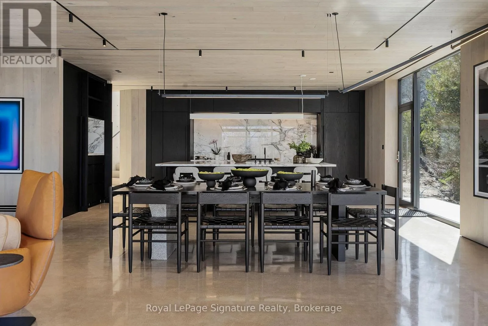 Cross Streets: Sebastian St & Jewel St. ** Directions: From Highway 26, turn north on Delphi Lane. Continue straight onto Jewel St to stop sign.Turn left onto Sebastian St. House is on corner at curve. Welcome to 120 Sebastian Street - a showpiece of modern architecture and refined craftsmanship, designed by Foreshew Design Associates and finished by The Local Studio. Just steps from Georgian Bay & Georgian Peaks Ski Club, this four-bedroom, 3.5-bath home spans approximately 3,500 sq. ft. of thoughtfully curated living space, seamlessly blending high design with the relaxed elegance of Southern Georgian Bay living. Radiant heated polished concrete floors flow through the open-concept main level, where the living and dining area is anchored by a floating wood-burning fireplace and custom metal shelving. Oversized glass pocket doors with motorized screens connect the indoors to the covered patio - perfect for four-season entertaining. Movie nights reach new heights with a 12-foot motorized drop-down projector screen and hidden projector, transforming the space into a private cinema with stunning views of Georgian Bay. The custom Chervin kitchen features marble counters and backsplash, Bosch and JennAir appliances, dual Fisher & Paykel drawer dishwashers, a hidden coffee station, and a concealed walk-in pantry with custom metal shelving - all designed for form and function. Upstairs, the primary suite is a serene retreat with panoramic views of Georgian Bay, a microcement finished ensuite with integrated soaker tub and custom double vanity. One bedroom offers custom triple bunk beds and a centre-pivot arched door, adding a playful architectural touch. Two additional bedrooms and spa-inspired bathrooms provide space and comfort for family or guests. Every detail has been meticulously designed - from the Lutron smart home system and snow-melt driveway and walkway to the Drutex triple-pane windows, metal roof, and radiant in-floor heating throughout the main level and garage. The heated garage with built-ins, bar fridge, and EV charger wiring extends both convenience and style. A rare blend of luxury, design, and Georgian Bay living - just steps from the slopes. (id:27476)