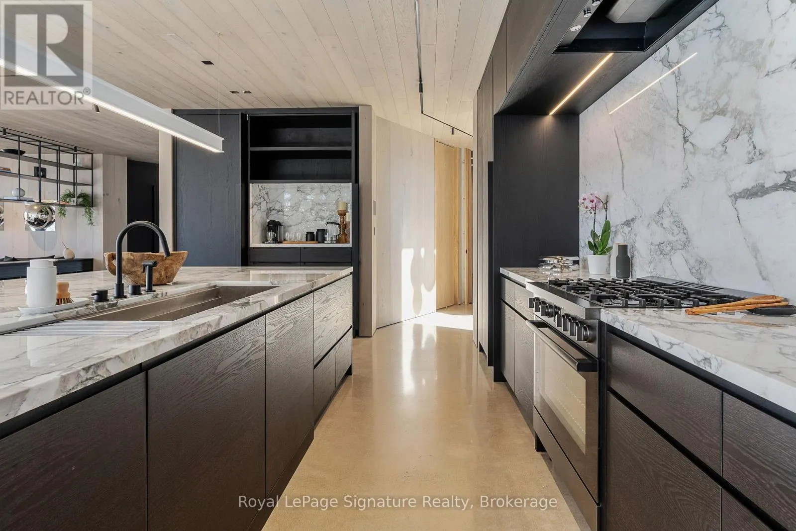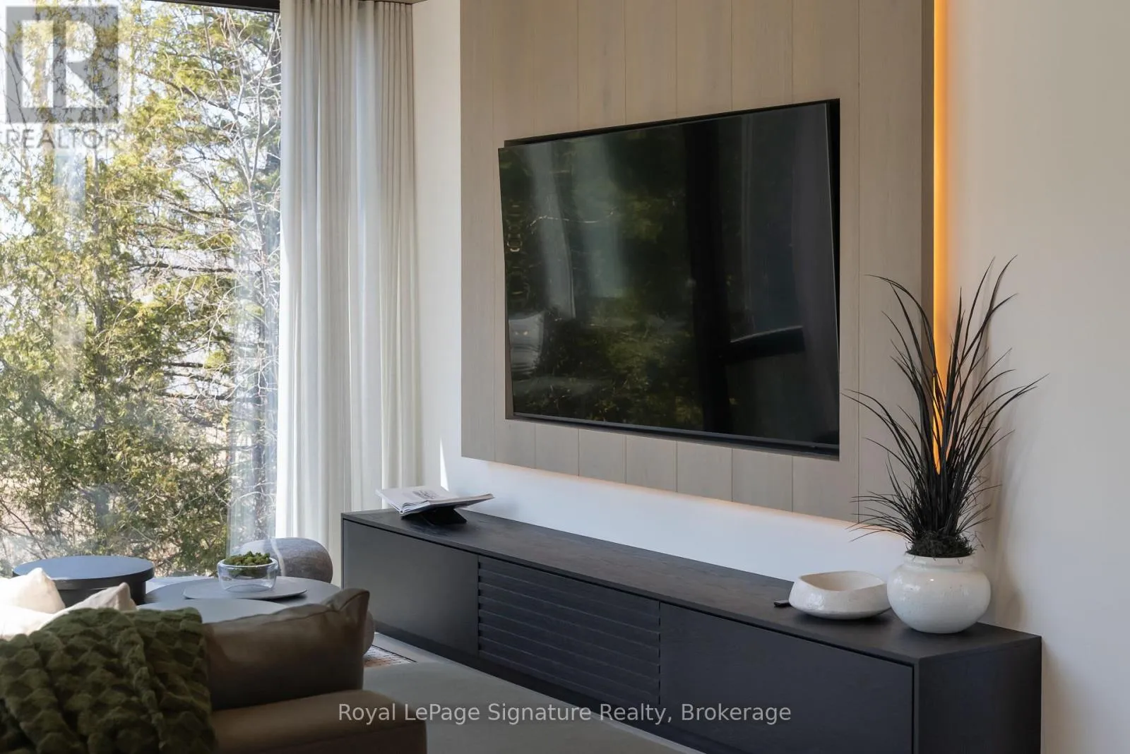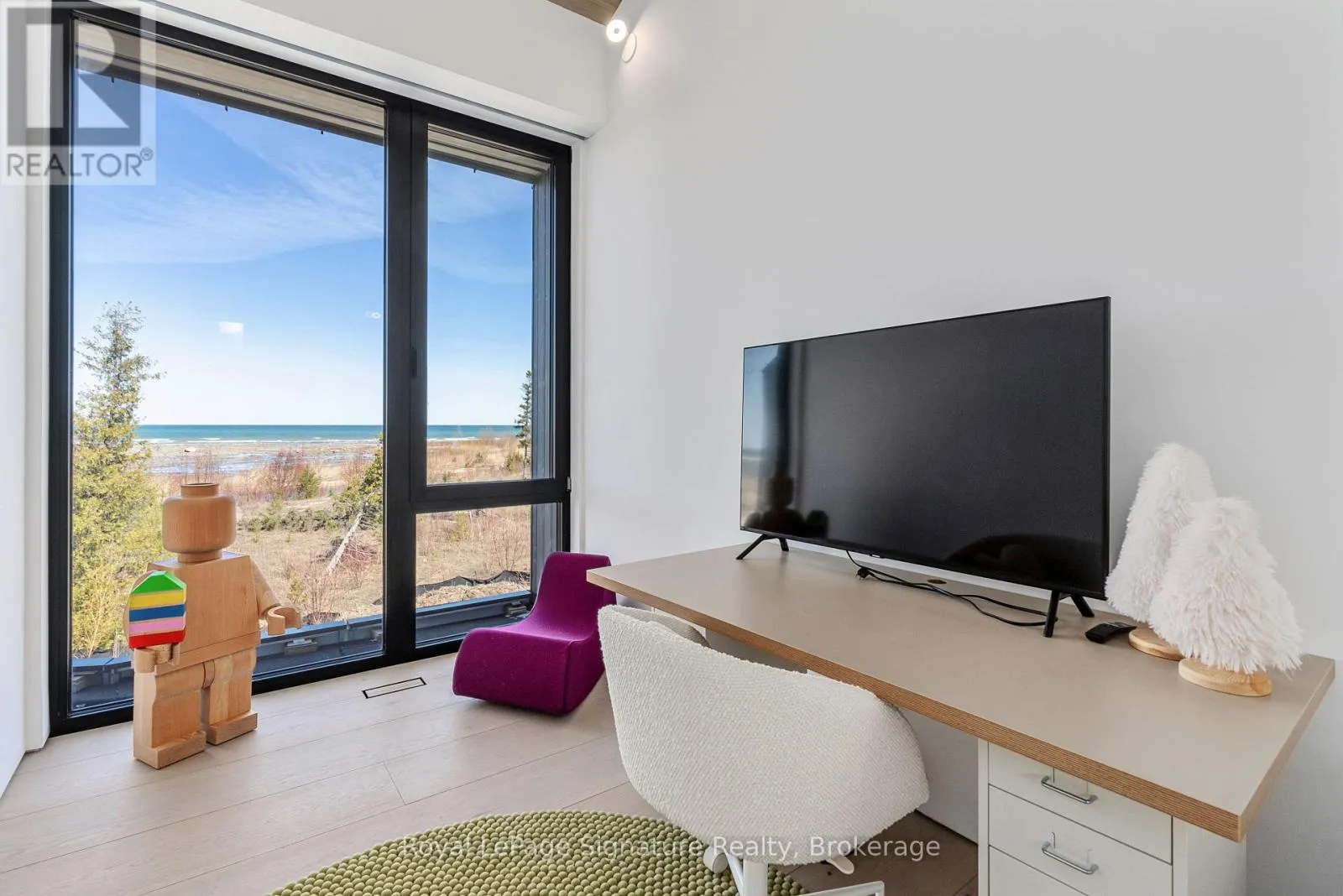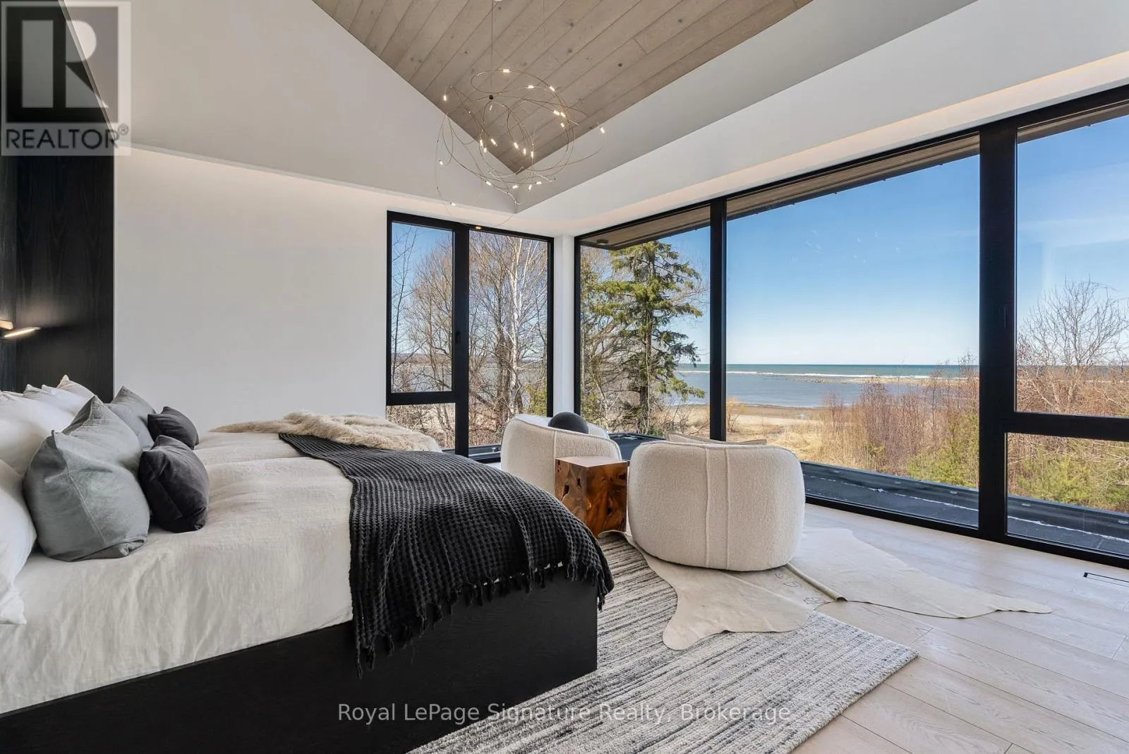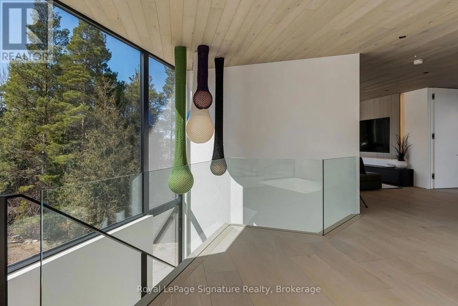 Cross Streets: Sebastian St & Jewel St. ** Directions: From Highway 26, turn north on Delphi Lane. Continue straight onto Jewel St to stop sign.Turn left onto Sebastian St. House is on corner at curve. Welcome to 120 Sebastian Street - a showpiece of modern architecture and refined craftsmanship, designed by Foreshew Design Associates and finished by The Local Studio. Just steps from Georgian Bay & Georgian Peaks Ski Club, this four-bedroom, 3.5-bath home spans approximately 3,500 sq. ft. of thoughtfully curated living space, seamlessly blending high design with the relaxed elegance of Southern Georgian Bay living. Radiant heated polished concrete floors flow through the open-concept main level, where the living and dining area is anchored by a floating wood-burning fireplace and custom metal shelving. Oversized glass pocket doors with motorized screens connect the indoors to the covered patio - perfect for four-season entertaining. Movie nights reach new heights with a 12-foot motorized drop-down projector screen and hidden projector, transforming the space into a private cinema with stunning views of Georgian Bay. The custom Chervin kitchen features marble counters and backsplash, Bosch and JennAir appliances, dual Fisher & Paykel drawer dishwashers, a hidden coffee station, and a concealed walk-in pantry with custom metal shelving - all designed for form and function. Upstairs, the primary suite is a serene retreat with panoramic views of Georgian Bay, a microcement finished ensuite with integrated soaker tub and custom double vanity. One bedroom offers custom triple bunk beds and a centre-pivot arched door, adding a playful architectural touch. Two additional bedrooms and spa-inspired bathrooms provide space and comfort for family or guests. Every detail has been meticulously designed - from the Lutron smart home system and snow-melt driveway and walkway to the Drutex triple-pane windows, metal roof, and radiant in-floor heating throughout the main level and garage. The heated garage with built-ins, bar fridge, and EV charger wiring extends both convenience and style. A rare blend of luxury, design, and Georgian Bay living - just steps from the slopes. (id:27476)