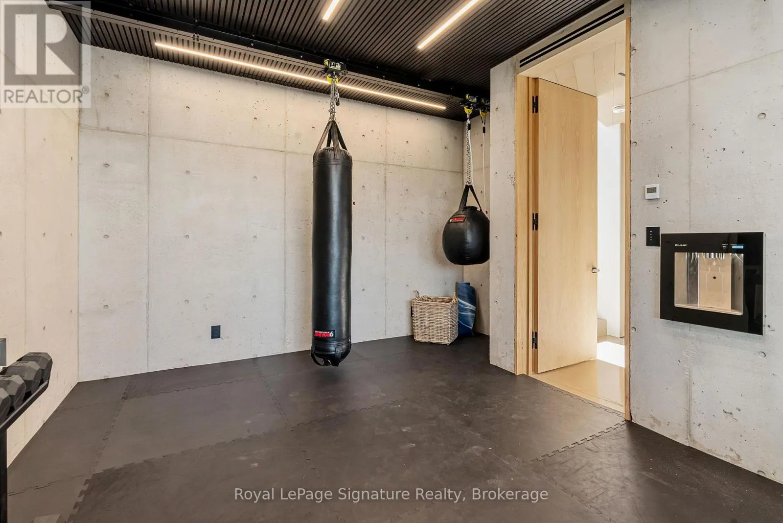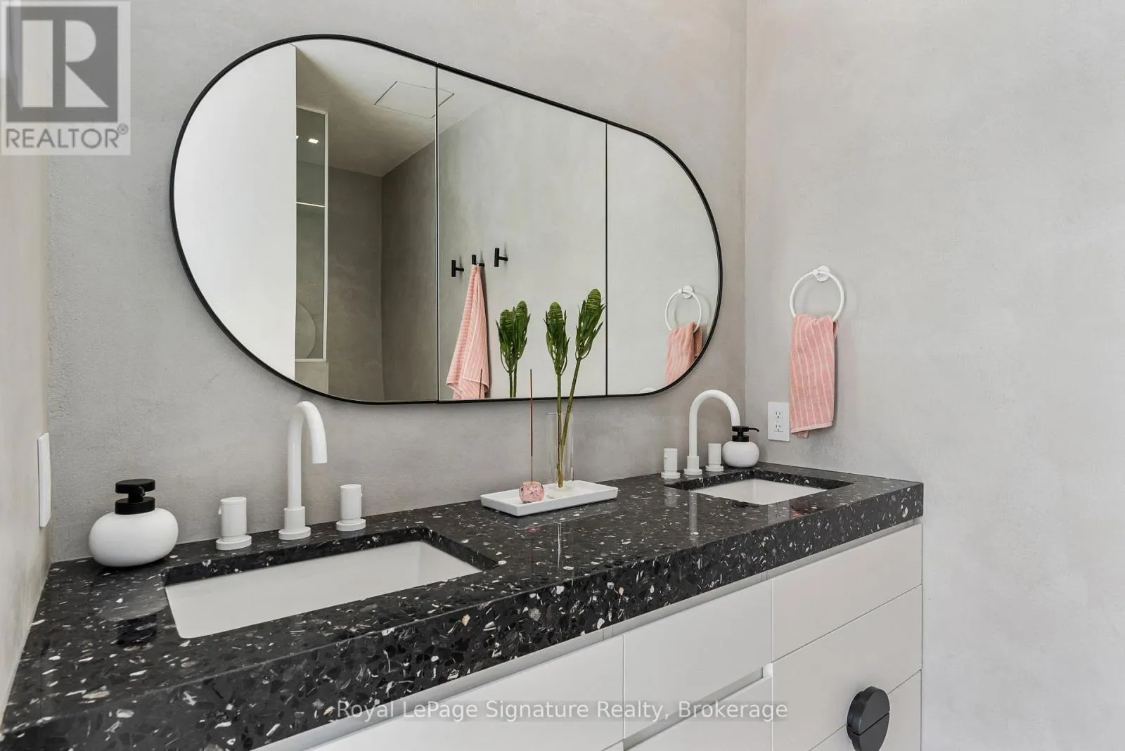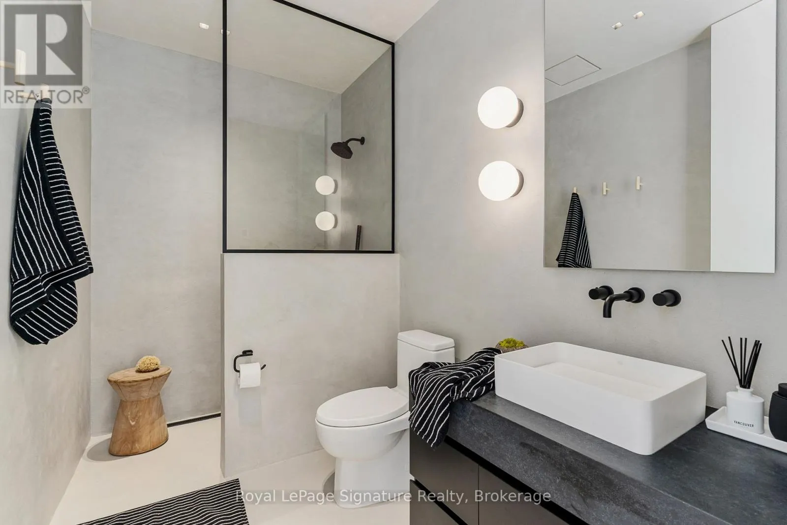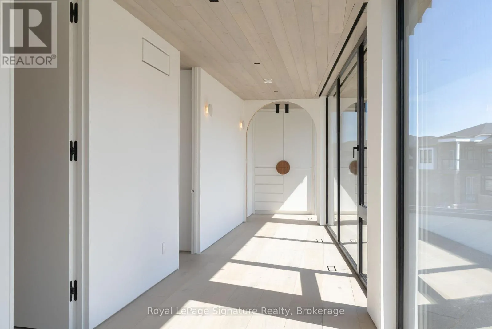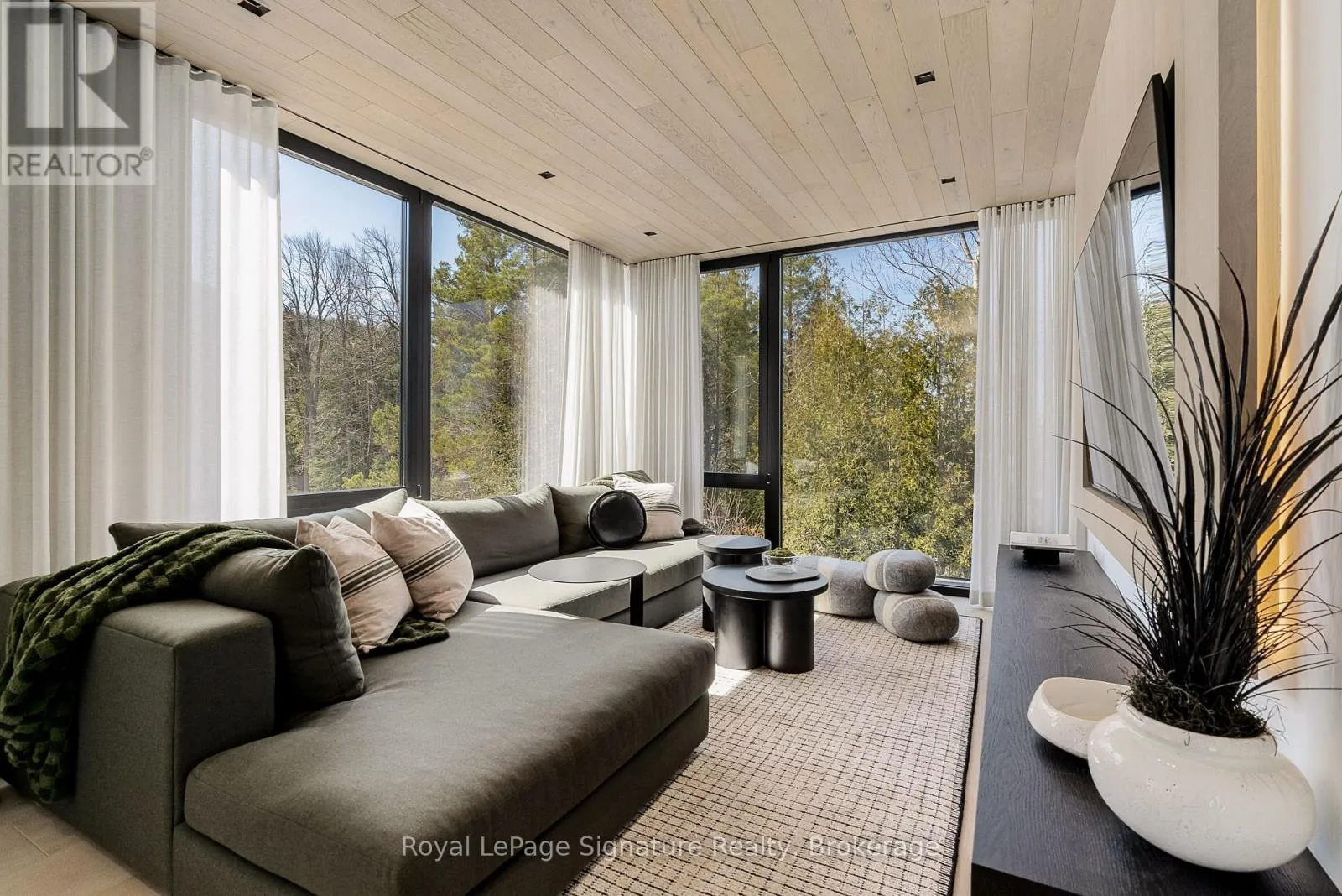 Cross Streets: Sebastian St & Jewel St. ** Directions: From Highway 26, turn north on Delphi Lane. Continue straight onto Jewel St to stop sign.Turn left onto Sebastian St. House is on corner at curve. Welcome to 120 Sebastian Street - a showpiece of modern architecture and refined craftsmanship, designed by Foreshew Design Associates and finished by The Local Studio. Just steps from Georgian Bay & Georgian Peaks Ski Club, this four-bedroom, 3.5-bath home spans approximately 3,500 sq. ft. of thoughtfully curated living space, seamlessly blending high design with the relaxed elegance of Southern Georgian Bay living. Radiant heated polished concrete floors flow through the open-concept main level, where the living and dining area is anchored by a floating wood-burning fireplace and custom metal shelving. Oversized glass pocket doors with motorized screens connect the indoors to the covered patio - perfect for four-season entertaining. Movie nights reach new heights with a 12-foot motorized drop-down projector screen and hidden projector, transforming the space into a private cinema with stunning views of Georgian Bay. The custom Chervin kitchen features marble counters and backsplash, Bosch and JennAir appliances, dual Fisher & Paykel drawer dishwashers, a hidden coffee station, and a concealed walk-in pantry with custom metal shelving - all designed for form and function. Upstairs, the primary suite is a serene retreat with panoramic views of Georgian Bay, a microcement finished ensuite with integrated soaker tub and custom double vanity. One bedroom offers custom triple bunk beds and a centre-pivot arched door, adding a playful architectural touch. Two additional bedrooms and spa-inspired bathrooms provide space and comfort for family or guests. Every detail has been meticulously designed - from the Lutron smart home system and snow-melt driveway and walkway to the Drutex triple-pane windows, metal roof, and radiant in-floor heating throughout the main level and garage. The heated garage with built-ins, bar fridge, and EV charger wiring extends both convenience and style. A rare blend of luxury, design, and Georgian Bay living - just steps from the slopes. (id:27476)