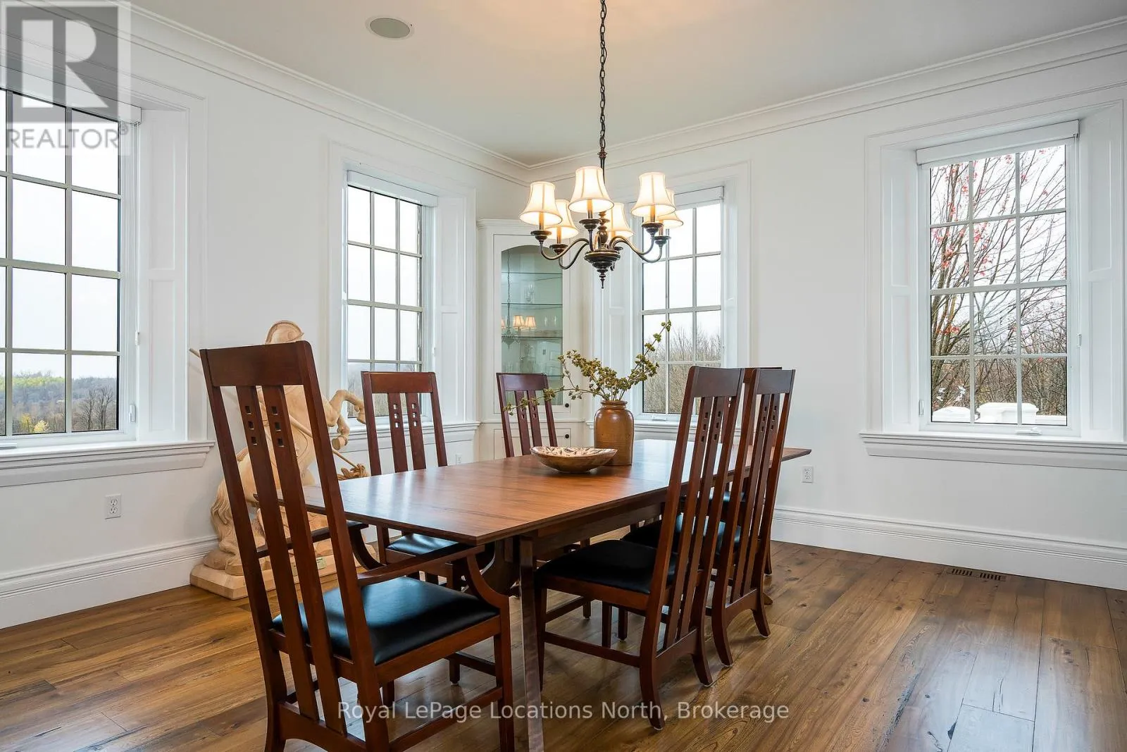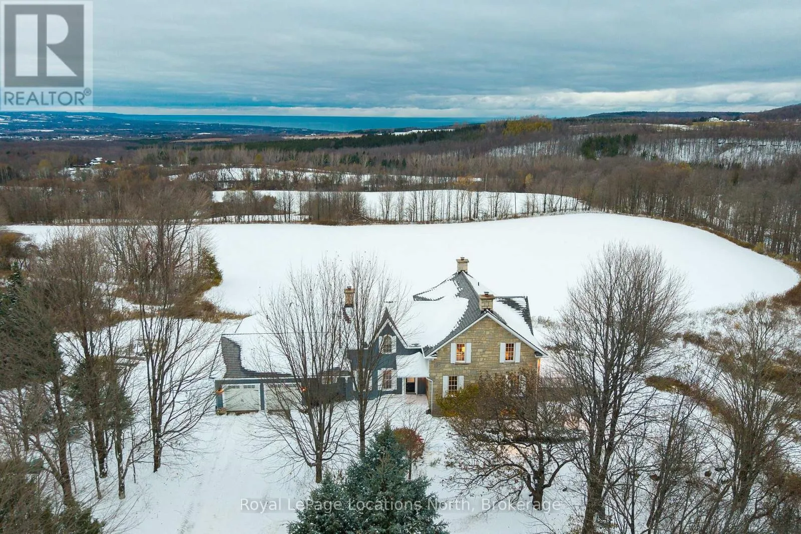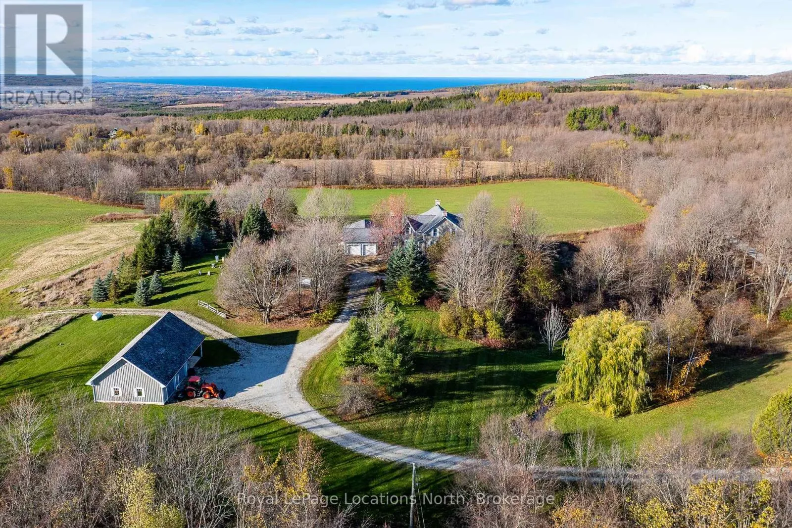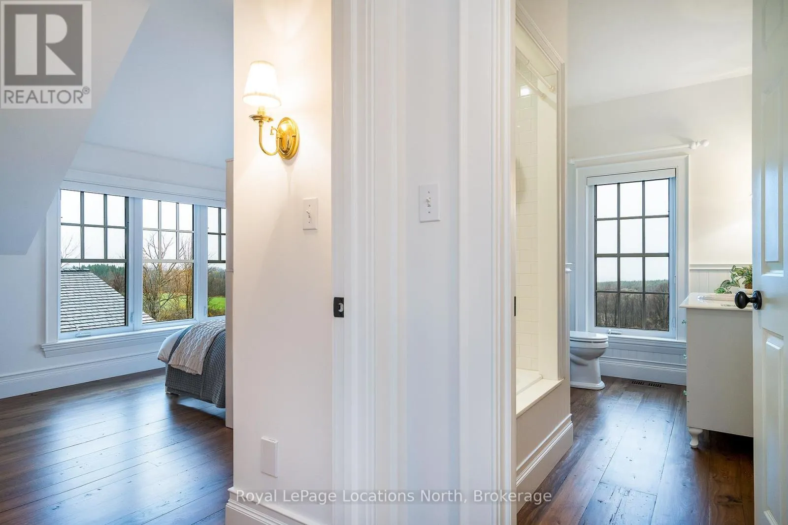Cross Streets: Grey Road 119/6th Line. ** Directions: Grey Rd 119 to 6th Line, head North on 6th line. Second property on West side. Exceptional 50-acre country estate in The Blue Mountains offering privacy, craftsmanship, and panoramic Georgian Bay views. Custom-built in 2007 by Peter Schlegel, this 6,500 sq. ft. stone farmhouse embodies the elegance of an authentic Ontario homestead with refined modern comforts. Designed with care and incorporating reclaimed materials from the original farmstead, the result is a timeless home of warmth and distinction. Wide-plank, pegged hardwood floors, slate, and tile accents, along with custom crown mouldings, set an elegant tone. Two Rumford wood-burning fireplaces and two gas fireplaces add charm across formal and informal spaces, including a welcoming living room, family room, and dining area. The well-appointed kitchen features custom cabinetry, stone counters, and fine finishes. The main-floor primary suite features a gas fireplace, a walk-in closet, and a spa-inspired marble ensuite with a claw-foot tub and glass shower. Upstairs offers four bedrooms, plus a large flex room that is ideal as a fifth bedroom, office, or lounge. The finished lower level has a recreation room with a bar, a living room with a gas fireplace, and a 700-bottle wine cellar. Manicured gardens and a 34' x 33' flagstone terrace overlook rolling fields toward Georgian Bay. The Bruce Trail is just steps away for hiking and exploration. The property includes an attached double garage and a detached 50' x 30' drive shed with two bays, a heated studio, a powder room, and a greenhouse. Approximately 30 acres of organic fields and 15 acres of forest, which include streams and a seasonal karst spring/waterfall. Geothermal heating, a 400-amp service, and a generator ensure year-round comfort. Fifteen minutes to both Collingwood and Thornbury. (id:27476)