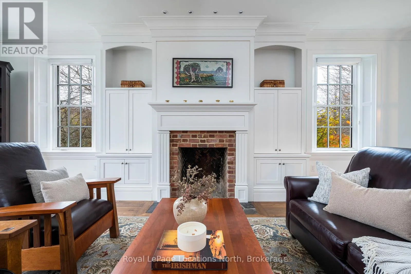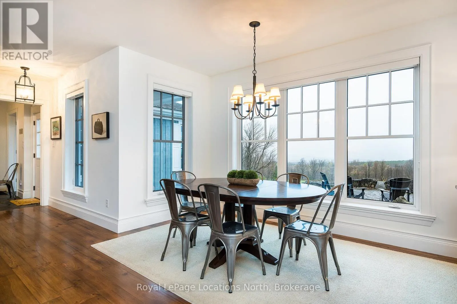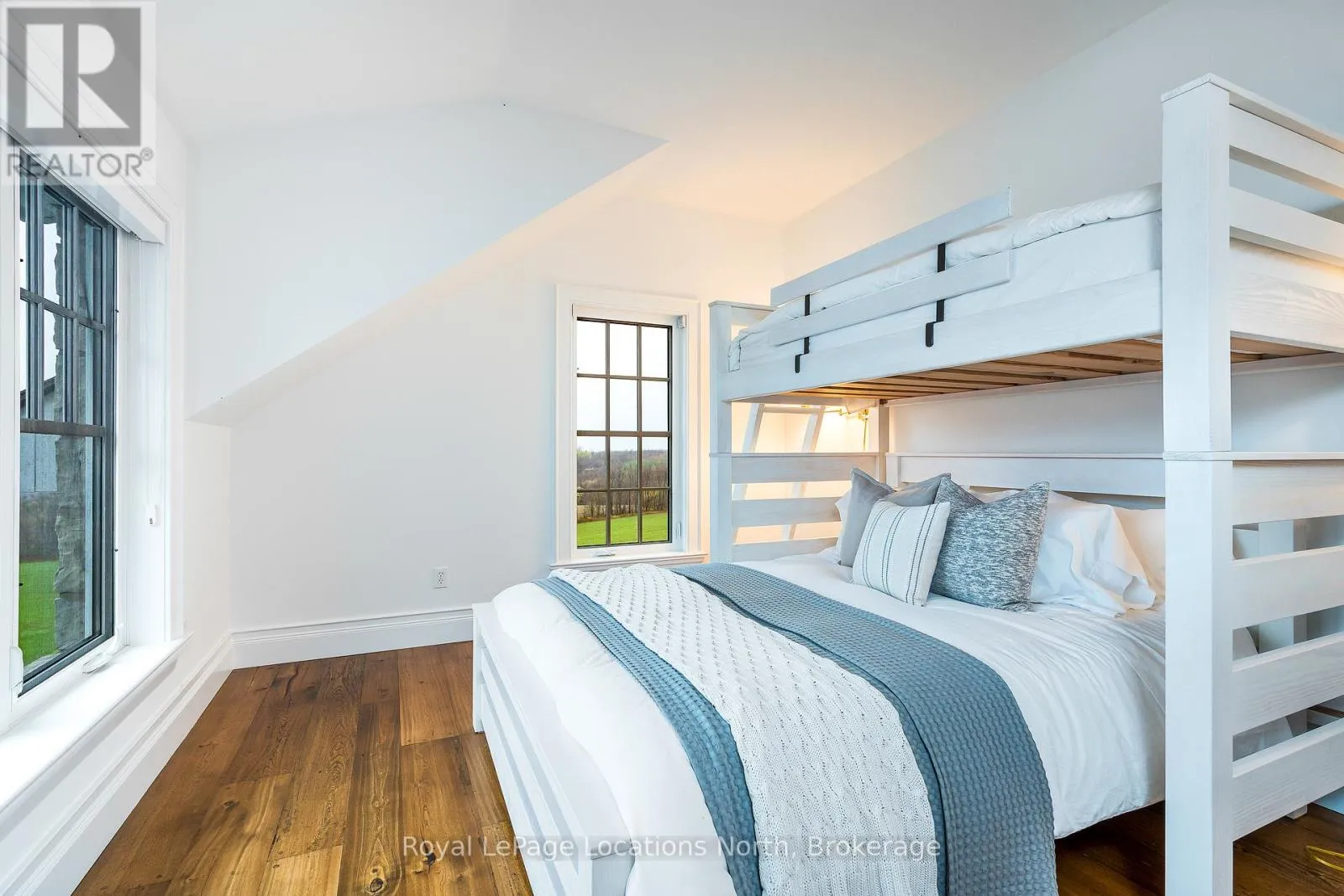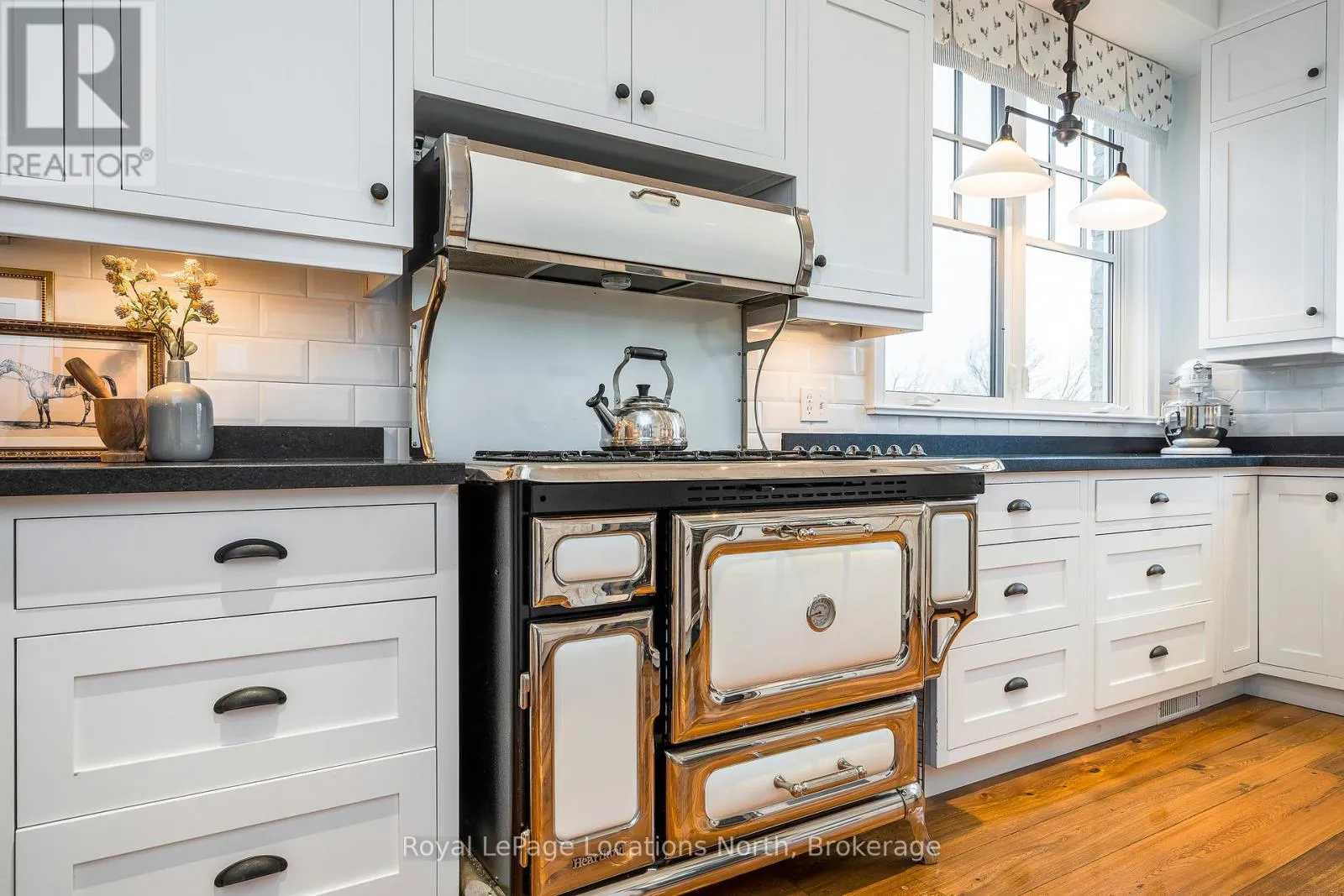 Cross Streets: Grey Road 119/6th Line. ** Directions: Grey Rd 119 to 6th Line, head North on 6th line. Second property on West side. Exceptional 50-acre country estate in The Blue Mountains offering privacy, craftsmanship, and panoramic Georgian Bay views. Custom-built in 2007 by Peter Schlegel, this 6,500 sq. ft. stone farmhouse embodies the elegance of an authentic Ontario homestead with refined modern comforts. Designed with care and incorporating reclaimed materials from the original farmstead, the result is a timeless home of warmth and distinction. Wide-plank, pegged hardwood floors, slate, and tile accents, along with custom crown mouldings, set an elegant tone. Two Rumford wood-burning fireplaces and two gas fireplaces add charm across formal and informal spaces, including a welcoming living room, family room, and dining area. The well-appointed kitchen features custom cabinetry, stone counters, and fine finishes. The main-floor primary suite features a gas fireplace, a walk-in closet, and a spa-inspired marble ensuite with a claw-foot tub and glass shower. Upstairs offers four bedrooms, plus a large flex room that is ideal as a fifth bedroom, office, or lounge. The finished lower level has a recreation room with a bar, a living room with a gas fireplace, and a 700-bottle wine cellar. Manicured gardens and a 34' x 33' flagstone terrace overlook rolling fields toward Georgian Bay. The Bruce Trail is just steps away for hiking and exploration. The property includes an attached double garage and a detached 50' x 30' drive shed with two bays, a heated studio, a powder room, and a greenhouse. Approximately 30 acres of organic fields and 15 acres of forest, which include streams and a seasonal karst spring/waterfall. Geothermal heating, a 400-amp service, and a generator ensure year-round comfort. Fifteen minutes to both Collingwood and Thornbury. (id:27476)