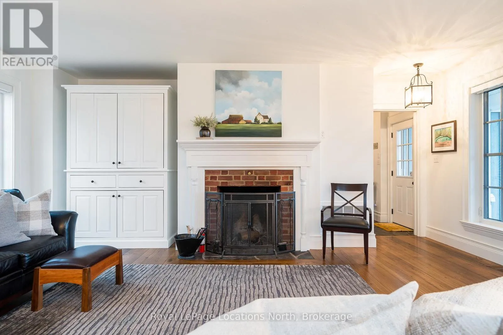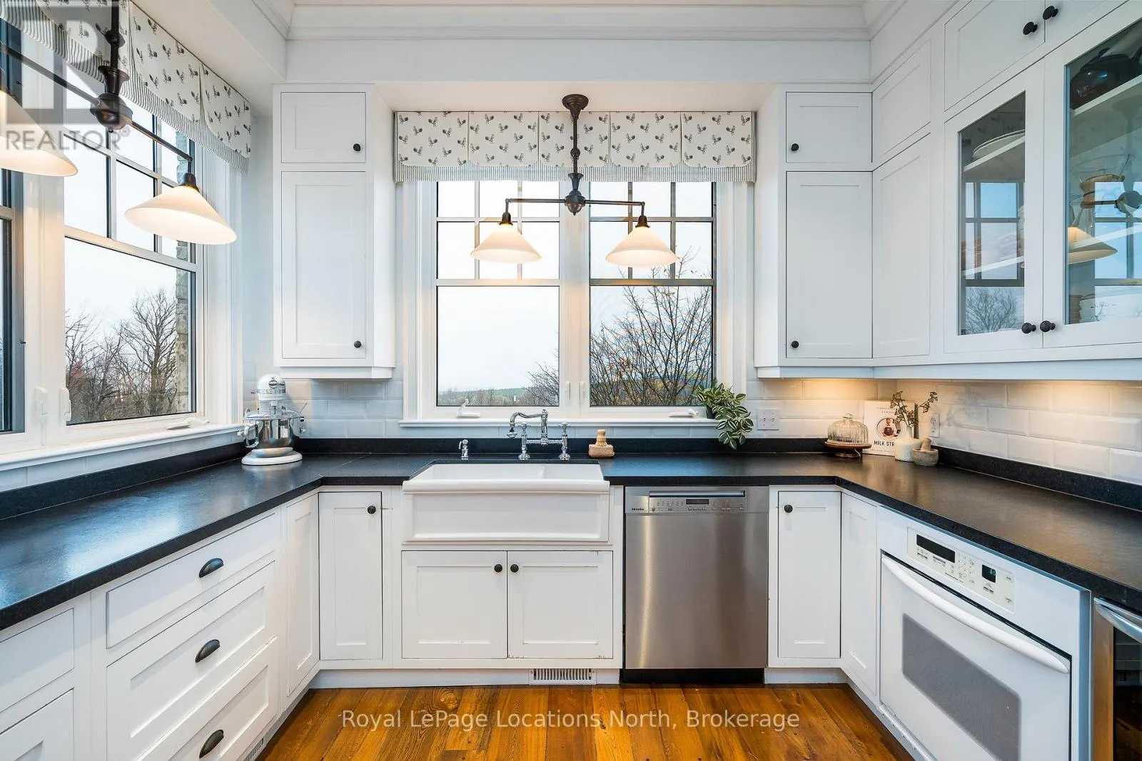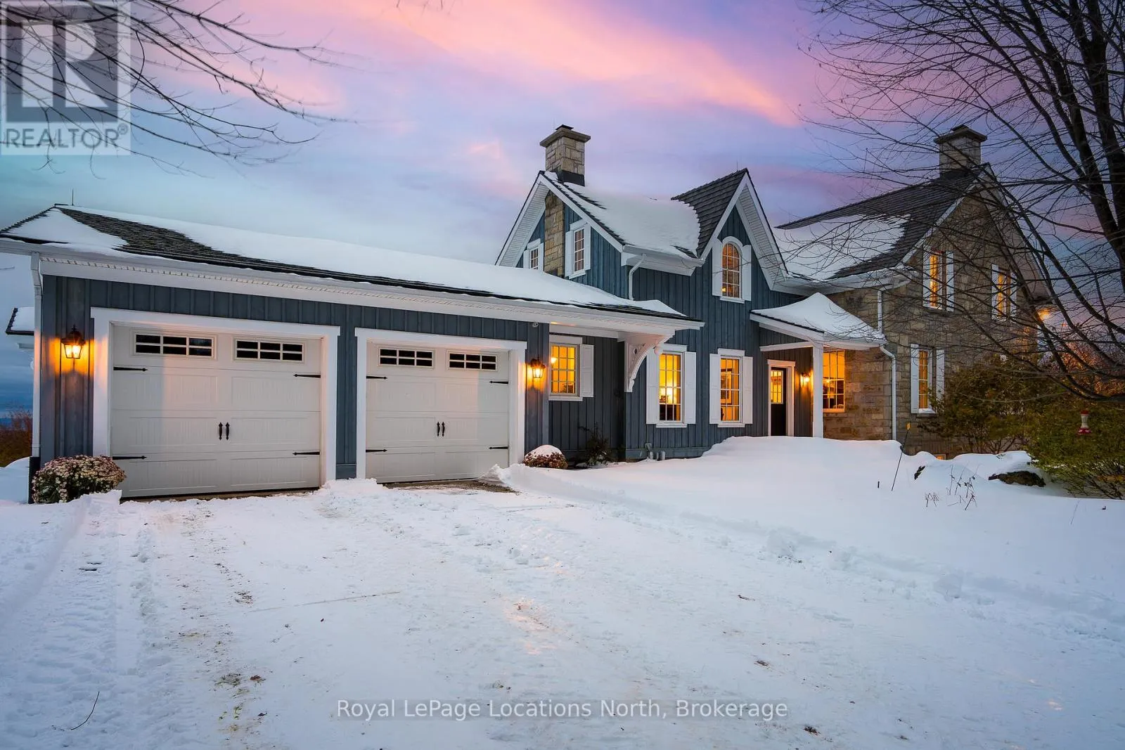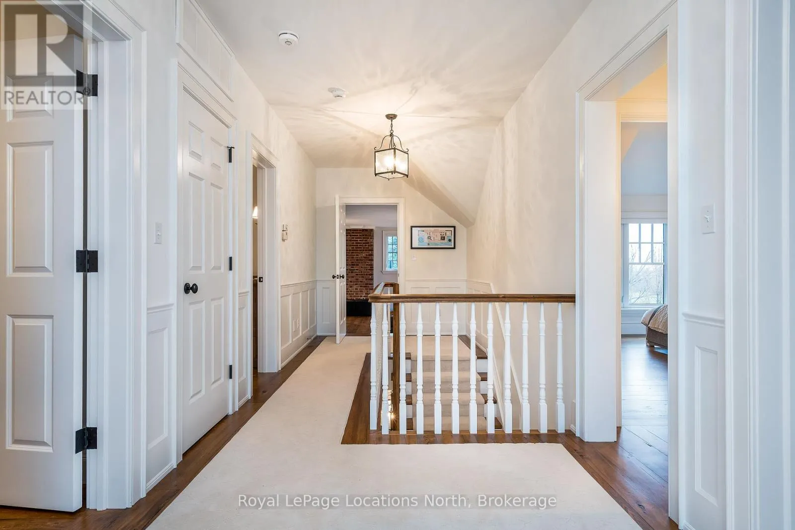 Cross Streets: Grey Road 119/6th Line. ** Directions: Grey Rd 119 to 6th Line, head North on 6th line. Second property on West side. Exceptional 50-acre country estate in The Blue Mountains offering privacy, craftsmanship, and panoramic Georgian Bay views. Custom-built in 2007 by Peter Schlegel, this 6,500 sq. ft. stone farmhouse embodies the elegance of an authentic Ontario homestead with refined modern comforts. Designed with care and incorporating reclaimed materials from the original farmstead, the result is a timeless home of warmth and distinction. Wide-plank, pegged hardwood floors, slate, and tile accents, along with custom crown mouldings, set an elegant tone. Two Rumford wood-burning fireplaces and two gas fireplaces add charm across formal and informal spaces, including a welcoming living room, family room, and dining area. The well-appointed kitchen features custom cabinetry, stone counters, and fine finishes. The main-floor primary suite features a gas fireplace, a walk-in closet, and a spa-inspired marble ensuite with a claw-foot tub and glass shower. Upstairs offers four bedrooms, plus a large flex room that is ideal as a fifth bedroom, office, or lounge. The finished lower level has a recreation room with a bar, a living room with a gas fireplace, and a 700-bottle wine cellar. Manicured gardens and a 34' x 33' flagstone terrace overlook rolling fields toward Georgian Bay. The Bruce Trail is just steps away for hiking and exploration. The property includes an attached double garage and a detached 50' x 30' drive shed with two bays, a heated studio, a powder room, and a greenhouse. Approximately 30 acres of organic fields and 15 acres of forest, which include streams and a seasonal karst spring/waterfall. Geothermal heating, a 400-amp service, and a generator ensure year-round comfort. Fifteen minutes to both Collingwood and Thornbury. (id:27476)