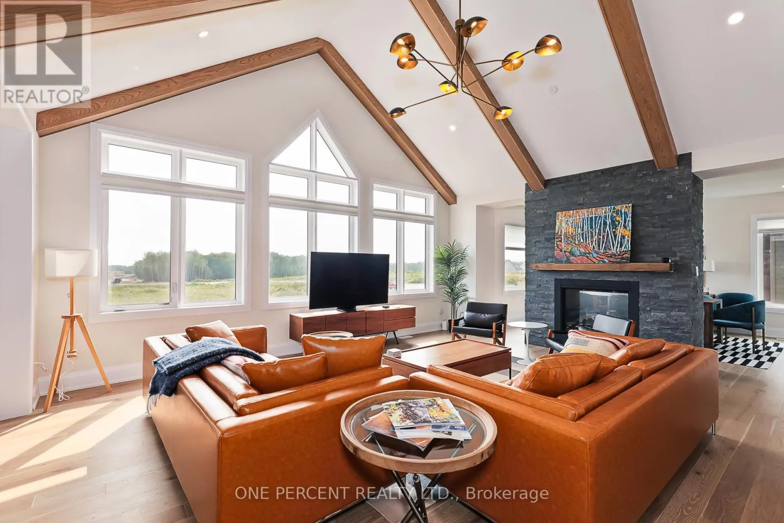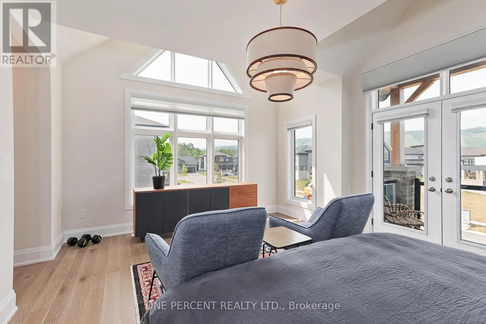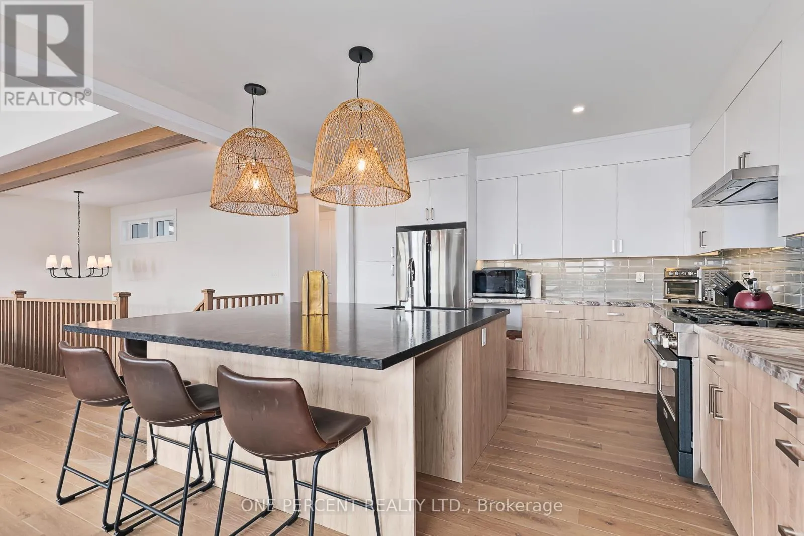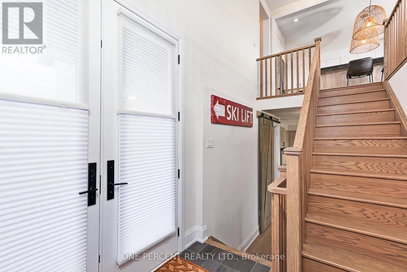 Stoneleigh and Cattail Welcome to 114 Cattail Crescent, a 4,558 sqft mountain house, boasting elegant architectural upgrades, unique stone, fibre cement, and wood grain siding, along with ornamental wood details. A 50-foot wide, side-facing garage creates an impressive street presence, with plenty of parking.This layout features a primary living space (1,883 sqft) on the second floor, additional primary living space on the first floor (1,548 sqft), plus a fully finished walkout basement (1,127sqft). The open second floor, with high ceilings and windows, offers impressive views and features a large deck, custom kitchen, servery, eating area, faux beam covered lodge room, formal dining room, and den, divided by a slate-clad floor-to-ceiling gas fireplace. The expansive owners suite includes cathedral ceilings, a private loggia, spacious walk-in closet, and a beautifully decorated ensuite with standalone tub and a large glass shower enclosure. The main level entrance leads to the main floor with a large bar/kitchen, a family room with a deck, backyard access and beautifully decorated rooms with custom light fixtures. There are also three good-sized bedrooms and two full bathrooms on this level. A separate side door and a garage entrance, leads to a spacious storage room and laundry room. The self-contained basement with glass door walkout, offers a large open space, wet bar, two bedrooms with egress windows, and a full bathroom.The house is beautifully located within a short walking distance to Blue Mountain Village and a complimentary shuttle to many amenities, including the private Blue Mountain Beach. This professionally decorated house with great street presence and exceptional floor plan includes all light fixtures and furniture. (id:27476)
