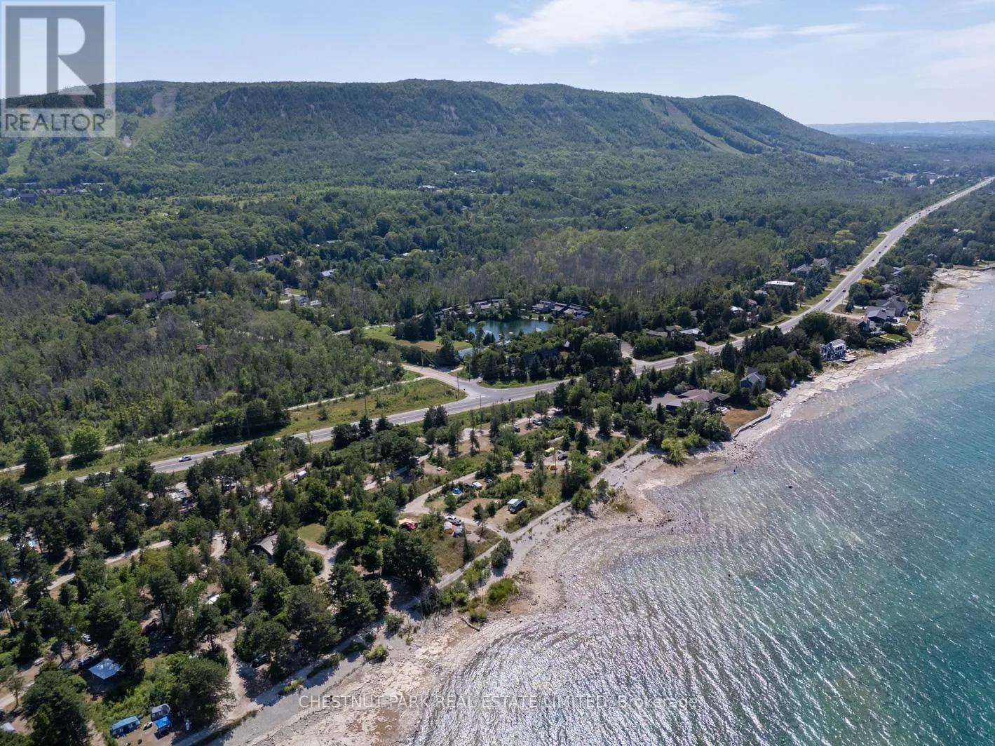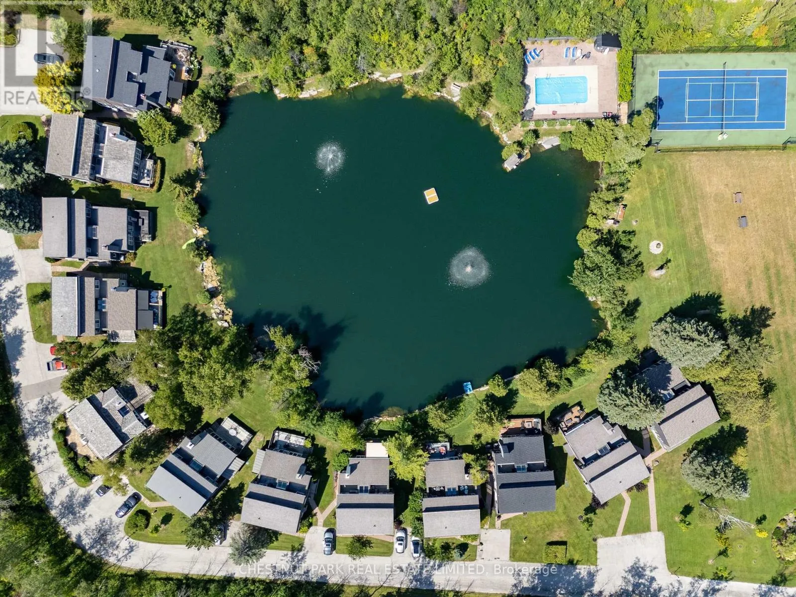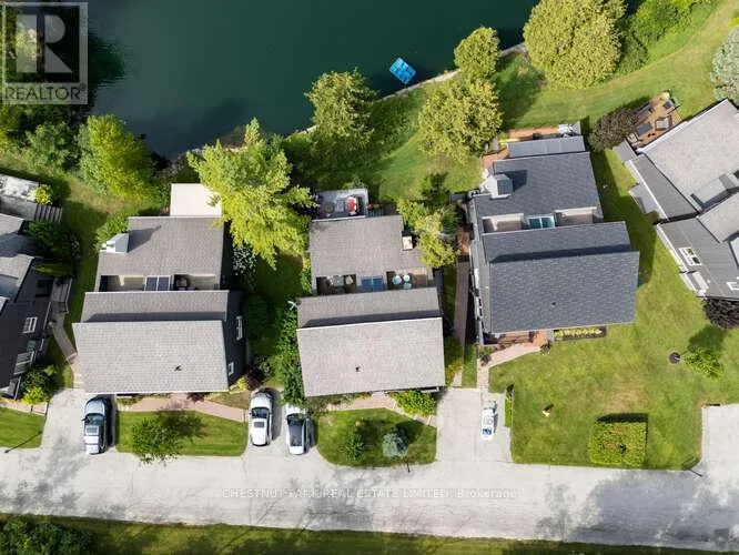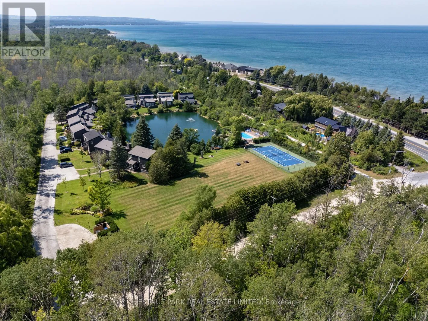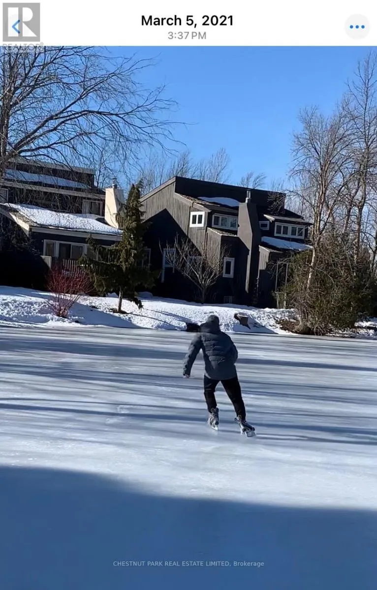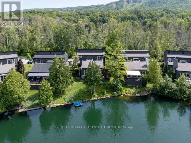 Cross Streets: Hidden Lake Rd / Hwy 26. ** Directions: West of Arrowhead Rd on Hwy 26 across fromCraigleigh Provincial Park. Set within the natural beauty of the Town of The Blue Mountains, and nestled between the ski hills and Georgian Bay, the private 12-home enclave of Hidden Lake is a sought-after haven for those who value peace, recreation, and elegant living. Residents enjoy an exclusive tennis and pickleball court, a sun-filled pool, a wide-open playing field, and a serene swimming pond, complete with a floating dock and diving tower - the perfect setting for four-season enjoyment. A private gate provides direct access to the Georgian Trail, perfect for biking, hiking, & x-country skiing, with a short stroll to the Bay. Chalet 9 offers almost 3000 sq ft of living space over 3 levels, 4 beds & 4 baths. Inside, the sunken great room showcases soaring ceilings, solid Fir beams, and views over the private 1-acre lake. A large kitchen with custom counters & breakfast bar opens seamlessly to the main living area - perfect for hosting family and friends. There is also a versatile main floor bedroom/ office tucked away, with a powder room across the hall. Two of three upstairs bedrooms feature sliding doors to private porches, offering peaceful views of Hidden Lake and peekaboo glimpses of Georgian Bay. The bright lower level offers a rec room, wet bar, media room, and bunk room. Outside, enjoy beautiful gardens, a front deck with a gas BBQ, and a back deck with pond views and a retractable awning. Homeowners share costs for grounds and amenities as a common elements condo. Close to Thornbury's renowned cideries, restaurants, bakeries, & shops, Scandinave Spa, & Blue Mountain resort - this is an exceptional location and a rare opportunity. This property is attractively priced for immediate sale - come play this winter! (id:27476)