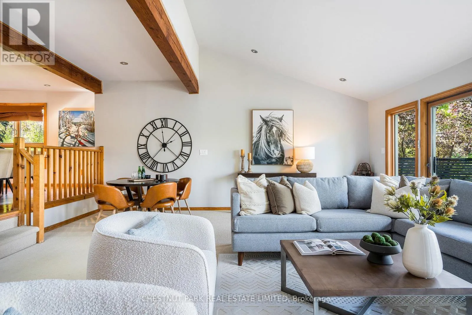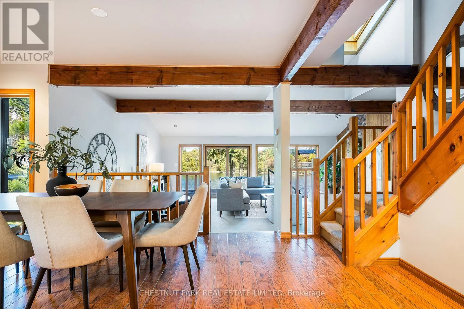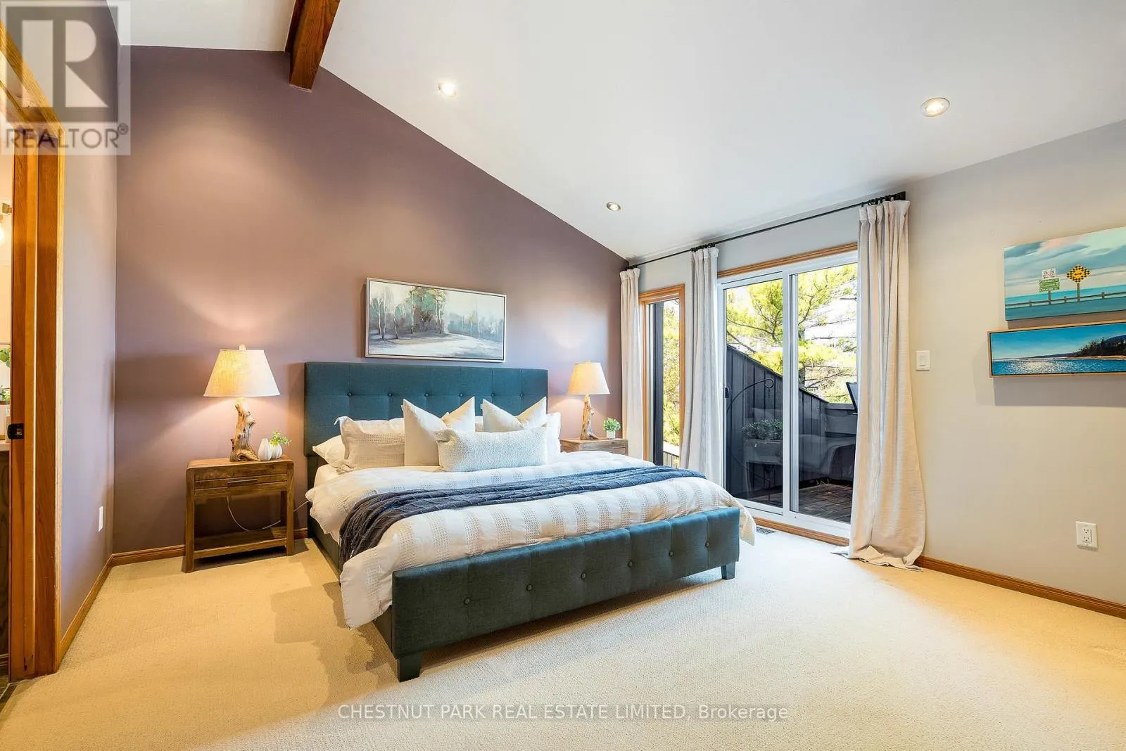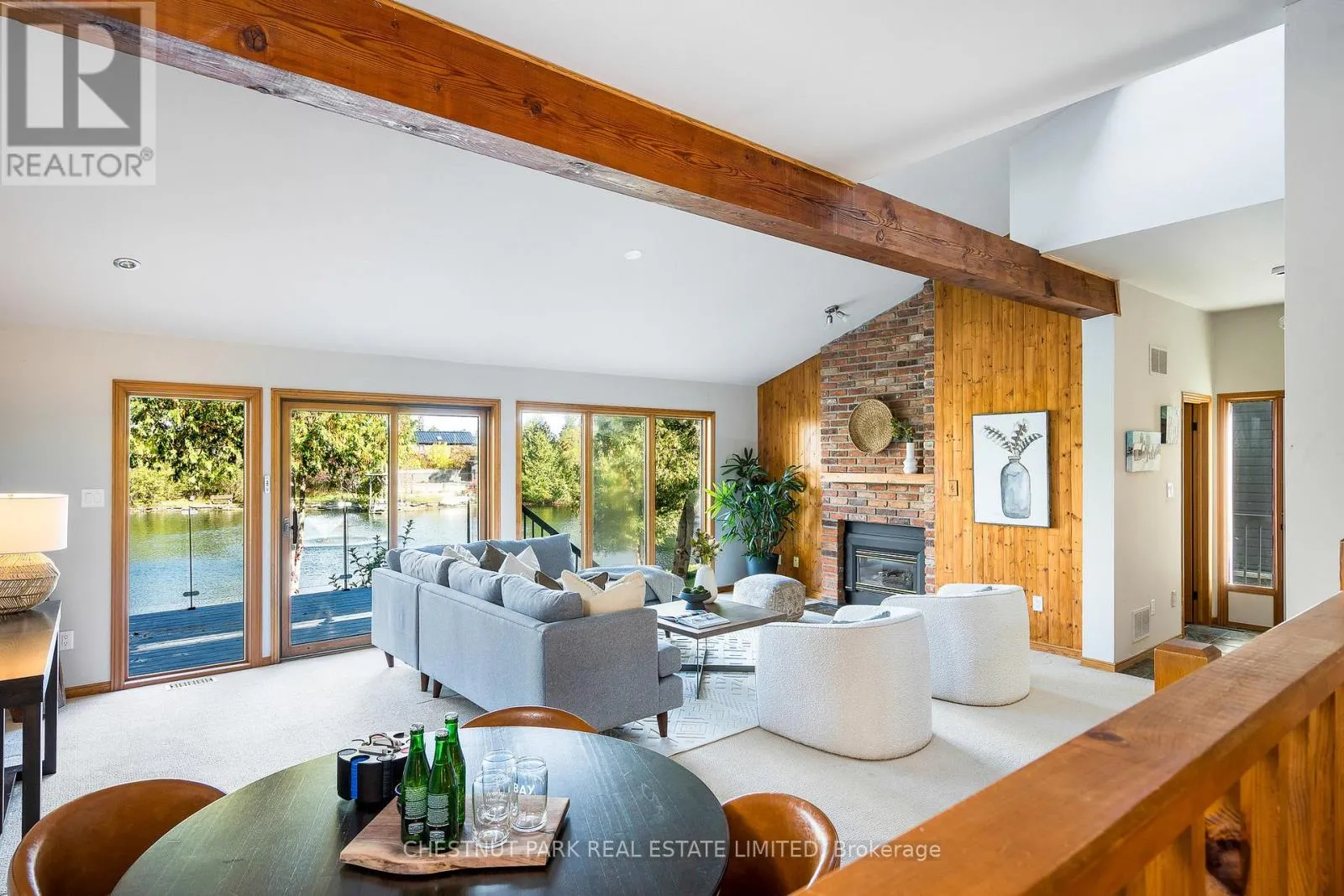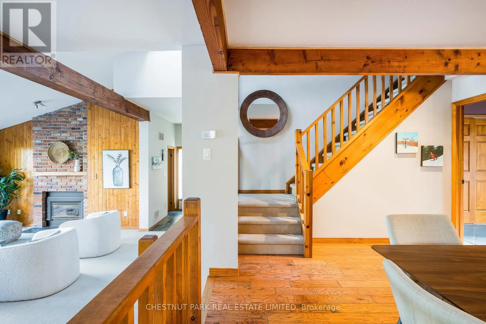 Cross Streets: Hidden Lake Rd / Hwy 26. ** Directions: West of Arrowhead Rd on Hwy 26 across fromCraigleigh Provincial Park. Set within the natural beauty of the Town of The Blue Mountains, and nestled between the ski hills and Georgian Bay, the private 12-home enclave of Hidden Lake is a sought-after haven for those who value peace, recreation, and elegant living. Residents enjoy an exclusive tennis and pickleball court, a sun-filled pool, a wide-open playing field, and a serene swimming pond, complete with a floating dock and diving tower - the perfect setting for four-season enjoyment. A private gate provides direct access to the Georgian Trail, perfect for biking, hiking, & x-country skiing, with a short stroll to the Bay. Chalet 9 offers almost 3000 sq ft of living space over 3 levels, 4 beds & 4 baths. Inside, the sunken great room showcases soaring ceilings, solid Fir beams, and views over the private 1-acre lake. A large kitchen with custom counters & breakfast bar opens seamlessly to the main living area - perfect for hosting family and friends. There is also a versatile main floor bedroom/ office tucked away, with a powder room across the hall. Two of three upstairs bedrooms feature sliding doors to private porches, offering peaceful views of Hidden Lake and peekaboo glimpses of Georgian Bay. The bright lower level offers a rec room, wet bar, media room, and bunk room. Outside, enjoy beautiful gardens, a front deck with a gas BBQ, and a back deck with pond views and a retractable awning. Homeowners share costs for grounds and amenities as a common elements condo. Close to Thornbury's renowned cideries, restaurants, bakeries, & shops, Scandinave Spa, & Blue Mountain resort - this is an exceptional location and a rare opportunity. This property is attractively priced for immediate sale - come play this winter! (id:27476)