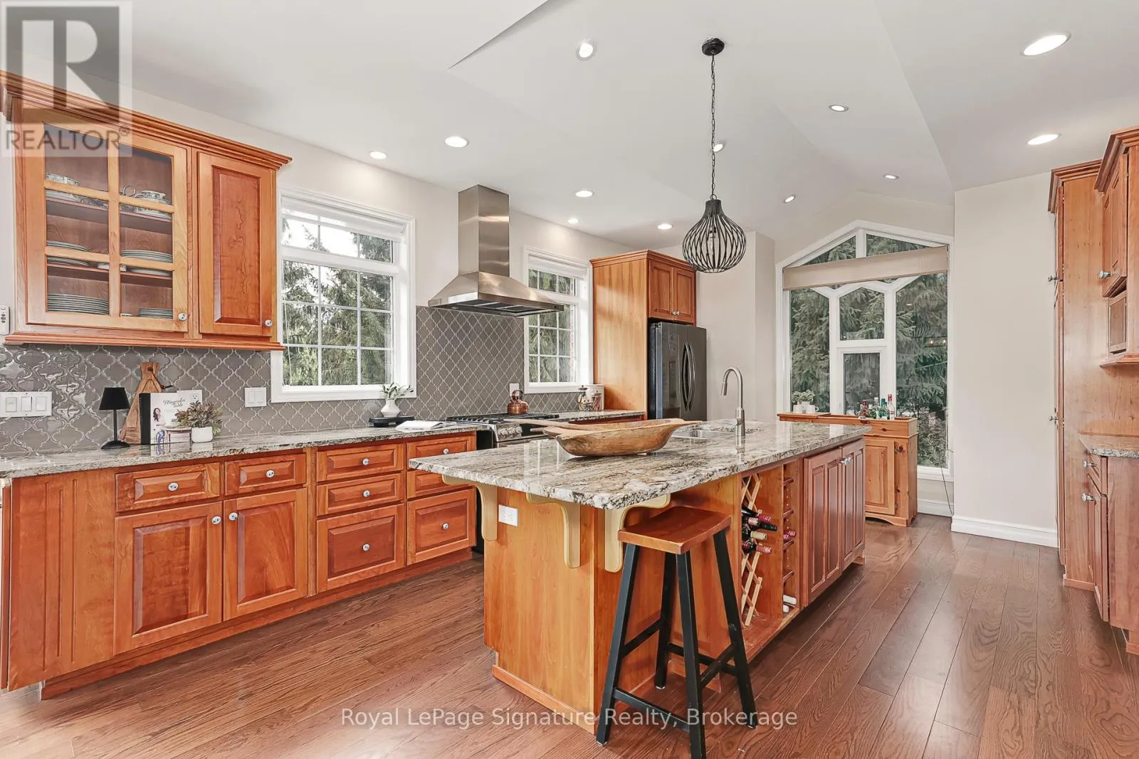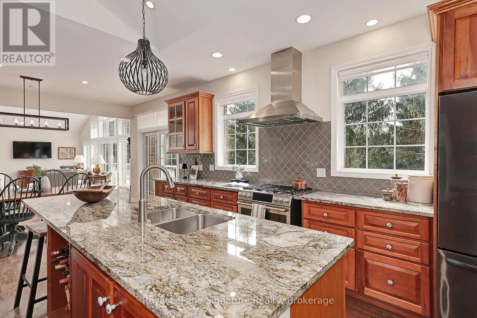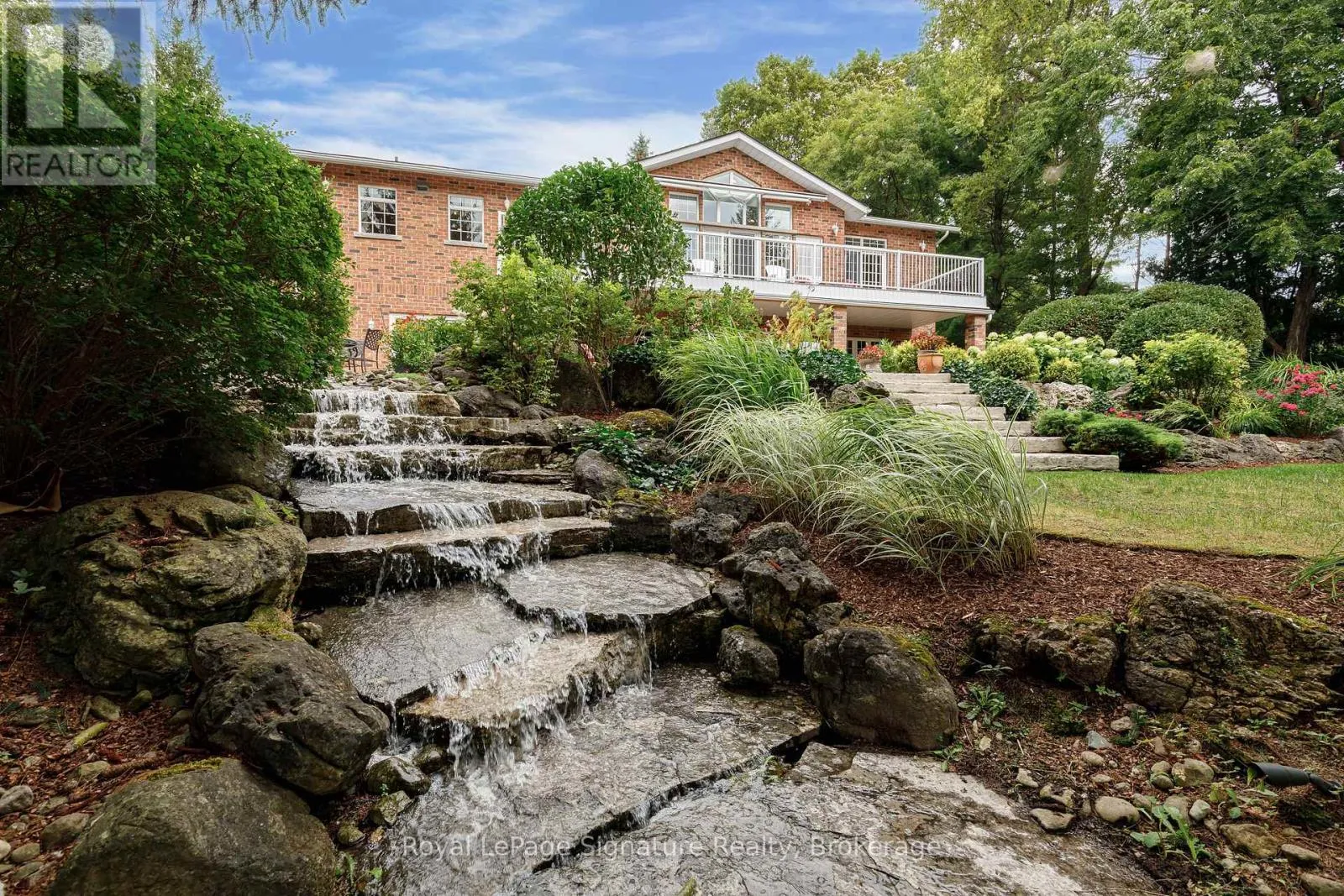 Cross Streets: Marsh Street. ** Directions: Grey 13 to Russell. Welcome to 180 Russell, an exceptional brick residence that blends privacy, elegance, and outstanding outdoor living. Set on a rolling, professionally landscaped lot, the property is framed by stone walkways, soldier stone detailing along the driveway, and a stamped concrete entry, creating striking curb appeal from the moment you arrive. Designed for year-round enjoyment, the backyard is a true retreat, featuring a tranquil waterfall, outdoor fireplace, expansive deck, covered patios, and a walk-out lower level-perfect for effortless entertaining and relaxed outdoor living. Inside, the main level offers a bright, open-concept layout where the kitchen, dining, and living areas flow seamlessly together. Large sliding doors extend the living space to a generous deck overlooking the private, serene yard. The primary suite is a private haven with his-and-hers closets and a spa-inspired ensuite with heated floors. A flexible office or den, a full bathroom, convenient laundry, and direct garage access complete the main floor. The fully finished lower level is ideal for hosting and extended family, featuring a spacious family room with gas fireplace, three additional bedrooms, a full bath, and a two-piece bath. Radiant in-floor heating ensures year-round comfort, while the thoughtfully designed second kitchen-equipped with a cooktop, sink, dishwasher, bar fridge, and beverage fridge-enhances both indoor and outdoor entertaining. With its own walk-outs, bedrooms, bathrooms, and kitchen, this level also offers excellent potential for a private in-law suite.Additional highlights include a covered front porch, a two-car garage with inside entry, beautifully curated landscaping, and a Wi-Fi-enabled smart irrigation system for easy lawn and garden maintenance. With its exceptional outdoor spaces, generous interior layout, and peaceful setting, 180 Russell delivers the perfect balance of comfort, functionality, and refined living. (id:27476)
