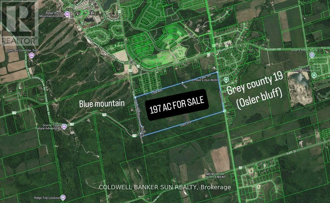 Cross Streets: Grey County 19 And Mountain Rd. ** Directions: Grey County 19 & Mountain Rd. Rare opportunity for investors & developers alike! 197 Acres +/- of four seasons adventures at the base of blue mountain, AAA+ Location! This expansive parcel of land is situated within the towns Future Secondary Plan (FSA). Fronting on both Scenic caves road, and Grey county 19 road (Osler Bluff). This parcel of land has the Potential to develop into a subdivision once the town infrastructure permits, or a great land-bank opportunity for the future. Currently it is permitted to: build a single detached luxurious dwelling or hobby farm. With breath-taking views of Blue Mountain and a rich history as a apple orchard, this property is sure to be a valuable asset for anyone looking to invest in this rapidly developing area. Perfectly situated on the other side of the street from Blue Mountain Ski Resort. Official Plan: "Future Secondary Plan Areas" (Fsa); Town Zoning : "Deferred Development" MPAC :"Residential Development Land" Both the Buyer And Buyers Agent are To Perform their Own Due Diligence To Satisfy Themselves With The Current Use, and Future Potential Of This Property. Here is your opportunity, Discover the great Canadian Outdoors and get ready for your chance, to be a part of Blue Mountain's future. (id:27476)