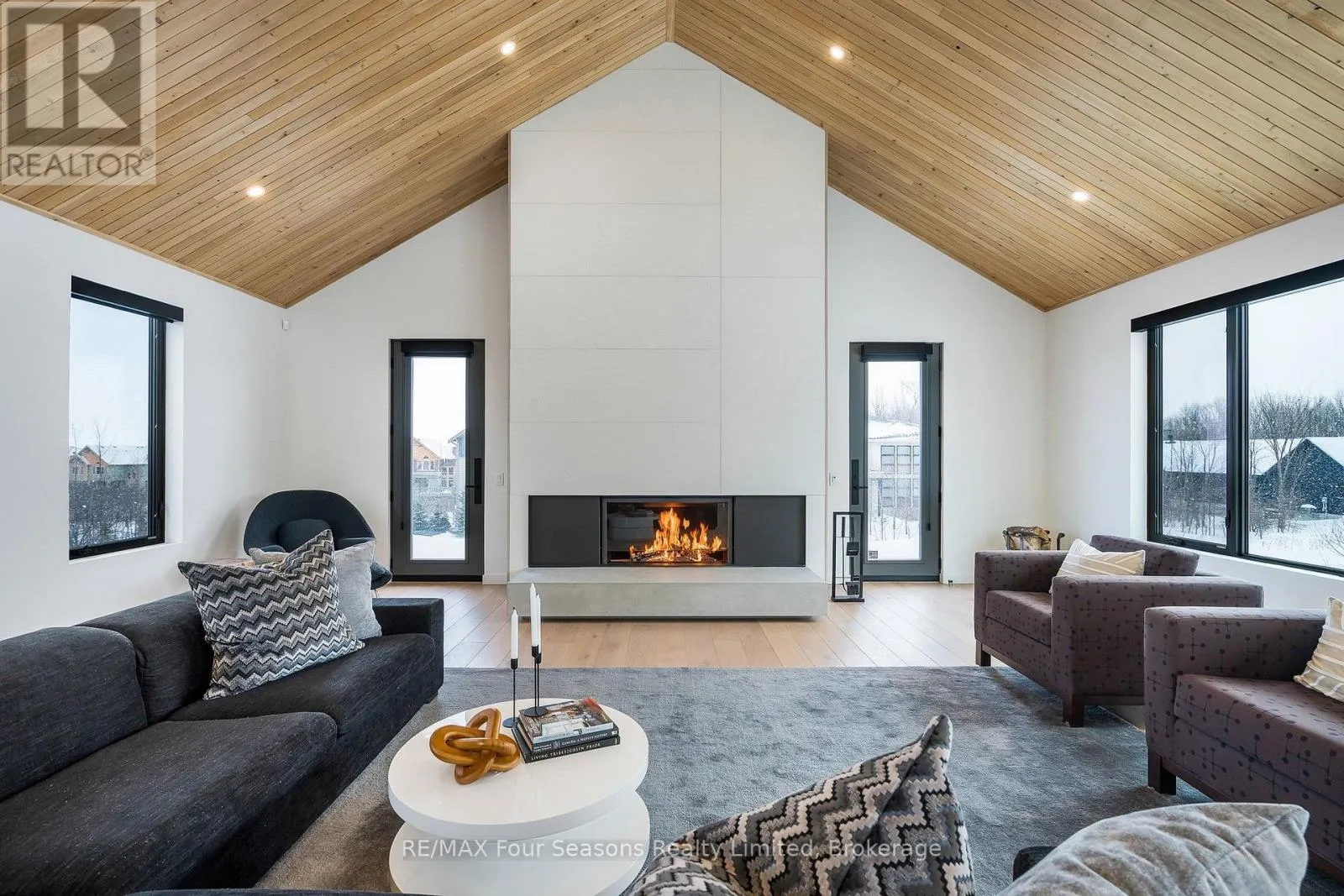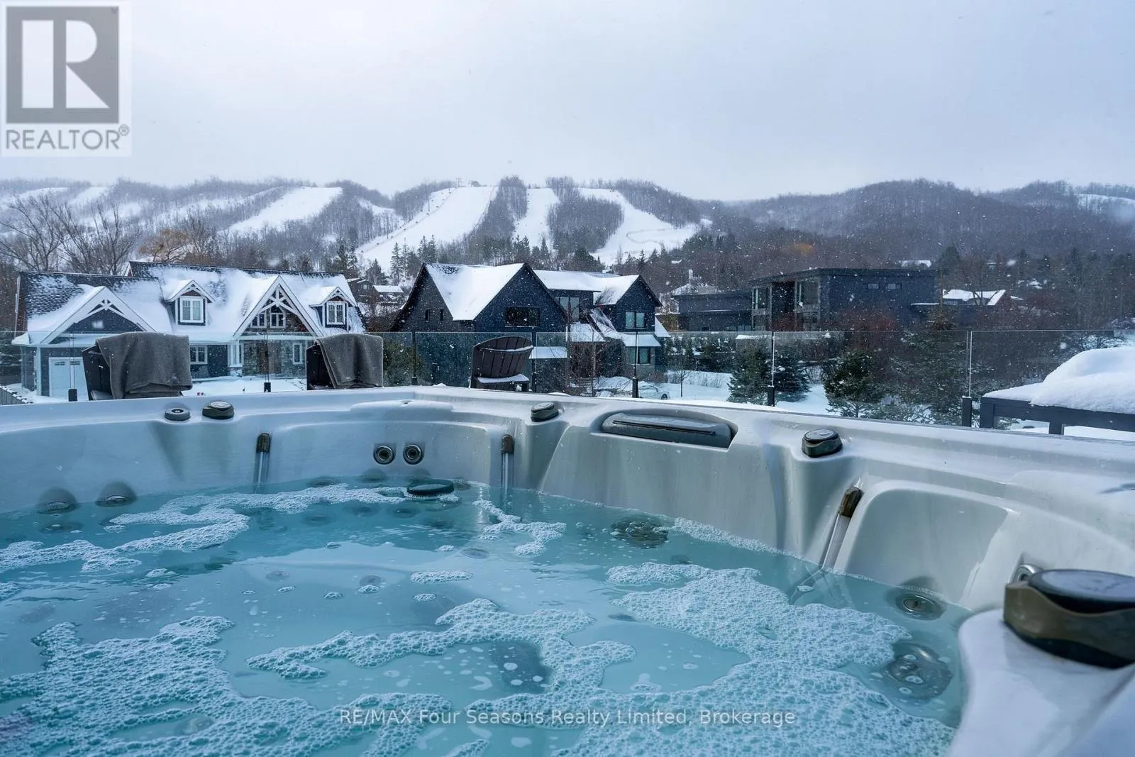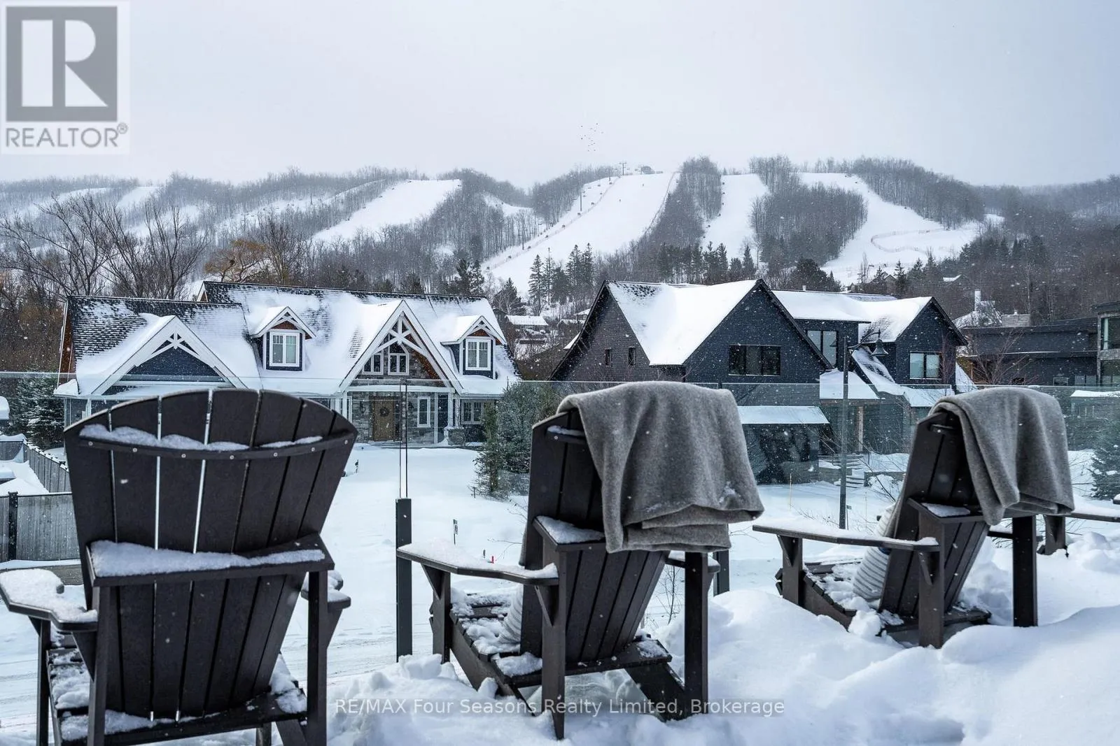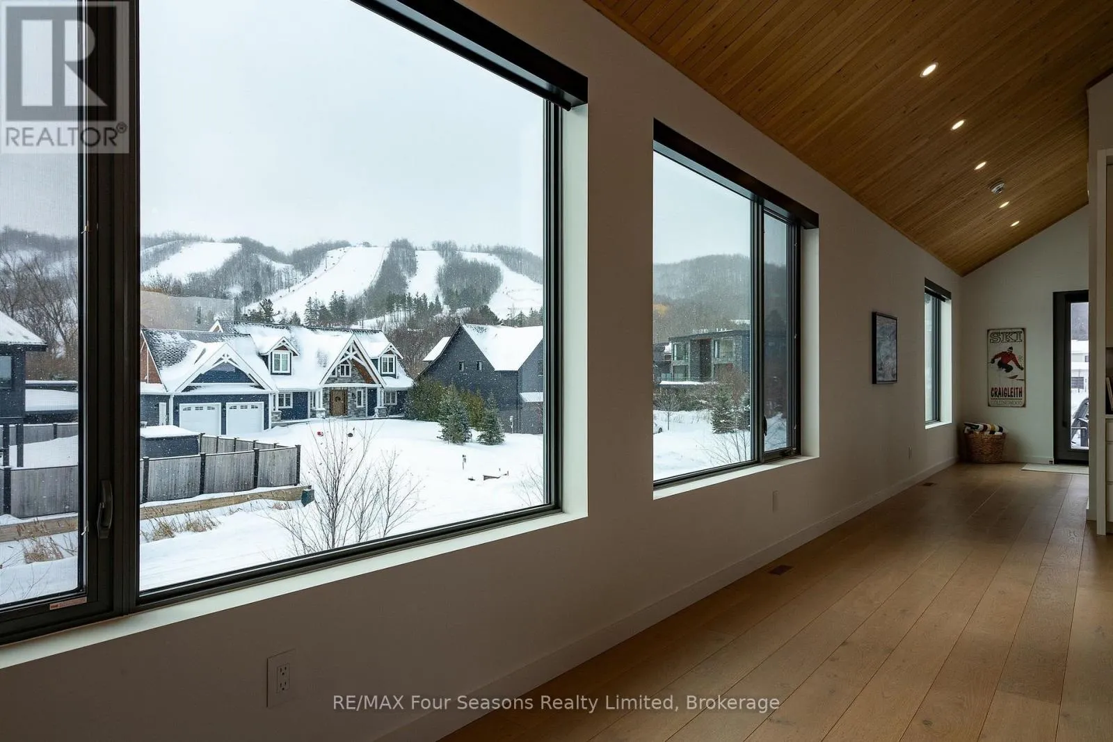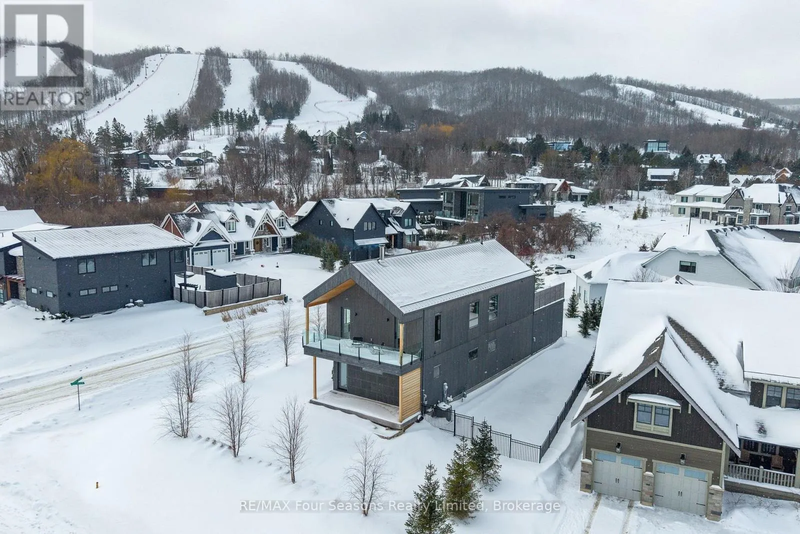 Cross Streets: Sleepy Hollow and Arnot. ** Directions: Arnot Cres to Courchevel. A striking contemporary ski chalet set in the heart of Nipissing Ridge, offering stunning, unobstructed views of the ski hills and Georgian Bay from the great room and multiple decks. Designed and built by Higher Ground Building Corp., this thoughtfully crafted 5-bedroom, 4-bath custom home is made for après-ski gatherings and relaxed mountain living, seamlessly blending modern architecture with classic chalet warmth. The open-concept upper level is designed for entertaining, featuring a showpiece custom kitchen with a dramatic 10-ft quartz island, walk-in pantry ,wet bar, and walk-out to a generous 23' x 23' deck. The great room is anchored by a STÃV wood-burning fireplace and soaring cathedral ceilings clad in vertical Ontario white cedar. Two walk-outs lead to a covered deck and hot tub-perfect for soaking in the hill views by day and the glow of the slopes by night. The main-floor primary suite offers wall-to-wall closet space and a spa-inspired 5-piece ensuite, alongside main-floor laundry and two additional bedrooms, all with heated floors for year-round comfort. The fully finished lower level features polished, radiant in-floor heated concrete throughout, a spacious family and media room ideal for post-ski movie nights, and two additional bedrooms-perfect for family and guests. Located just minutes from Craigleith and Alpine Ski Clubs, Northwinds Beach, Blue Mountain Village, dining, and shopping, this is a rare opportunity to enjoy a true four-season chalet lifestyle in one of the area's most sought-after neighborhoods. (id:27476)