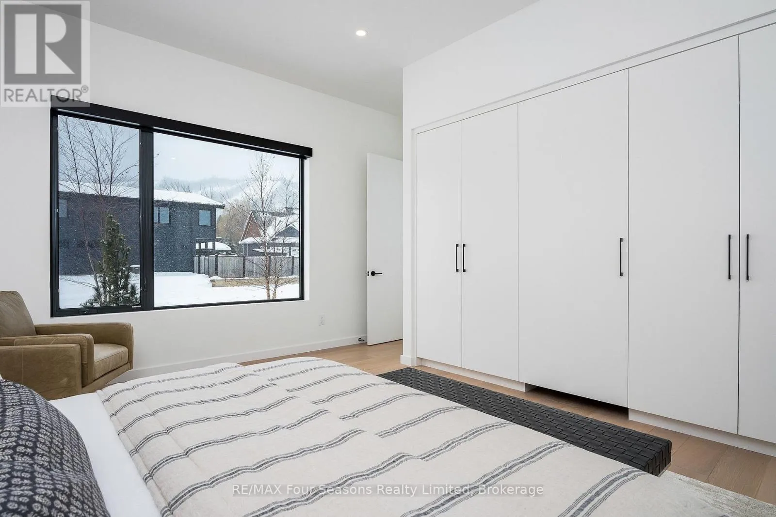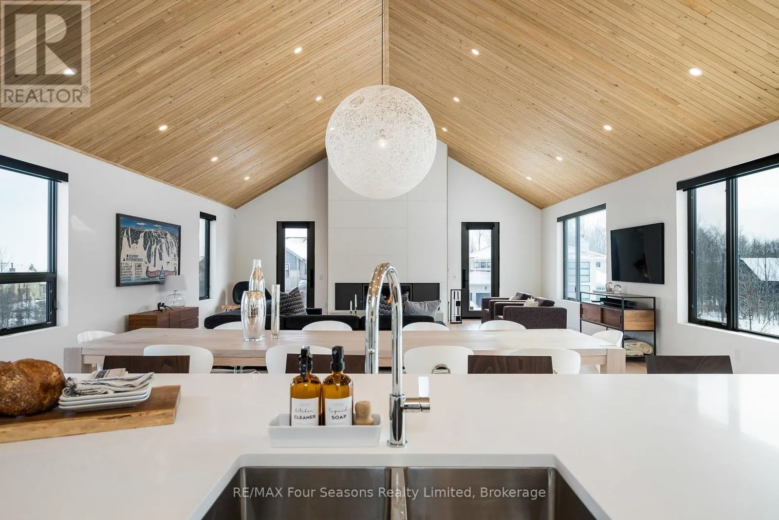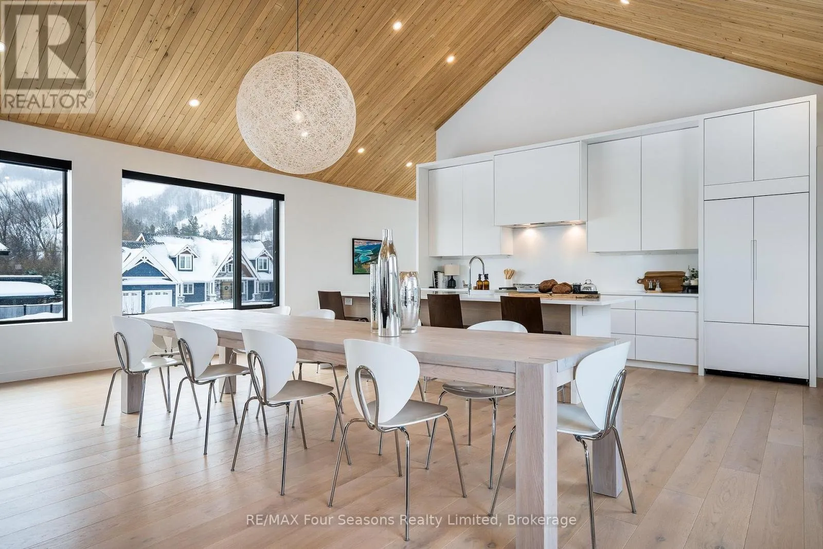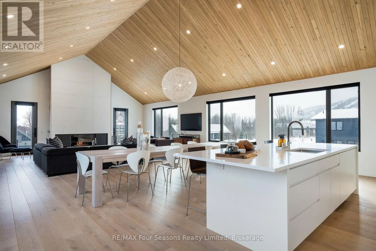 Cross Streets: Sleepy Hollow and Arnot. ** Directions: Arnot Cres to Courchevel. A striking contemporary ski chalet set in the heart of Nipissing Ridge, offering stunning, unobstructed views of the ski hills and Georgian Bay from the great room and multiple decks. Designed and built by Higher Ground Building Corp., this thoughtfully crafted 5-bedroom, 4-bath custom home is made for après-ski gatherings and relaxed mountain living, seamlessly blending modern architecture with classic chalet warmth. The open-concept upper level is designed for entertaining, featuring a showpiece custom kitchen with a dramatic 10-ft quartz island, walk-in pantry ,wet bar, and walk-out to a generous 23' x 23' deck. The great room is anchored by a STÃV wood-burning fireplace and soaring cathedral ceilings clad in vertical Ontario white cedar. Two walk-outs lead to a covered deck and hot tub-perfect for soaking in the hill views by day and the glow of the slopes by night. The main-floor primary suite offers wall-to-wall closet space and a spa-inspired 5-piece ensuite, alongside main-floor laundry and two additional bedrooms, all with heated floors for year-round comfort. The fully finished lower level features polished, radiant in-floor heated concrete throughout, a spacious family and media room ideal for post-ski movie nights, and two additional bedrooms-perfect for family and guests. Located just minutes from Craigleith and Alpine Ski Clubs, Northwinds Beach, Blue Mountain Village, dining, and shopping, this is a rare opportunity to enjoy a true four-season chalet lifestyle in one of the area's most sought-after neighborhoods. (id:27476)
