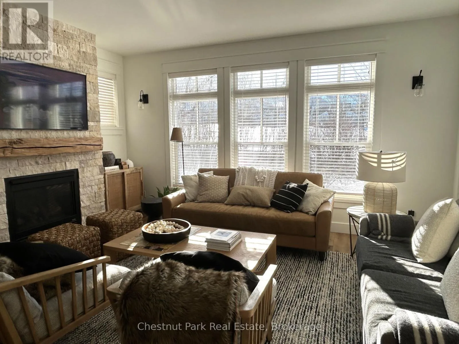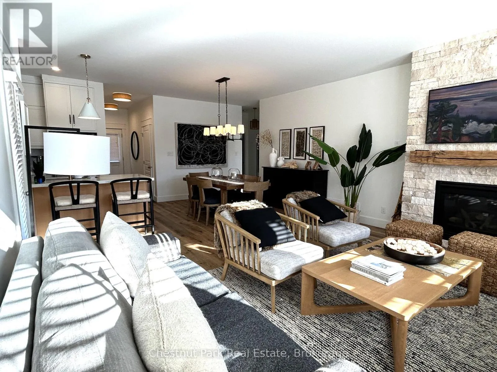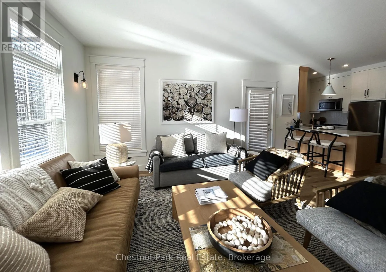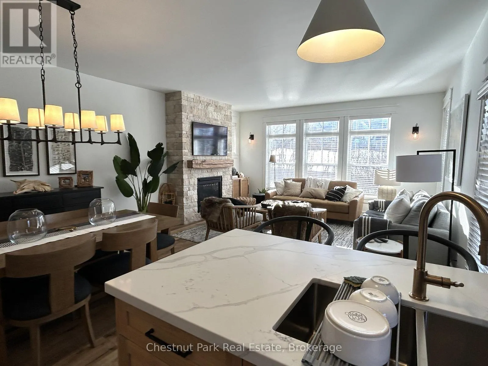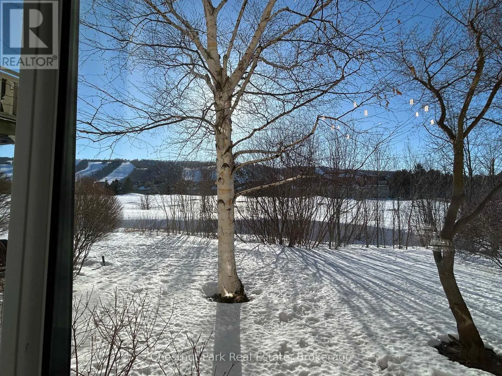 Cross Streets: Jozo Weider and Fairway Court. ** Directions: Grey Rd 19 to Jozo Weider Blvd. to Fairway Court. Welcome to Unit 135 in Rivergrass at Blue, a premium unit in an established development due to its prime location along the Monterra Golf Course. Key Features Include 1) End Unit: Ground floor-no stairs - in one of the most private locations offering direct, year-round views of the ski hills and the golf course. 2) Unmatched Privacy: Located at building's edge, it is surrounded by mature landscaping and trees. Unlike many other units, it does not look out onto a parking lot; its side patio faces nature directly. 3) Exceptional Views: A plethora of windows with direct views of ski hills year-round alongside panoramic golf course vistas. Enjoy the ski hill night lights, seasonal fireworks from the Events Plaza. 4) Professional Interior Design: Exquisite furnishing and decoration, including selections from Restoration Hardware. The open concept is further enhanced by luxury vinyl flooring, upgraded kitchen with high-quality cabinetry, and two fully renovated bathrooms. Both bedrooms are equipped with king-size beds, ample closet space, plus pull out in living room providing accommodation for up to 6 and catering to high-end comfort for owners and guests. 5) Investment Potential: While currently maintained as a personally cared-for, non-rented property, Rivergrass allows for Short Term Accommodation (STA), providing significant revenue potential for investors. 6) Year-Round Recreation: The development includes a seasonal outdoor swimming pool and a year-round hot tub with scenic views of the escarpment and 18th hole of Monterra Golf. 7) Convenience & Access: Complimentary shuttle service available to transport residents and guests to the Village or to the Blue Mountain Private Beach. On site is a dedicated ski and bike tuning room for active enthusiasts. Situated just a short walk from the core of Blue Mountain Village, providing easy access to dining, shopping and entertainment. HST may be applicable. 1% BMVA Entry Fee on closing. Annual fees $0.28/sq.ft. (id:27476)