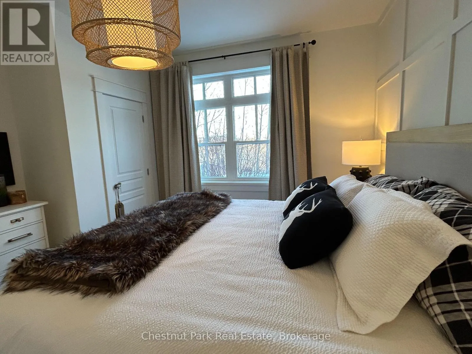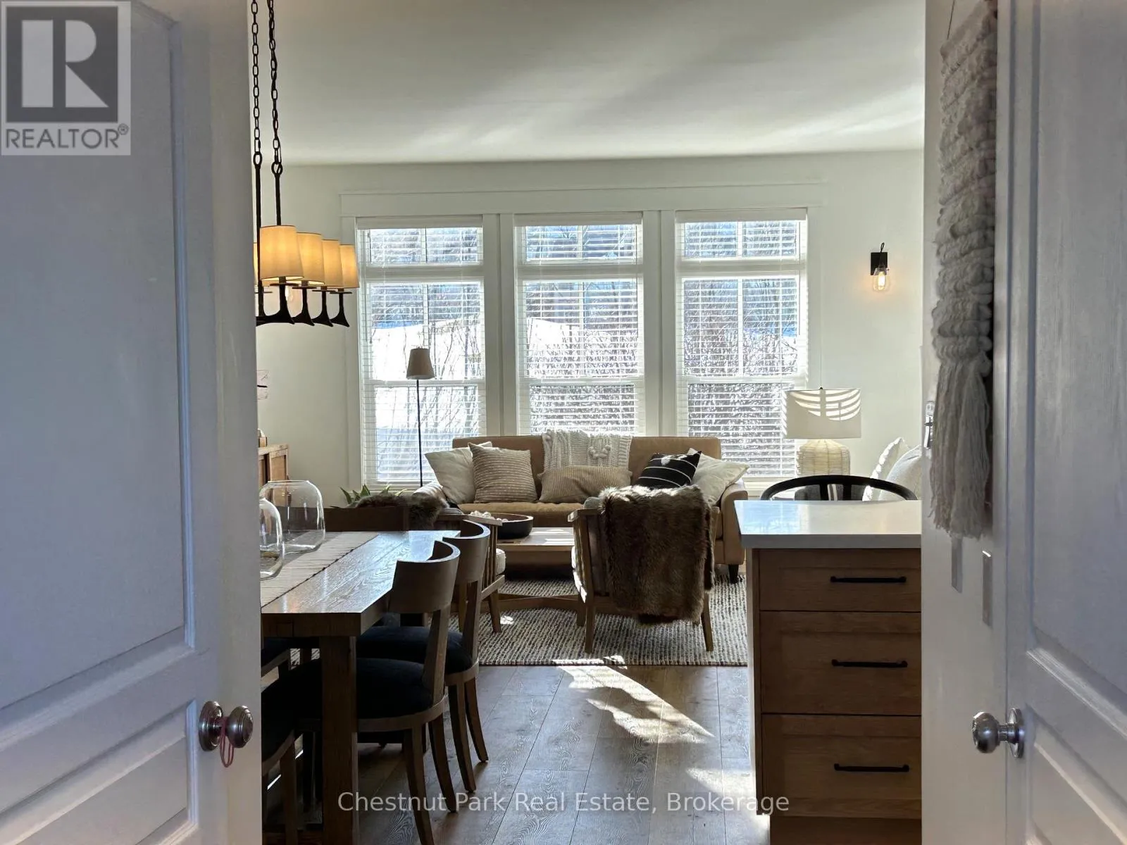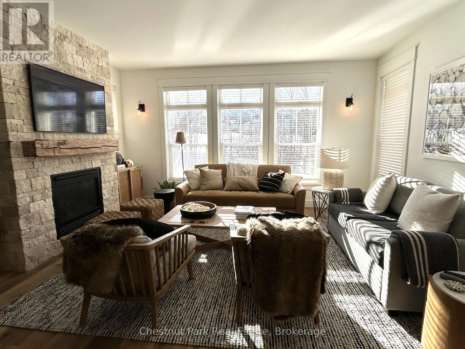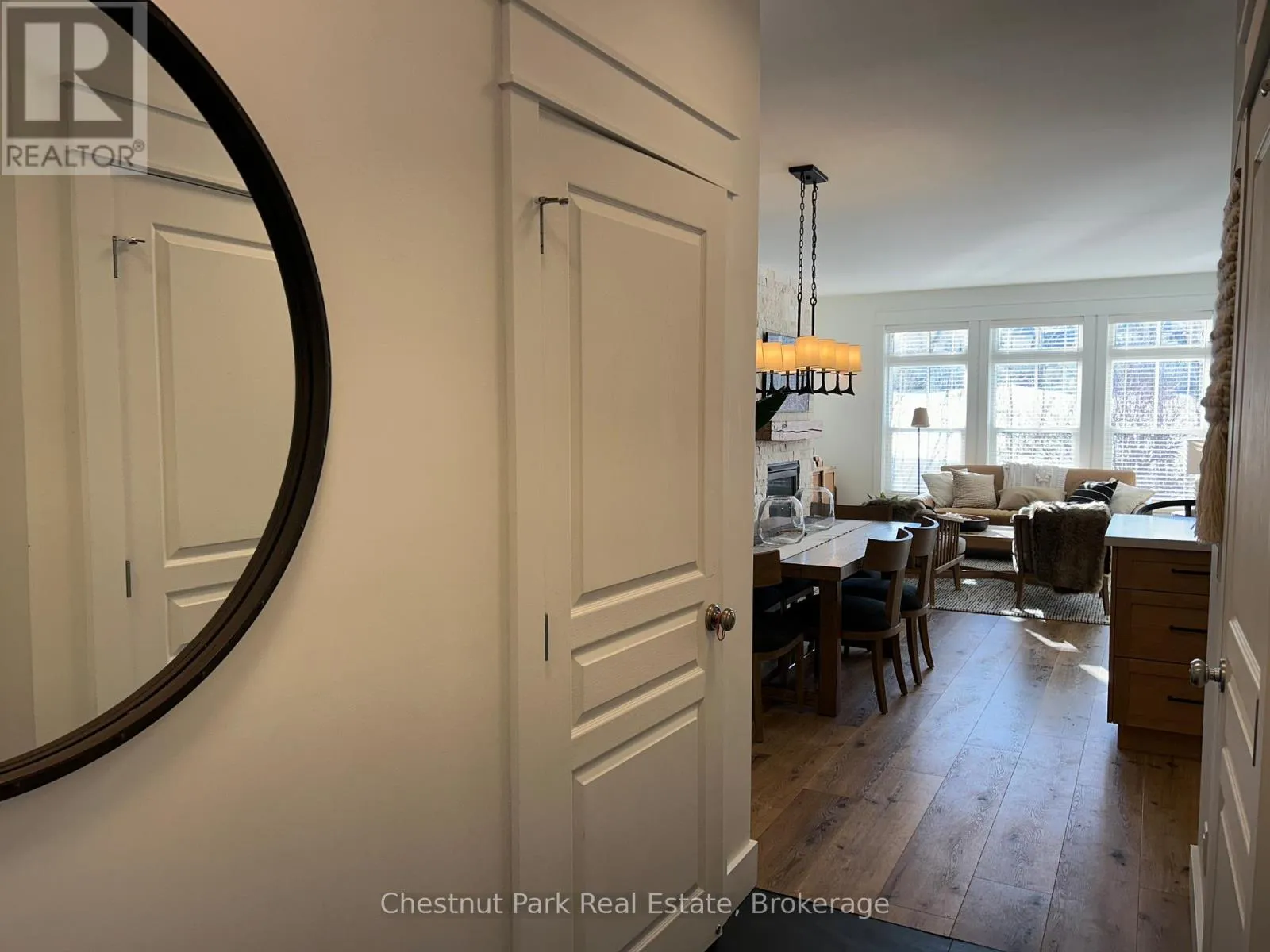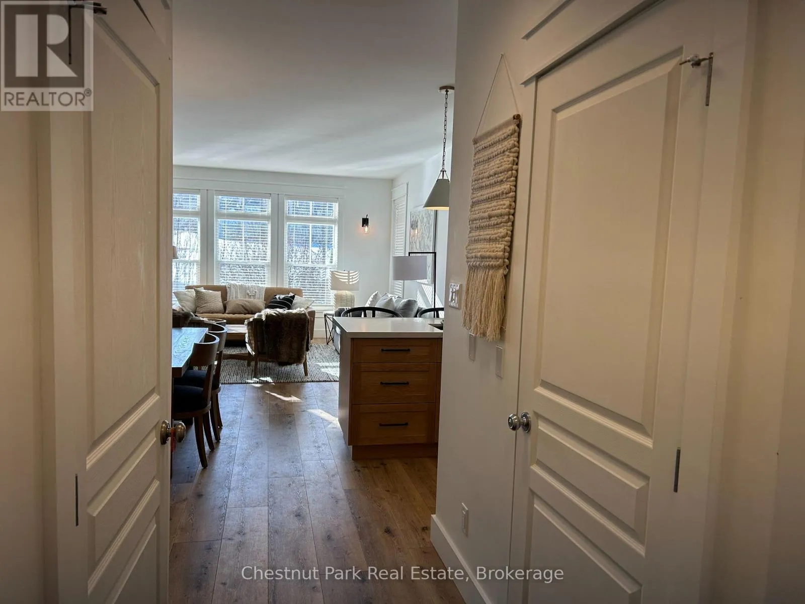 Cross Streets: Jozo Weider and Fairway Court. ** Directions: Grey Rd 19 to Jozo Weider Blvd. to Fairway Court. Welcome to Unit 135 in Rivergrass at Blue, a premium unit in an established development due to its prime location along the Monterra Golf Course. Key Features Include 1) End Unit: Ground floor-no stairs - in one of the most private locations offering direct, year-round views of the ski hills and the golf course. 2) Unmatched Privacy: Located at building's edge, it is surrounded by mature landscaping and trees. Unlike many other units, it does not look out onto a parking lot; its side patio faces nature directly. 3) Exceptional Views: A plethora of windows with direct views of ski hills year-round alongside panoramic golf course vistas. Enjoy the ski hill night lights, seasonal fireworks from the Events Plaza. 4) Professional Interior Design: Exquisite furnishing and decoration, including selections from Restoration Hardware. The open concept is further enhanced by luxury vinyl flooring, upgraded kitchen with high-quality cabinetry, and two fully renovated bathrooms. Both bedrooms are equipped with king-size beds, ample closet space, plus pull out in living room providing accommodation for up to 6 and catering to high-end comfort for owners and guests. 5) Investment Potential: While currently maintained as a personally cared-for, non-rented property, Rivergrass allows for Short Term Accommodation (STA), providing significant revenue potential for investors. 6) Year-Round Recreation: The development includes a seasonal outdoor swimming pool and a year-round hot tub with scenic views of the escarpment and 18th hole of Monterra Golf. 7) Convenience & Access: Complimentary shuttle service available to transport residents and guests to the Village or to the Blue Mountain Private Beach. On site is a dedicated ski and bike tuning room for active enthusiasts. Situated just a short walk from the core of Blue Mountain Village, providing easy access to dining, shopping and entertainment. HST may be applicable. 1% BMVA Entry Fee on closing. Annual fees $0.28/sq.ft. (id:27476)