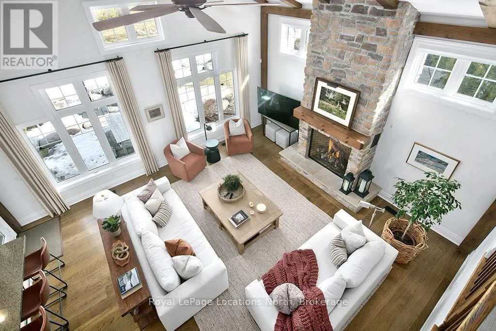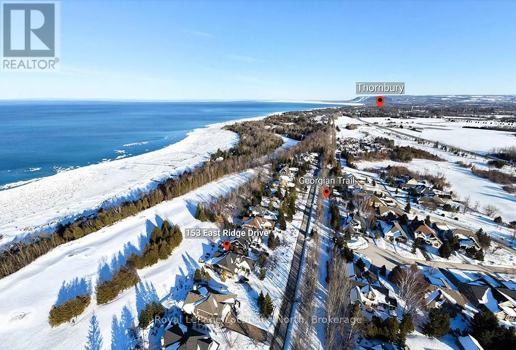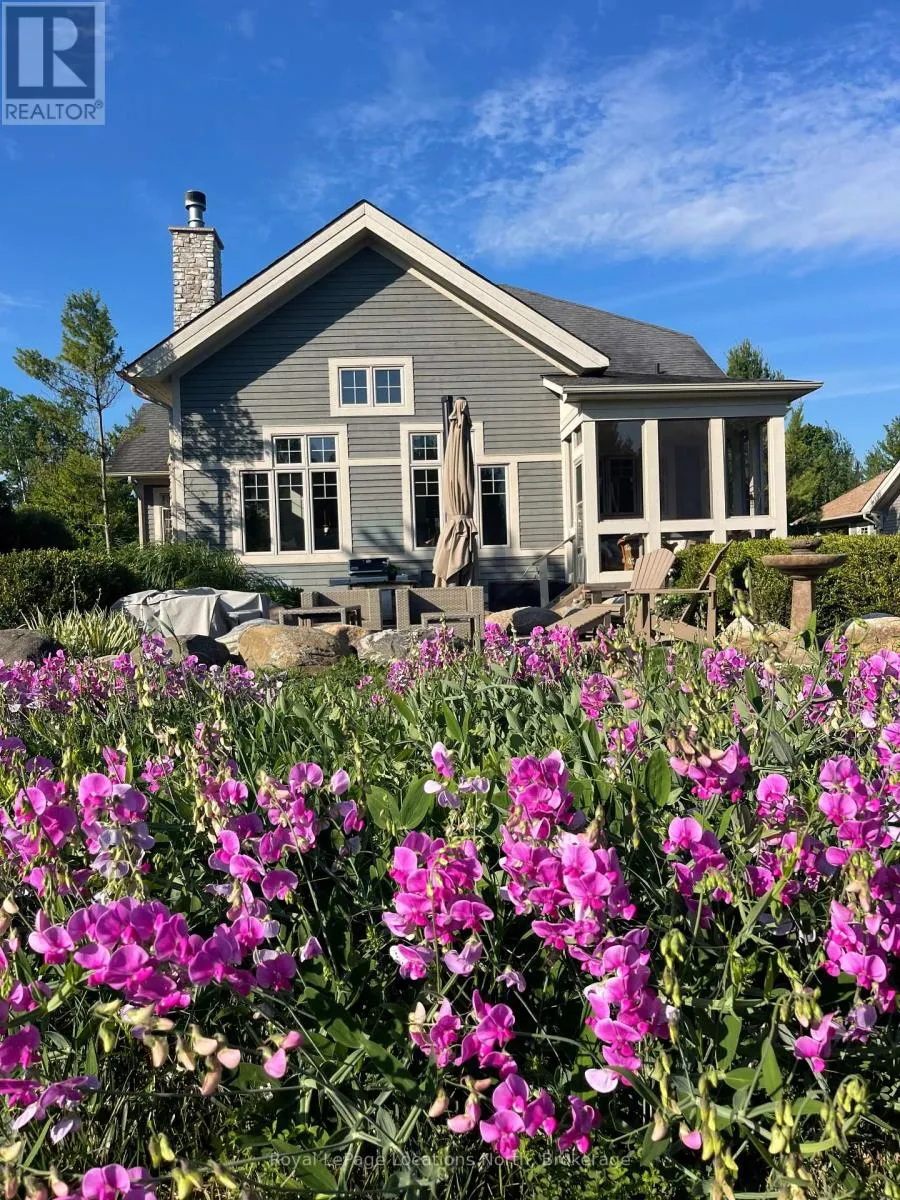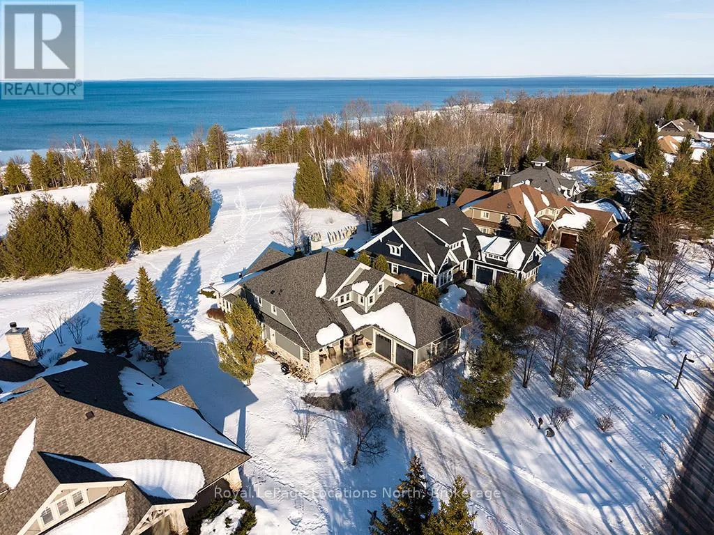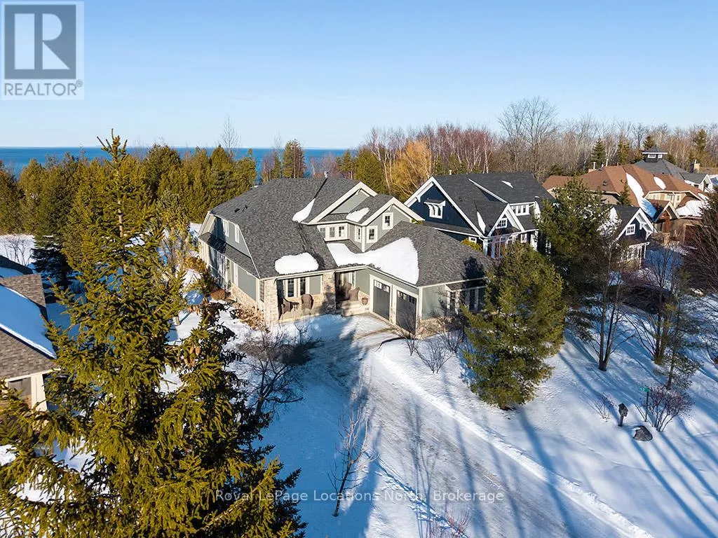 Cross Streets: East Ridge Drive & Rankins Crescent. ** Directions: Hwy 26 to Lora Bay Drive, Take 1st Exit onto East Ridge Drive. Follow ER Drive to SIGN. Located on one of the most coveted streets in the Lora Bay community, Welcome to East Ridge Drive. Meandering through the east side of the neighbourhood, this quiet, tree-lined street is framed by mature gardens, parkettes, and direct access to the Bruce Trail. Residents enjoy Lora Bay's exceptional amenities, including a championship golf course, private beach on Georgian Bay, state-of-the-art fitness facility, clubhouse, and an active social calendar. This custom home sits on one of the finest lots on East Ridge, offering remarkable privacy while capturing expansive views of both the golf course and Georgian Bay. The professionally landscaped outdoor space features mature trees and gardens, open green space, and swoon-worthy views that change beautifully with the seasons. Inside, the heart of the home is the stunning great room, highlighted by wood beams, a floor-to-ceiling stone fireplace, and a wall of windows designed to showcase the breathtaking scenery East Ridge is known for. A Muskoka room seamlessly extends your living space, allowing you to enjoy the outdoors through every season. The kitchen offers ample storage and prep space for the chef, complete with bar seating for three, while the dining room seats eight or more-ideal for entertaining. The romantic primary suite features serene outdoor views, a five-piece ensuite, and a walk-in closet. A full bathroom, sun-soaked office, and mudroom/laundry complete the main level. Upstairs, two generous bedrooms share a four-piece bath, perfect for guests. The fully finished lower level offers a welcoming rec room, two additional bedrooms, and a three-piece bathroom-ideal for family and entertaining. Plenty of storage is found throughout, including an attached two-car garage with inside access. Updates include a new roof (2025), furnace w heat pump (2024), exterior painting (2024), EV Charger & new hardwood flooring. This is an exceptional opportunity to live the Lora Bay lifestyle from a truly spectacular home. (id:27476)